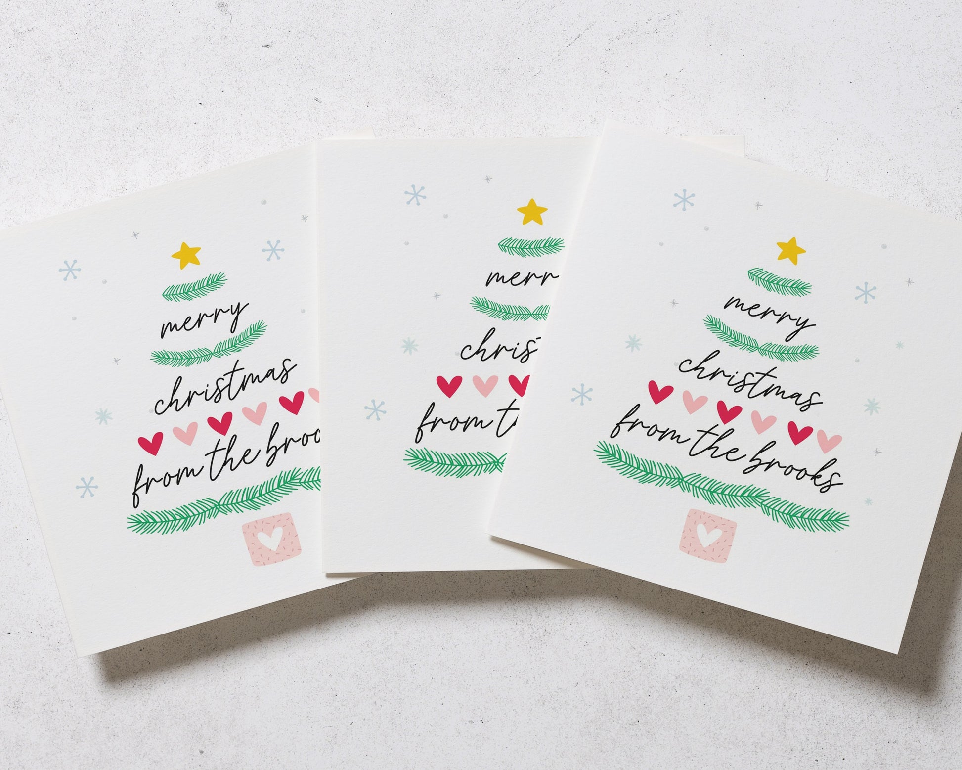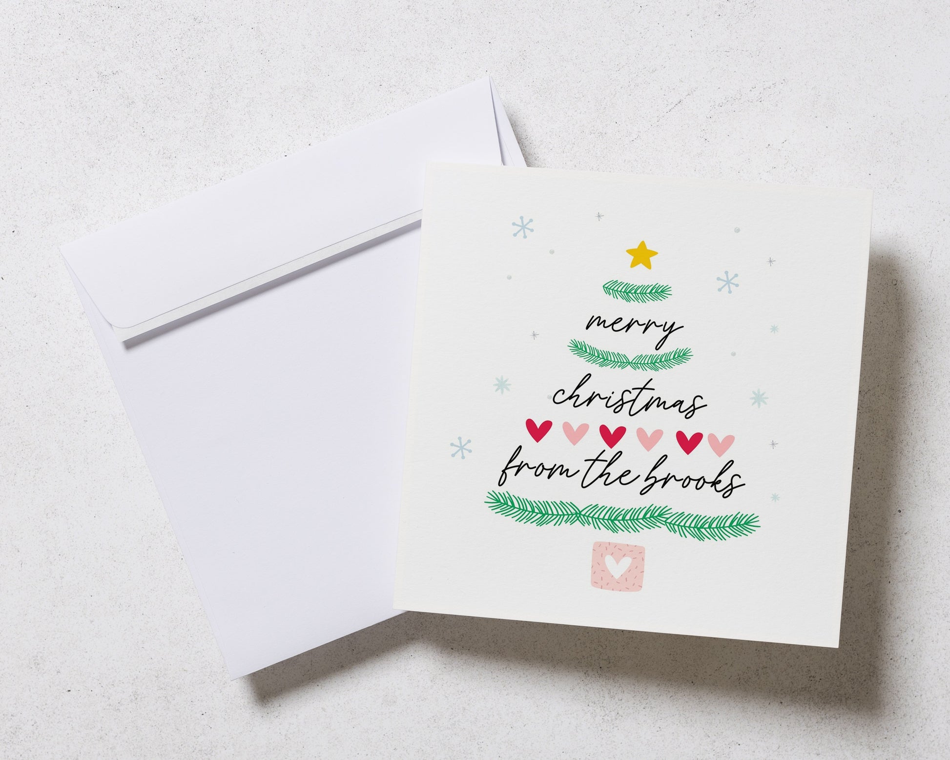 This charming personalised Christmas card features a festive tree design with your family name, perfect for spreading holiday cheer.