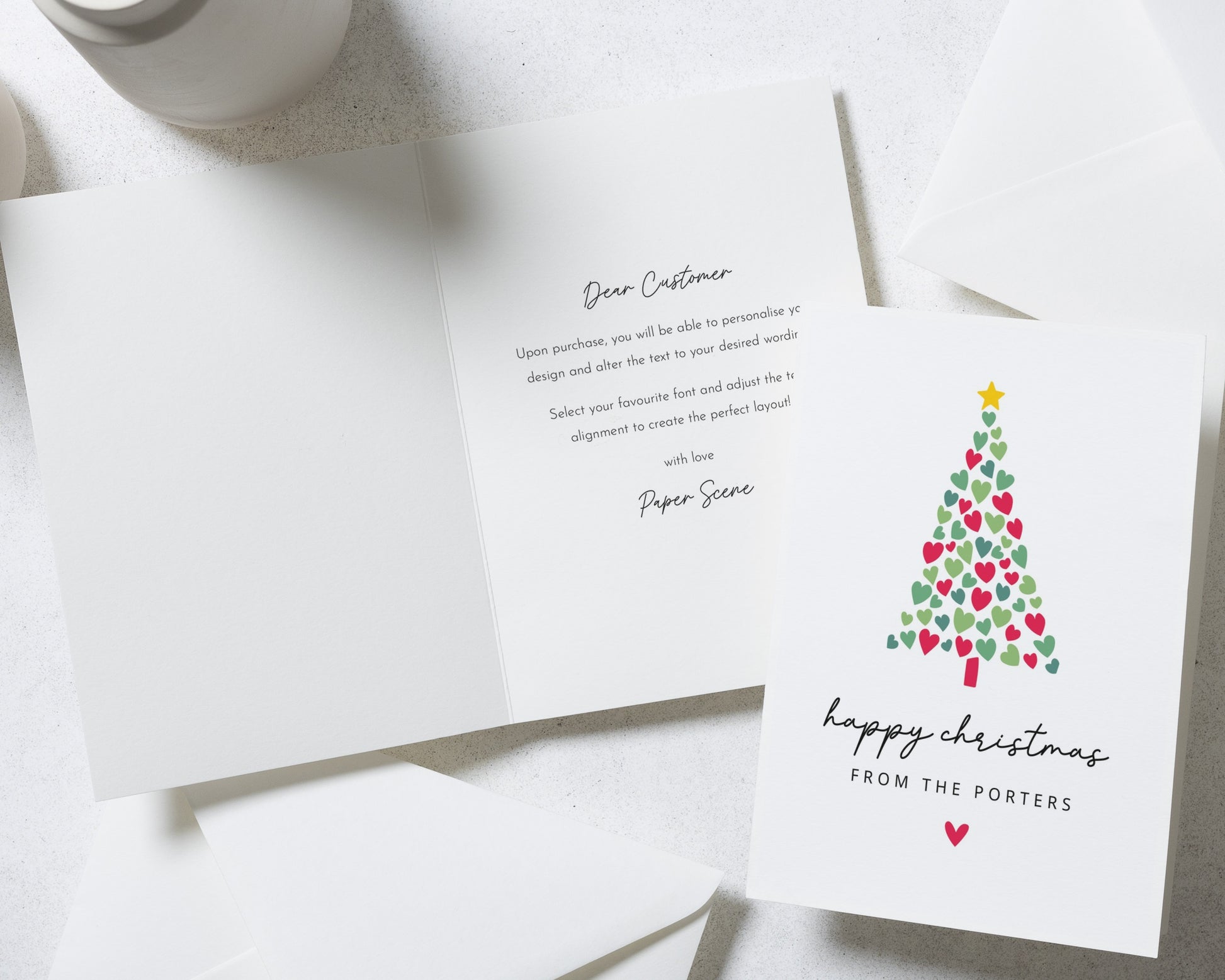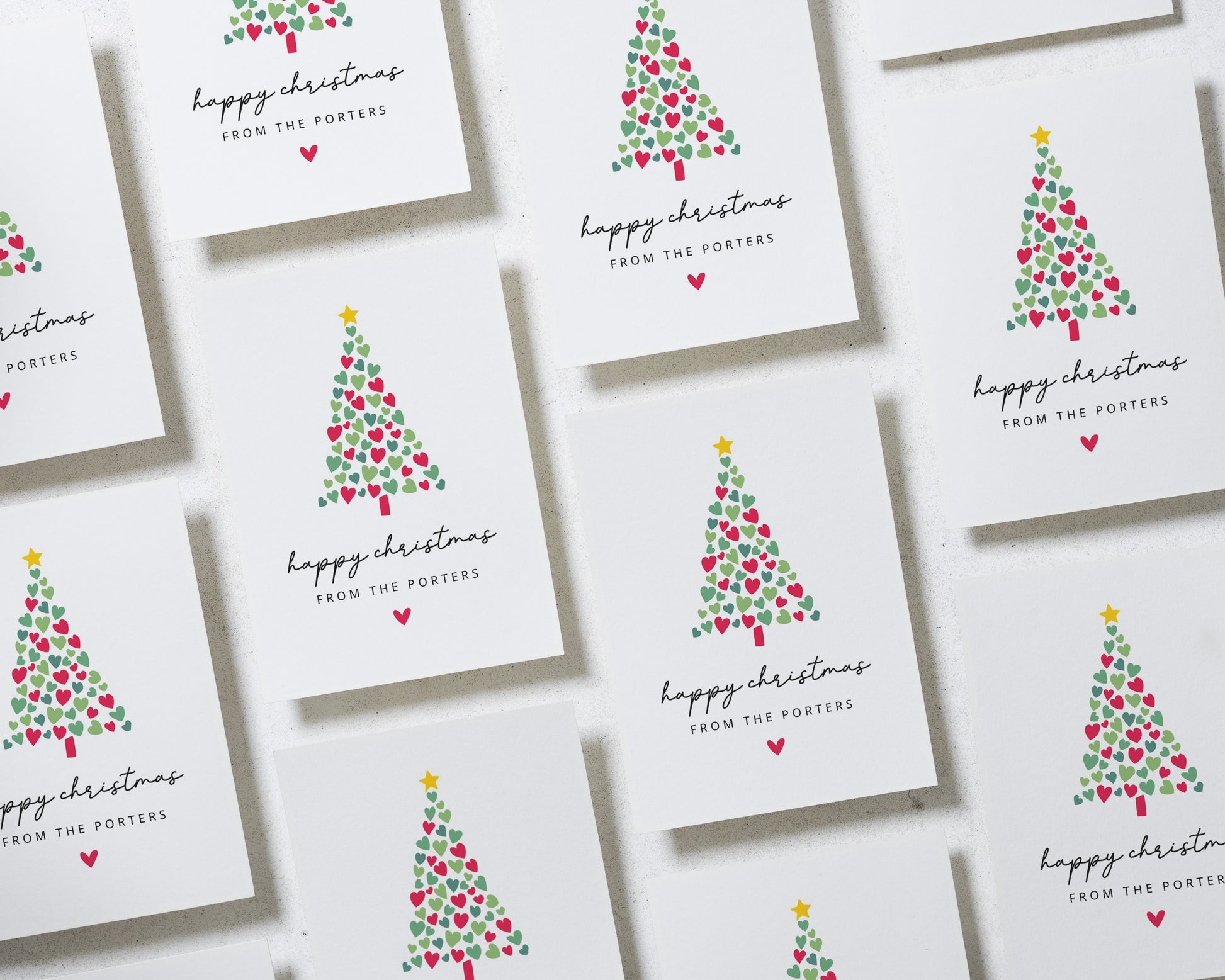 A charming personalised Christmas card featuring a festive tree made of colourful hearts. Add your family name for a special touch.