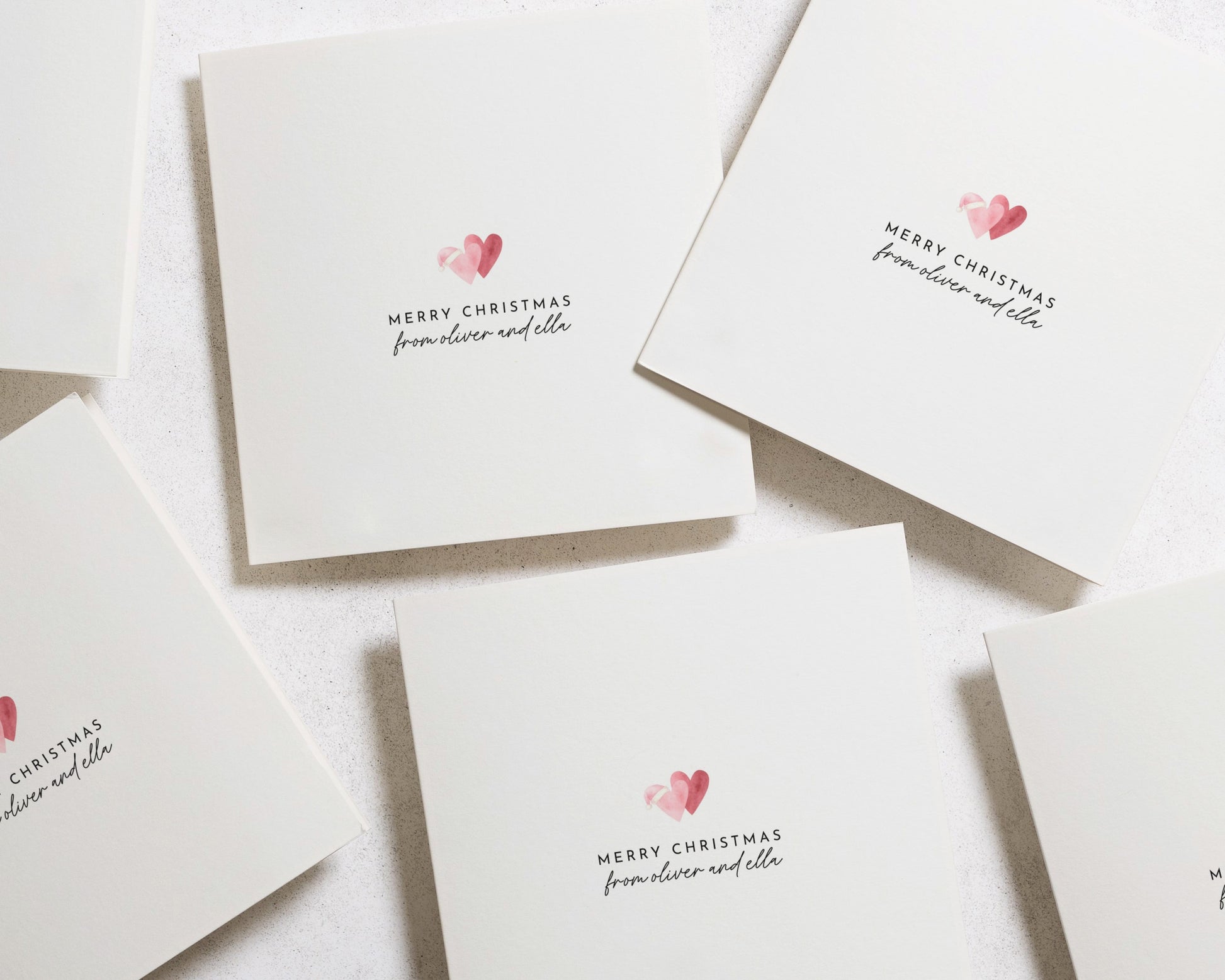 A beautifully minimalist personalised square Christmas card featuring two soft pink hearts and your custom names beneath 'Merry Christmas'. Perfect for a modern festive greeting.