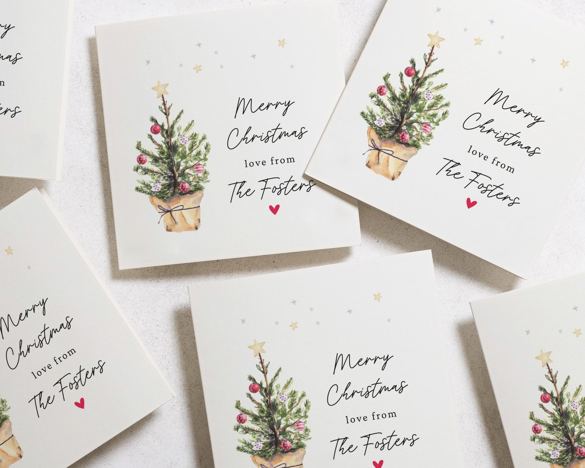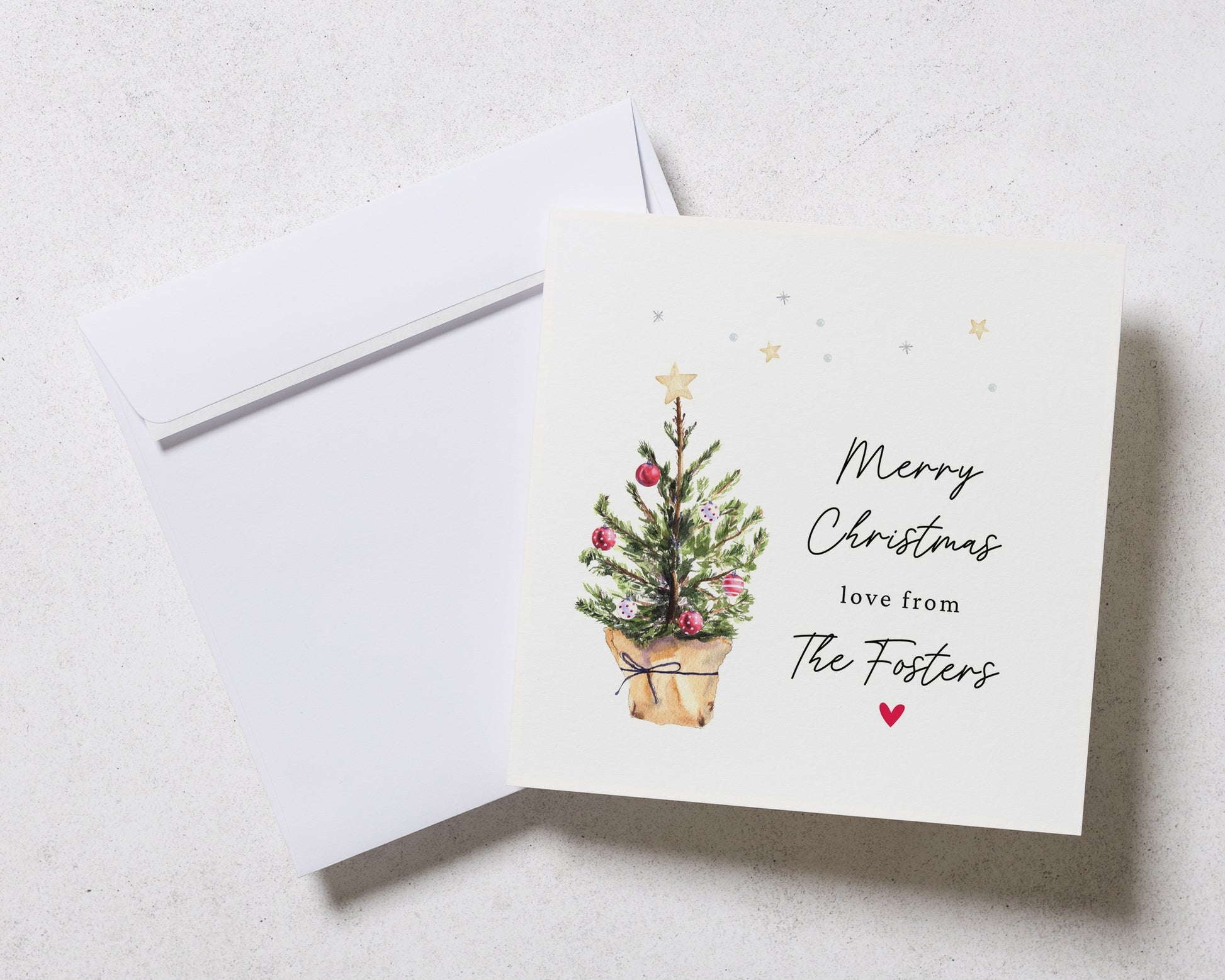 A charming personalised square Christmas card featuring a festive tree illustration and your family name. Perfect for sending holiday cheer.