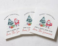 Celebrate the festive season with this personalised square Christmas card featuring a cheerful Santa, Christmas tree, and your custom family name.