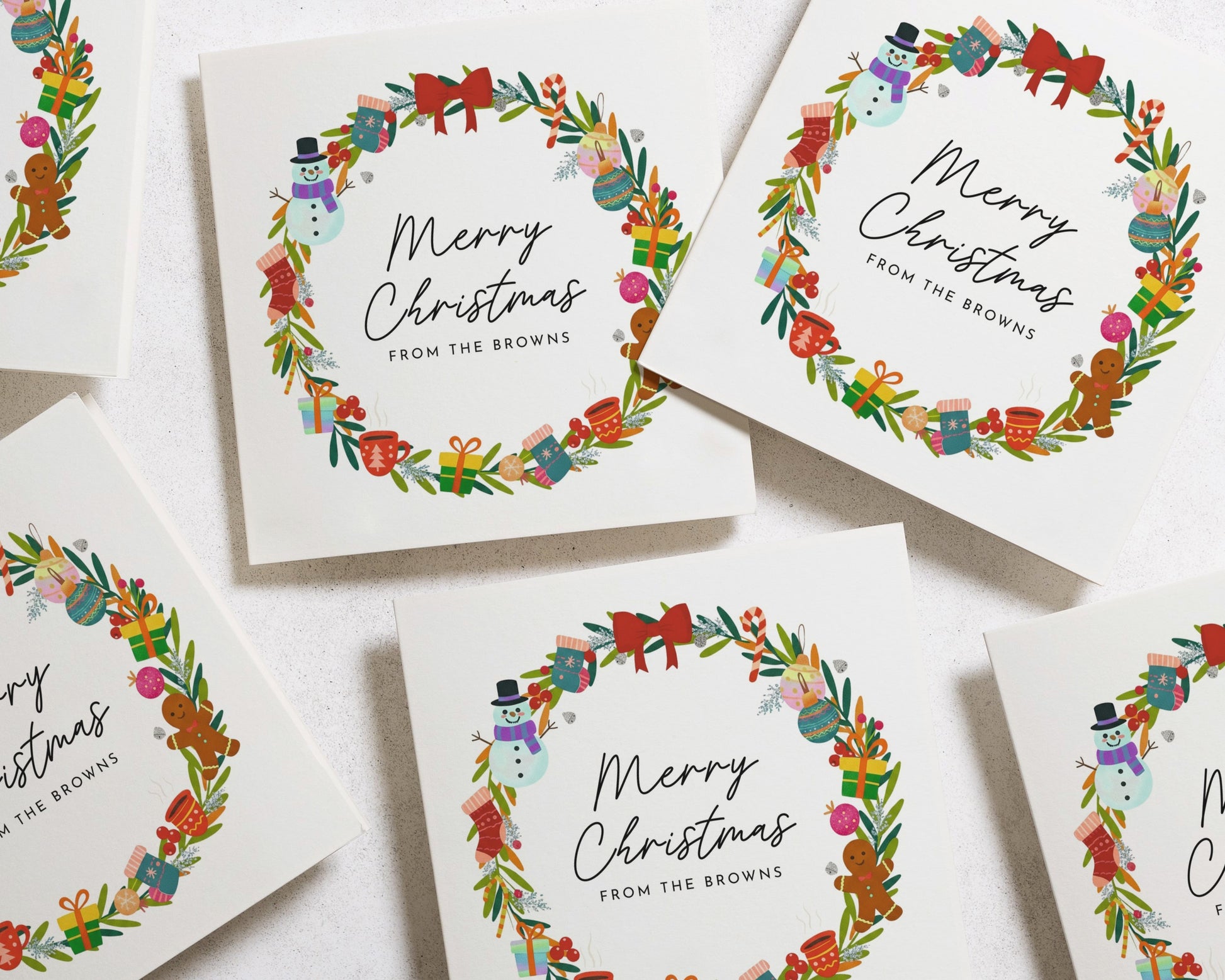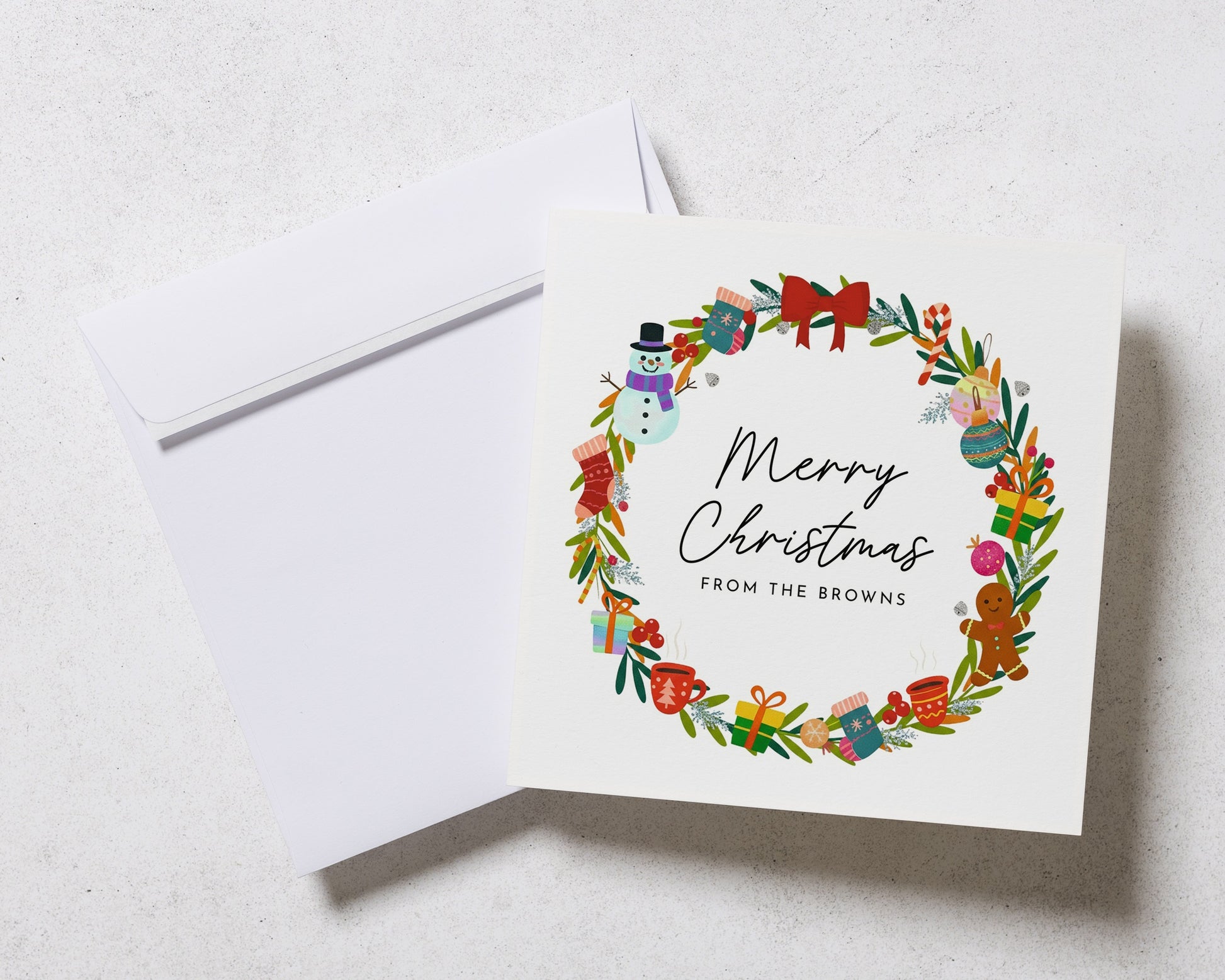 Send festive cheer with this personalised Christmas card featuring a colourful wreath of gifts, gingerbread, and a snowman. Add your family name for a special touch.