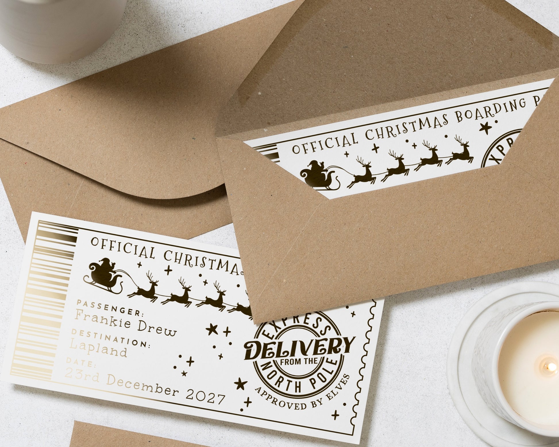 Personalised Christmas Gift Voucher, North Pole Express Ticket, Gold Foil, Christmas Boarding Pass, Gift For Kids