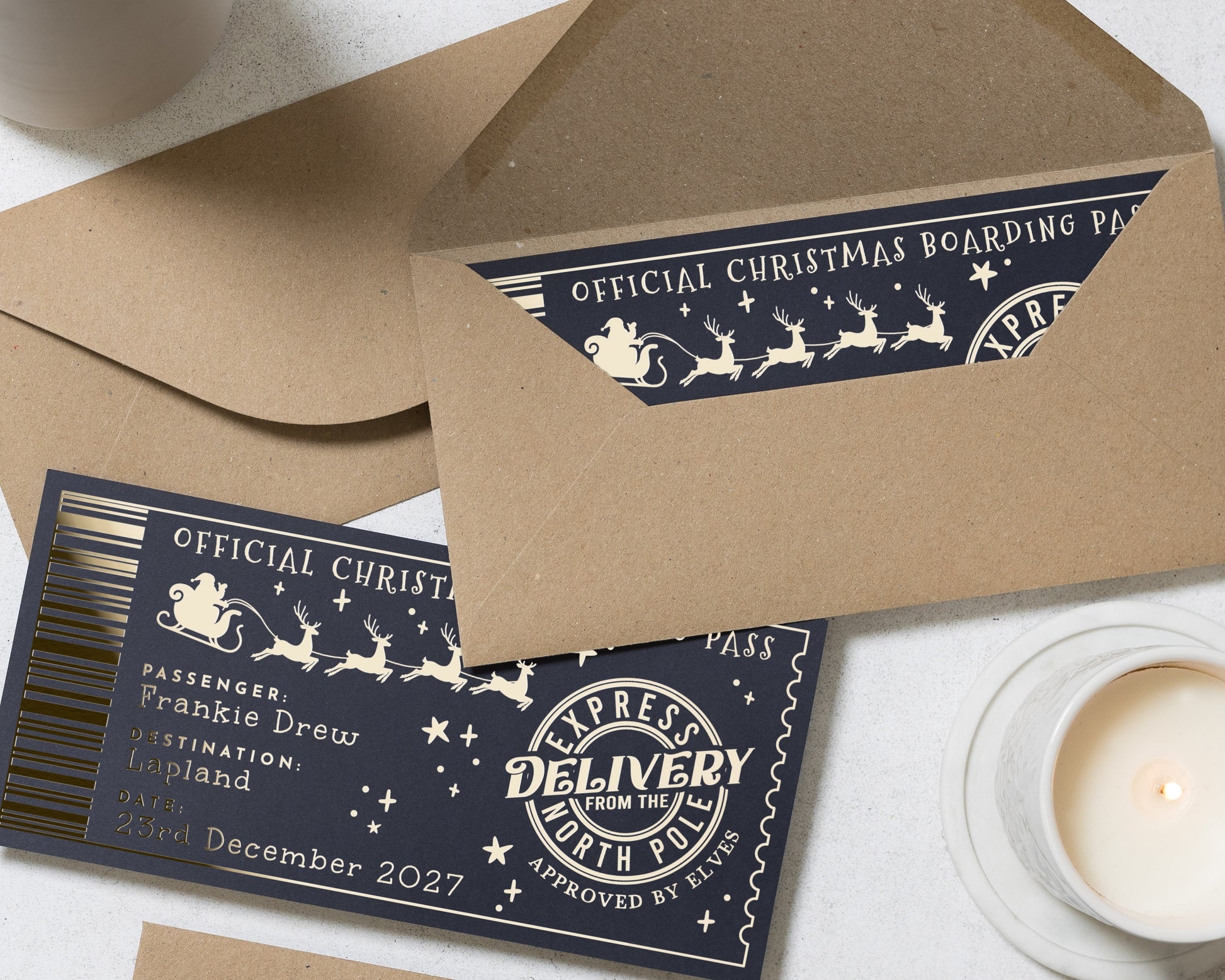 Make Christmas magical with this personalised North Pole Express boarding pass! Featuring stunning gold foil on black, this ticket is perfect for gifting children a special festive experience.