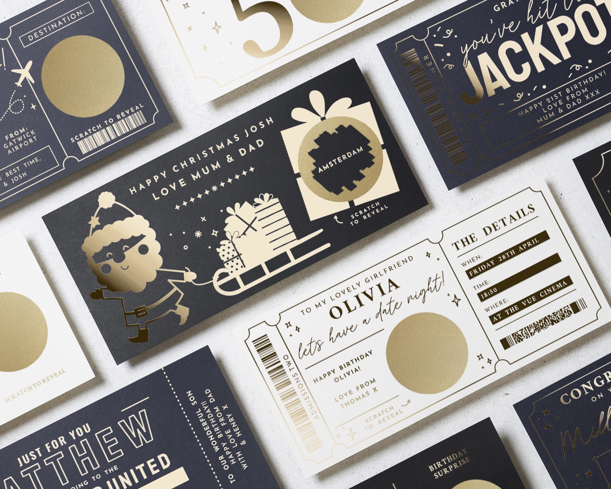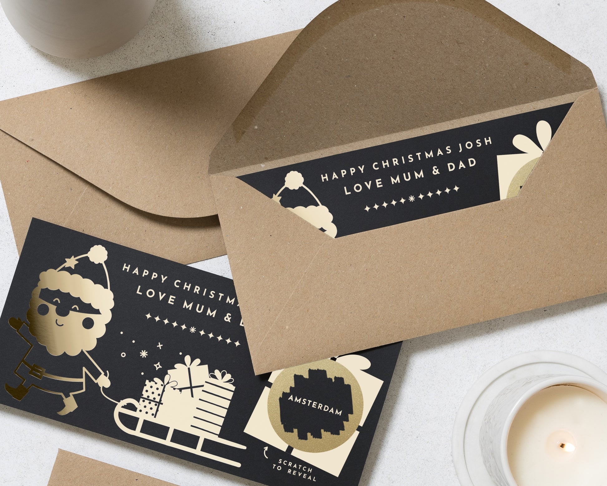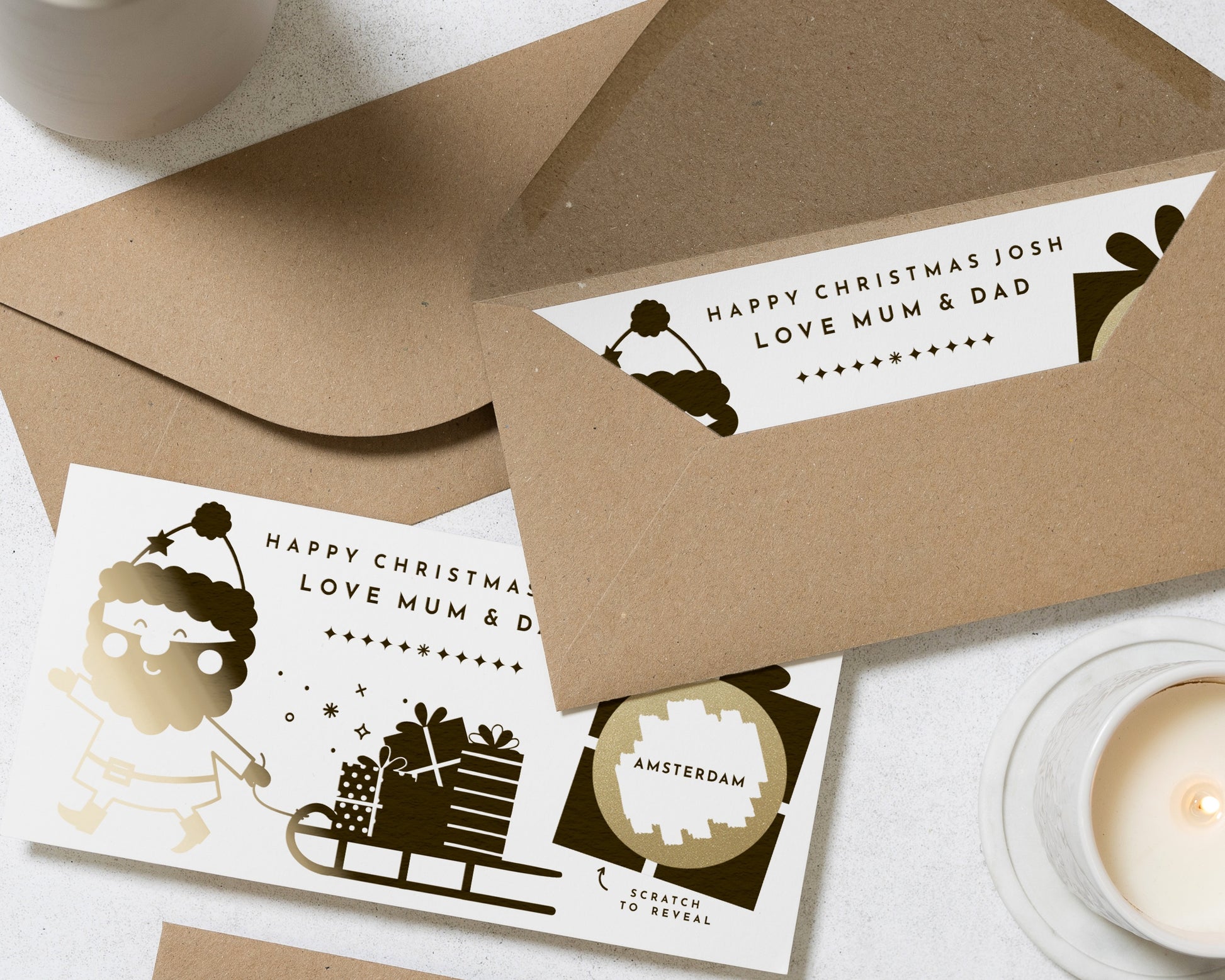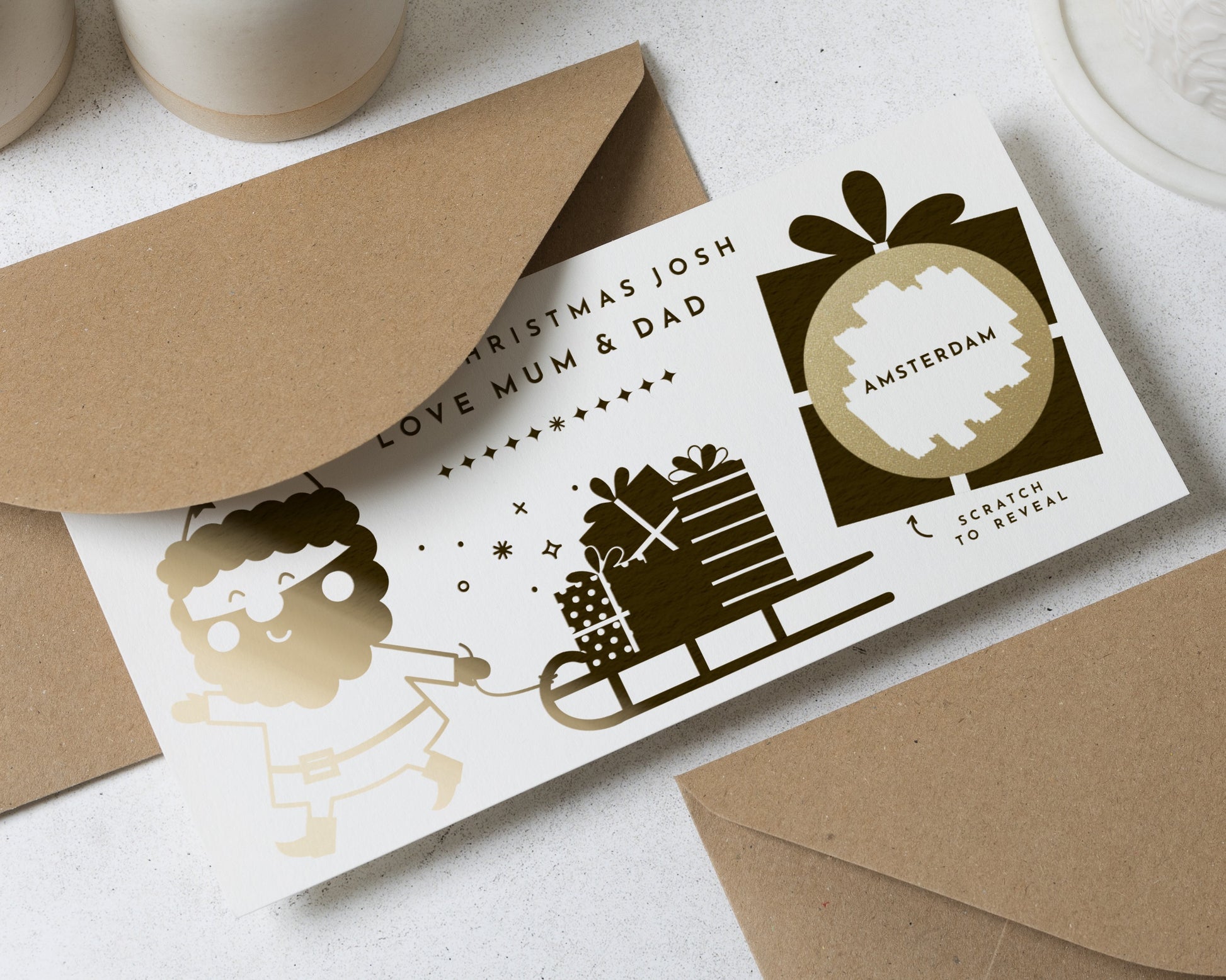 Surprise your loved one with this personalised Christmas gift voucher featuring a gold foil Santa and scratch to reveal holiday destination. Perfect for gifting a magical trip or experience, this custom voucher adds excitement to your festive celebrations.