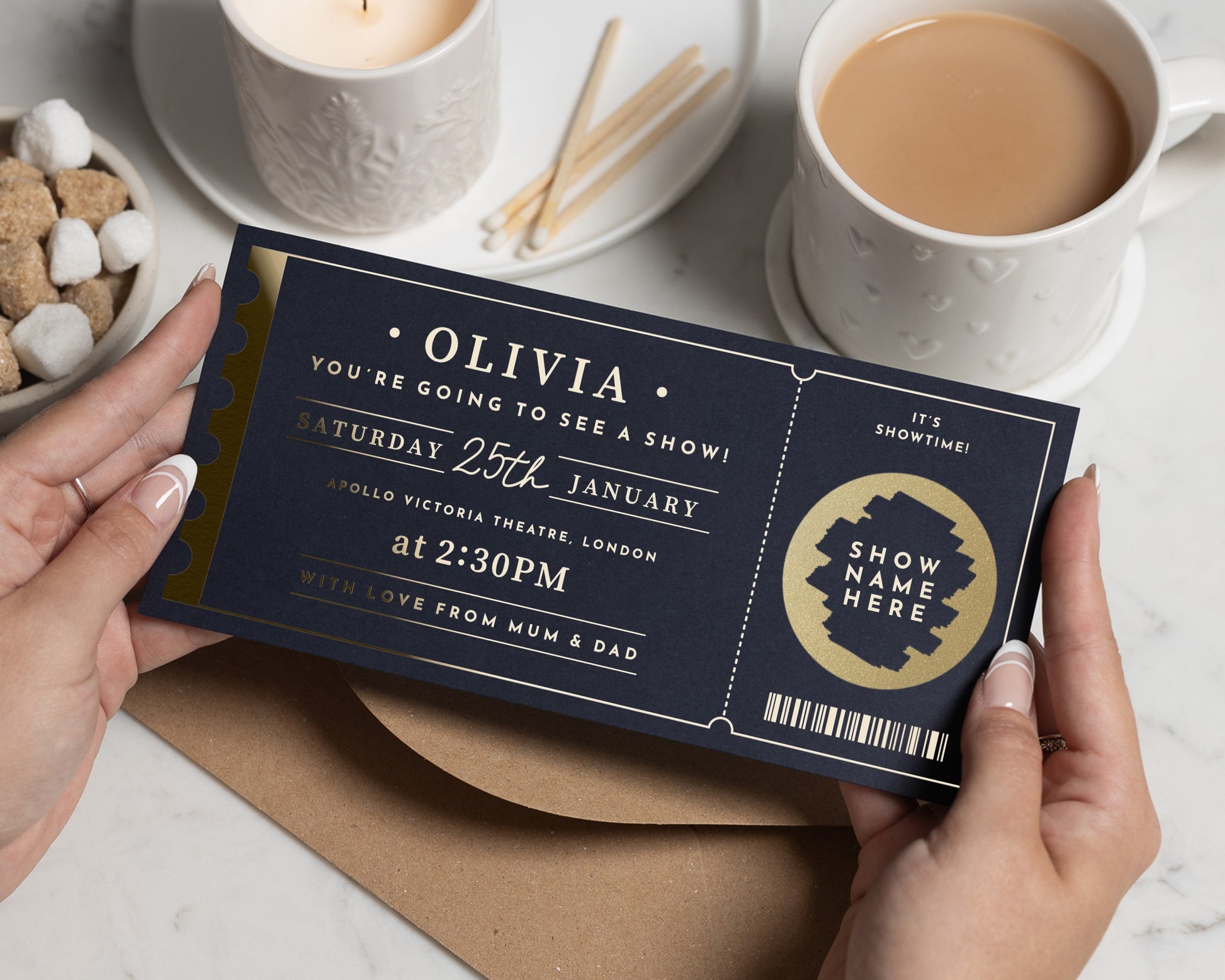 Surprise someone special with a personalised theatre ticket gift voucher, featuring elegant gold foil and a scratch to reveal show name panel.