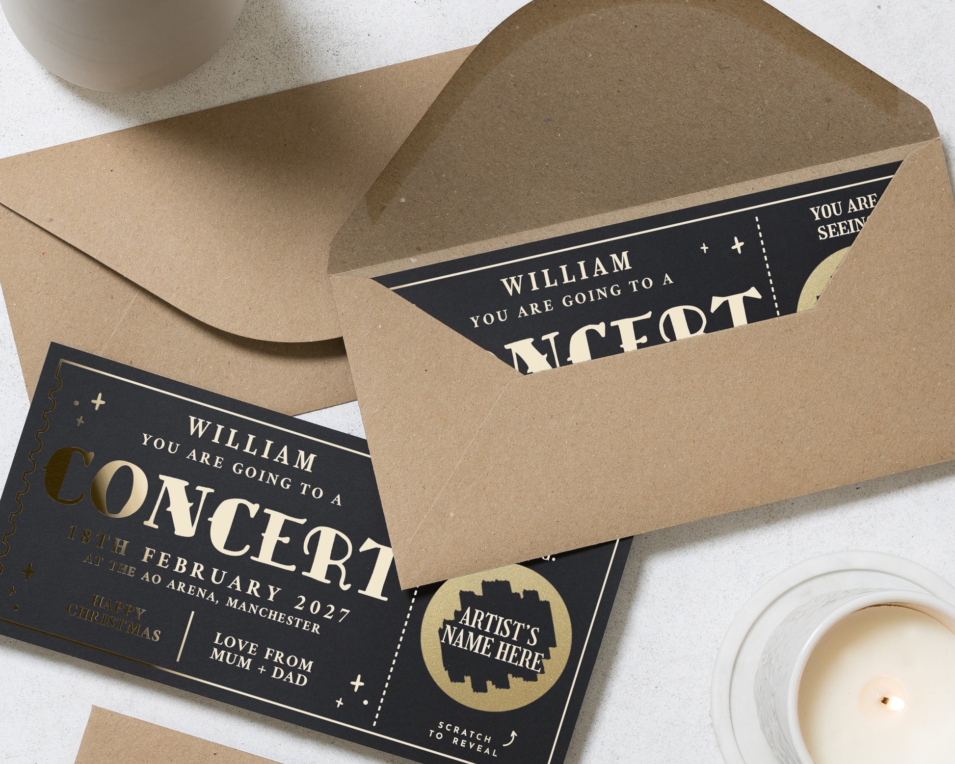 Surprise someone special with this personalised gold foil concert ticket gift voucher. Scratch to reveal the artist for a truly memorable experience.
