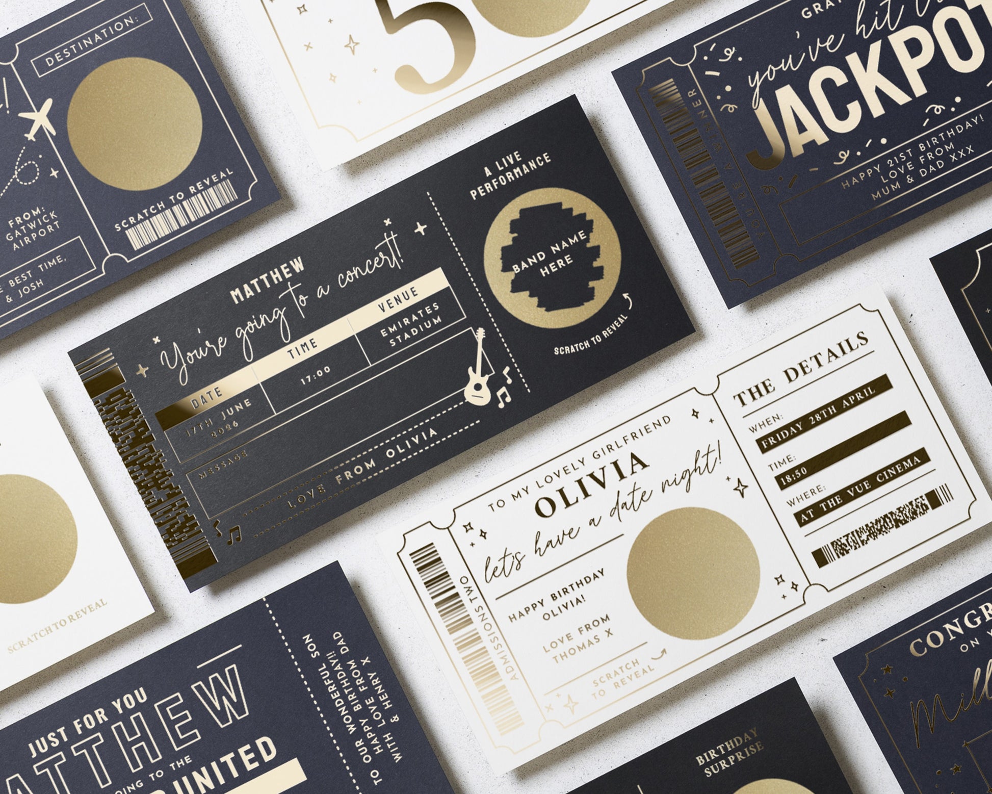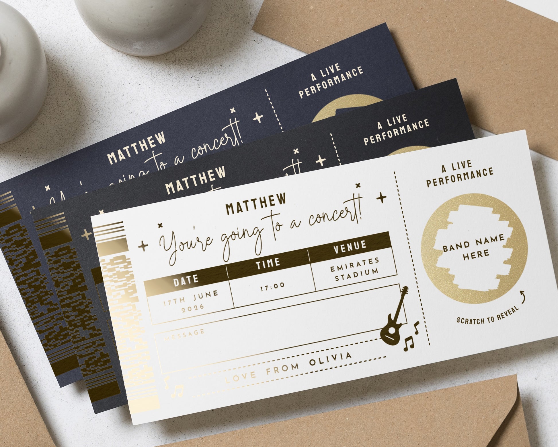 Surprise someone special with this personalised concert ticket gift voucher, featuring a gold foil scratch to reveal panel and a sleek black background. Perfect for music lovers and live event fans.