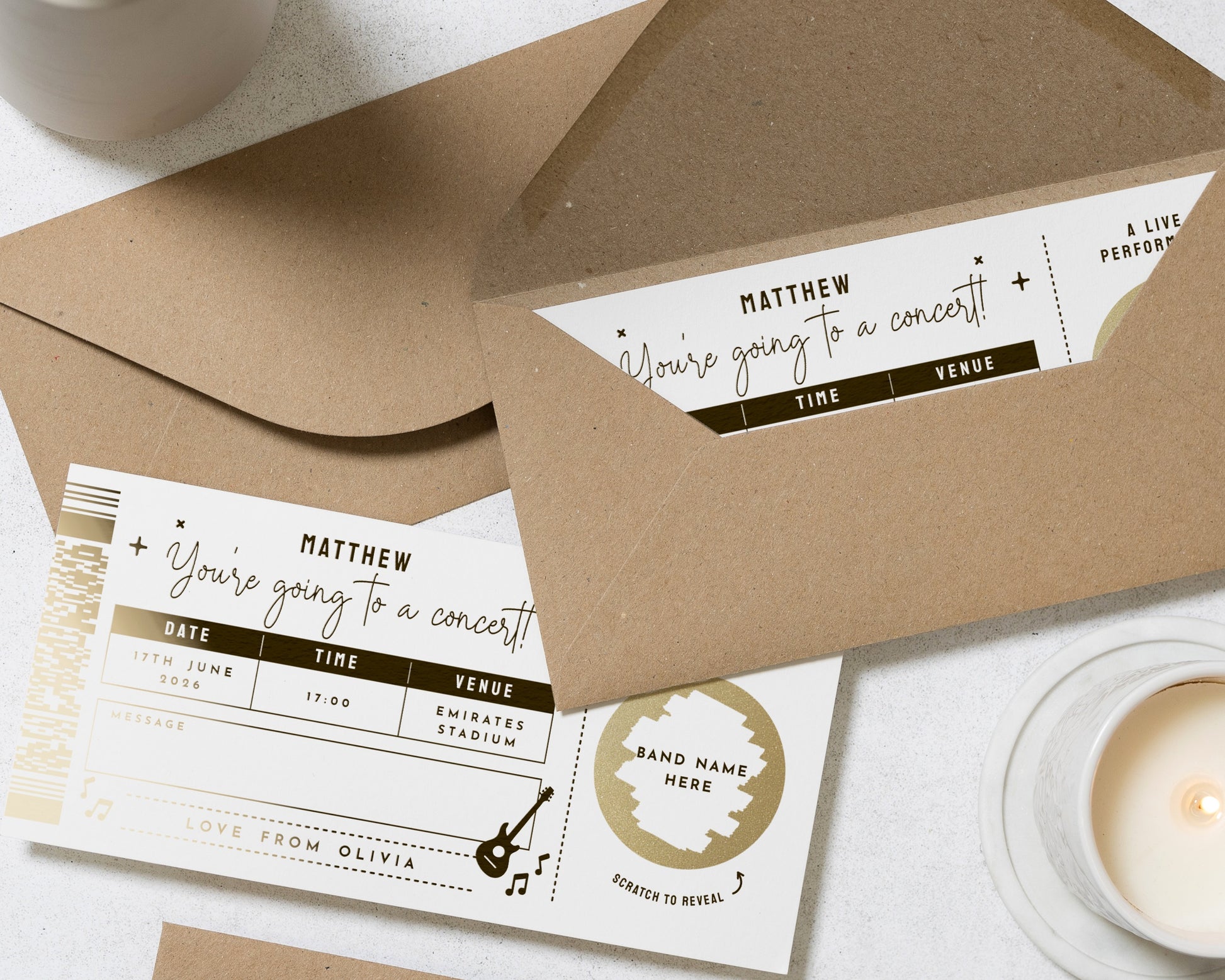 Personalised Concert Ticket Gift, Scratch To Reveal, Gold Foil, Gift Voucher, Concert Gift For Him Or Her