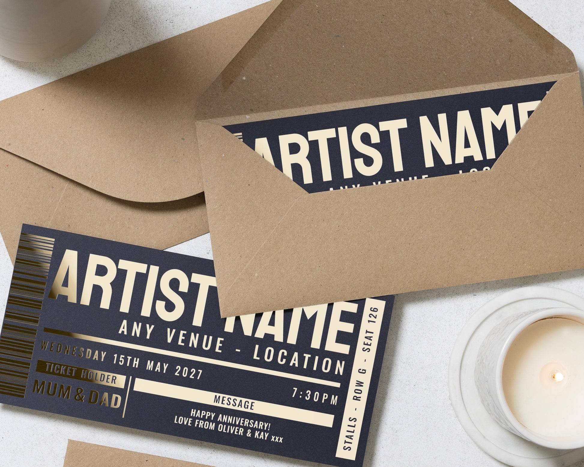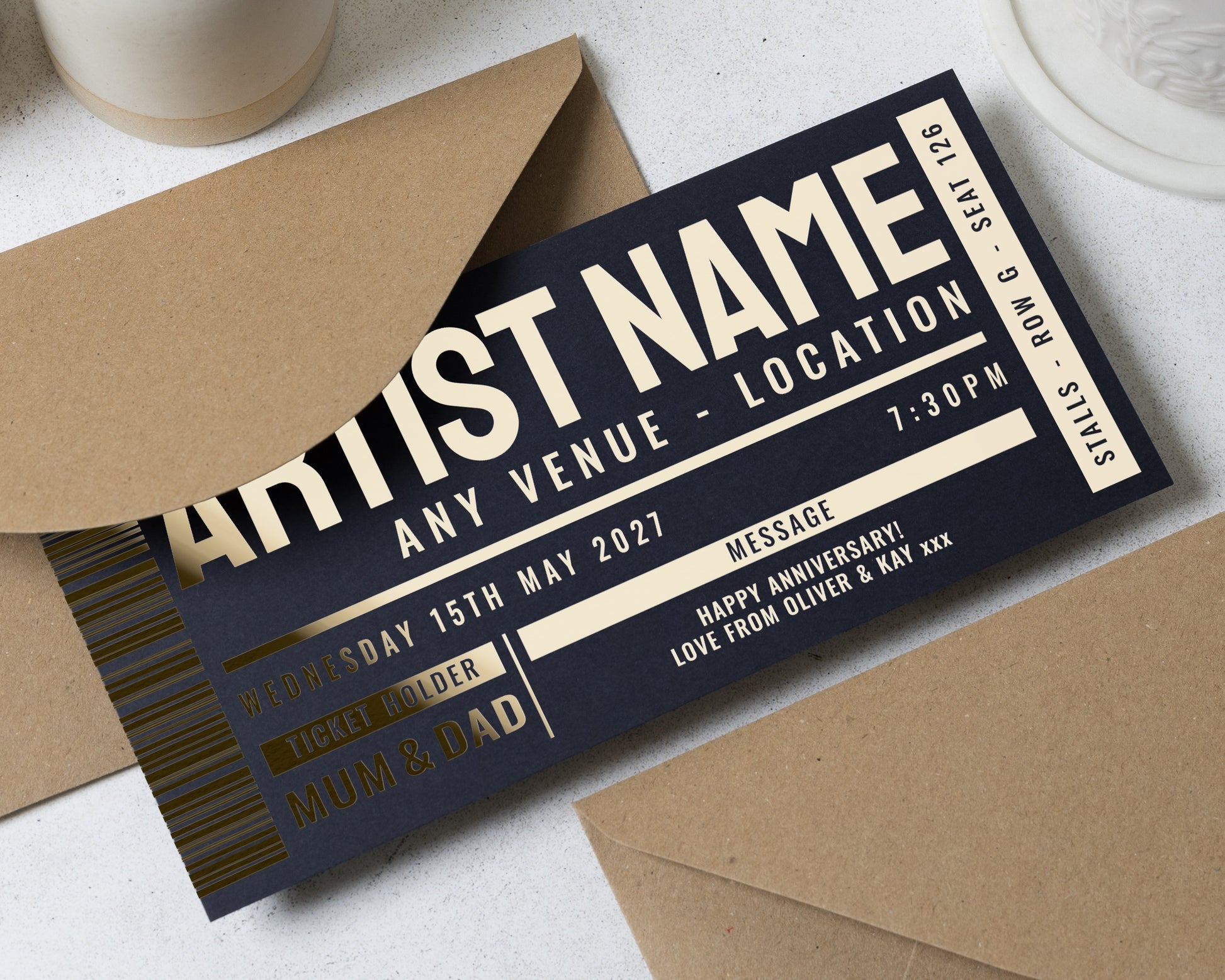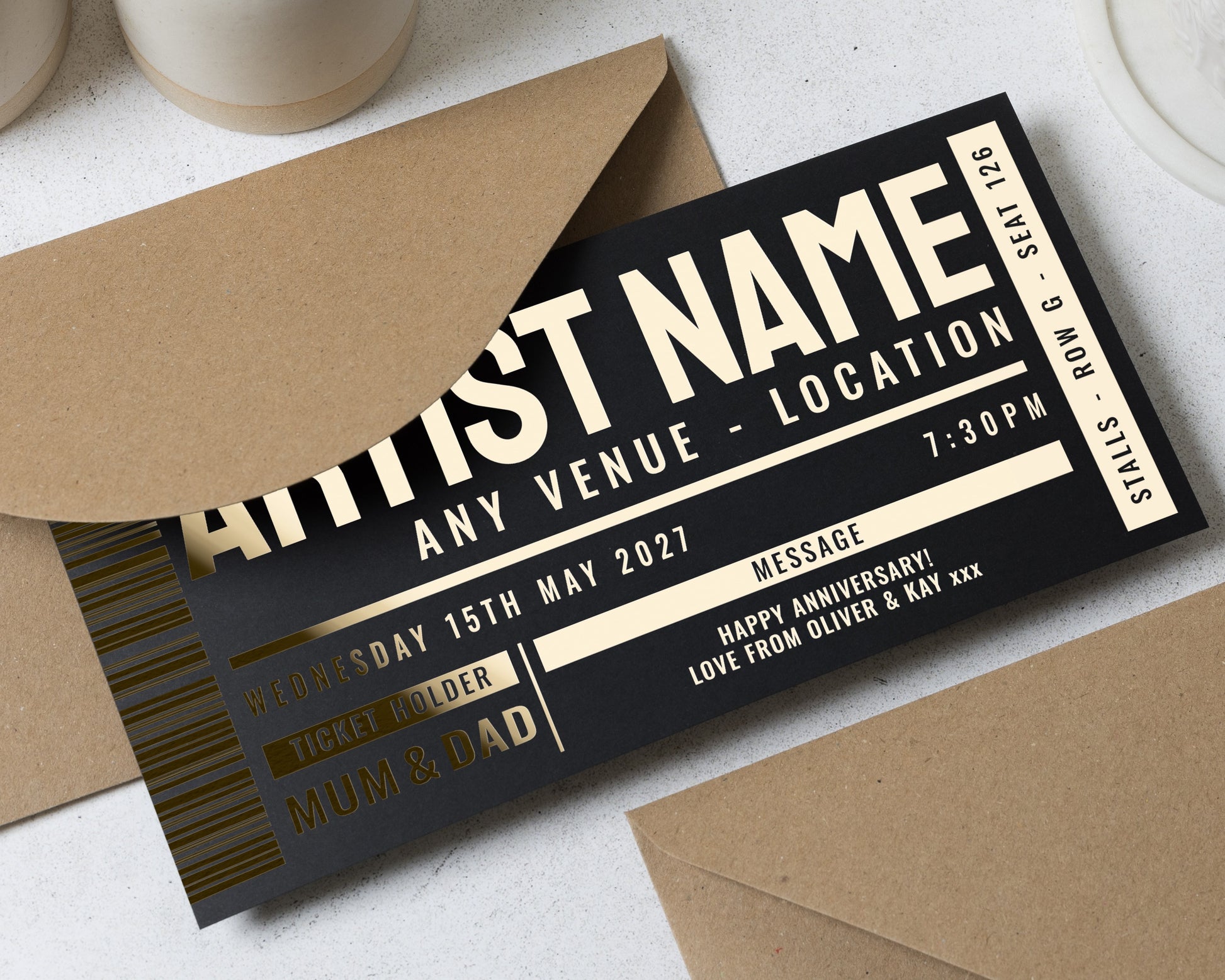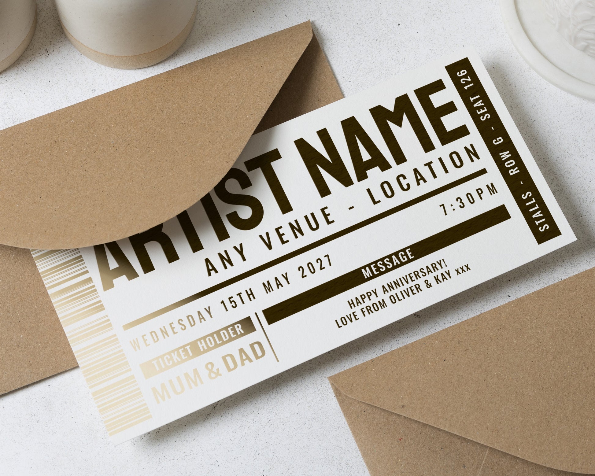 Surprise someone special with a personalised gold foil concert ticket gift voucher. Customise with artist, venue, date, time, ticket holder and message for a truly memorable experience.