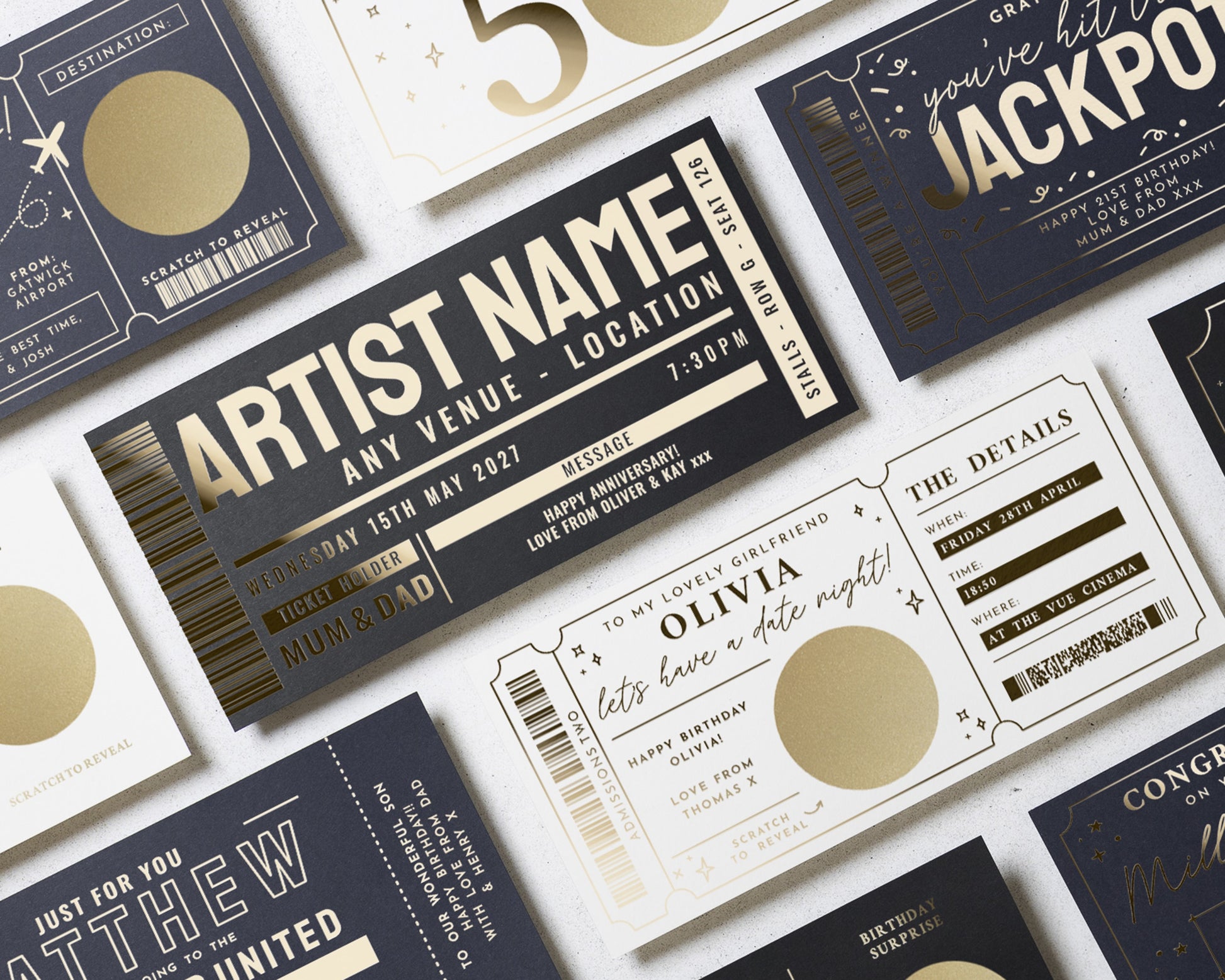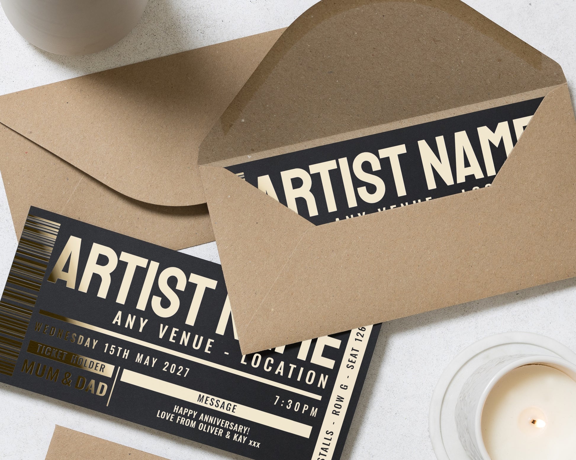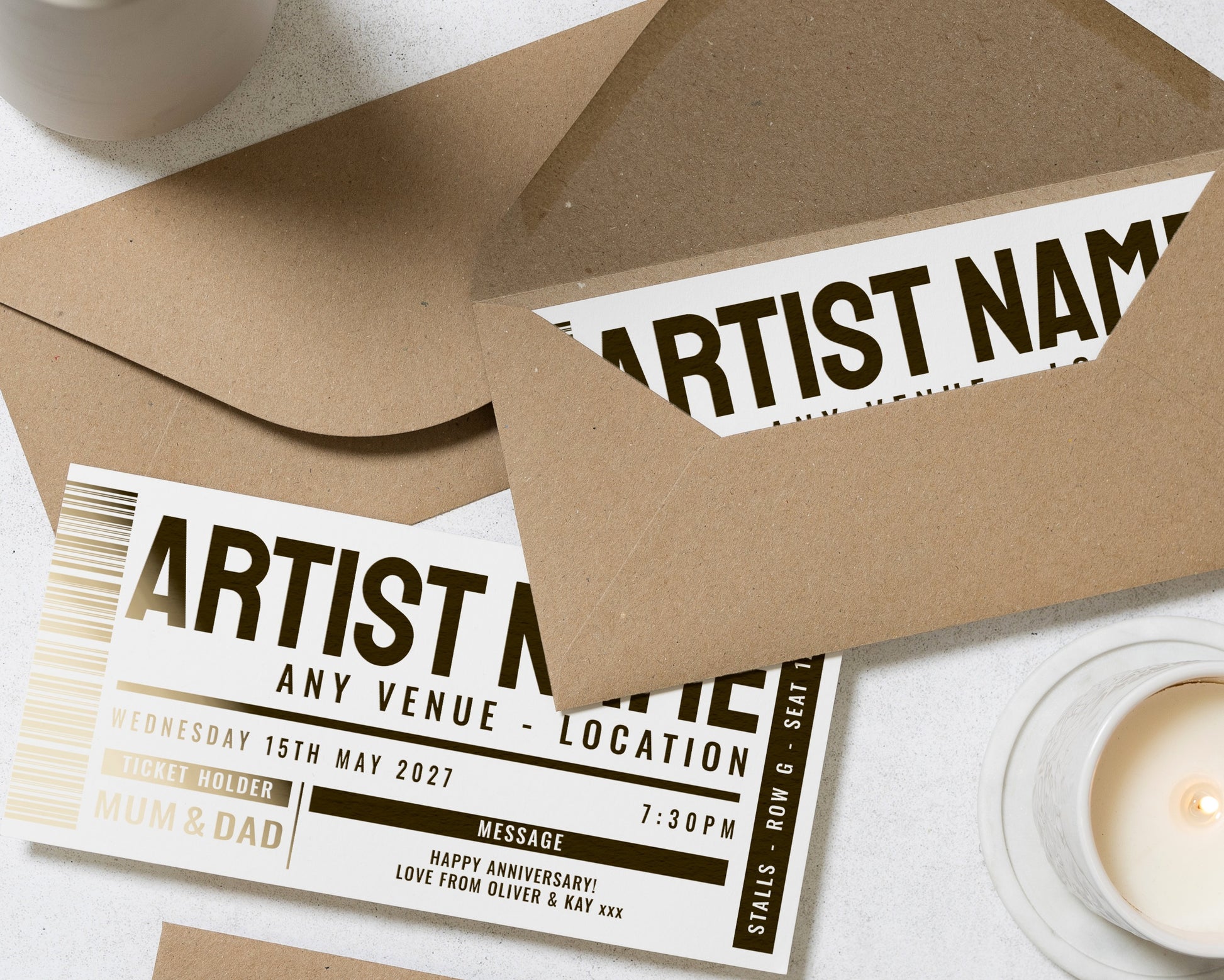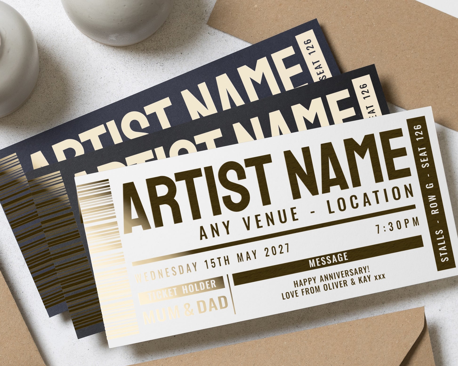 Surprise someone special with a personalised gold foil concert ticket gift voucher. Customise with artist, venue, date, time, ticket holder and message for a truly memorable experience.