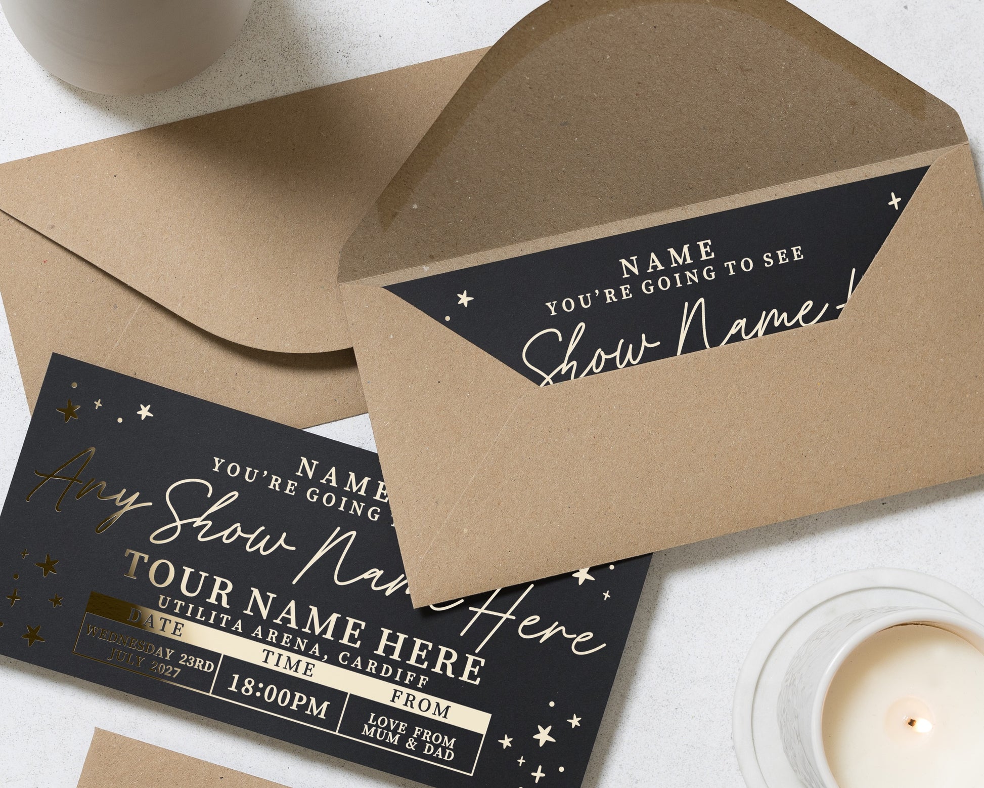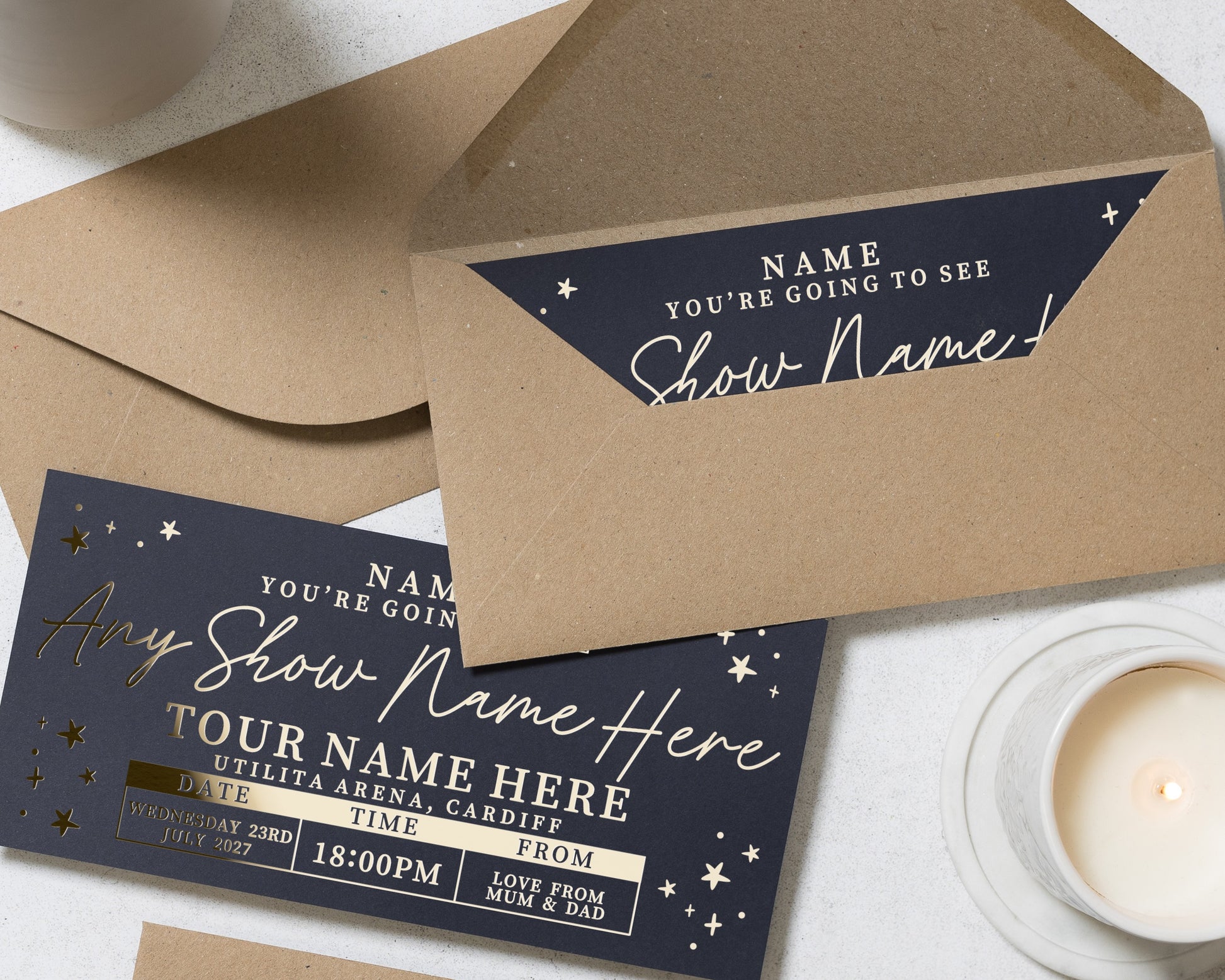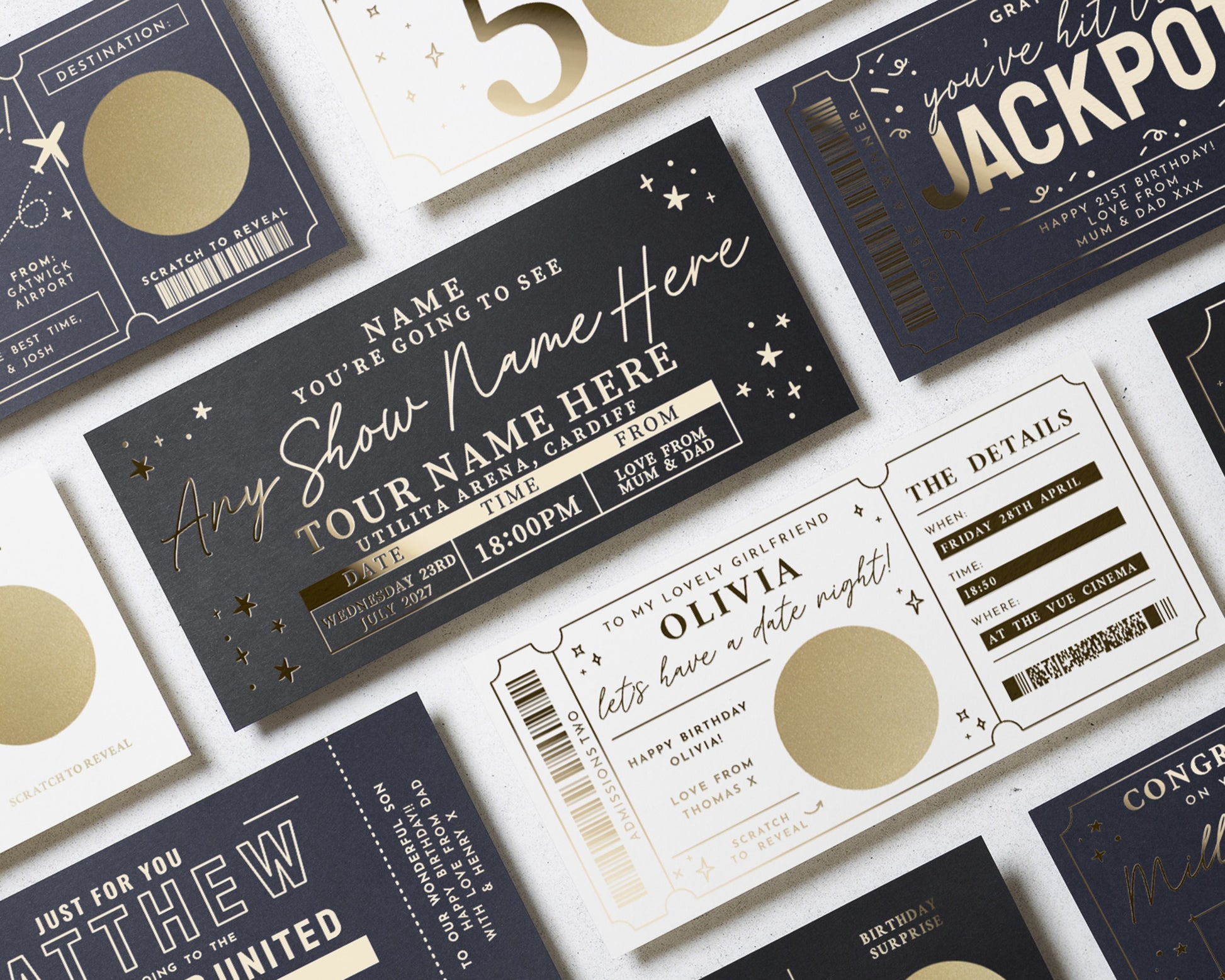 Surprise your loved one with a personalised concert ticket gift voucher, featuring elegant gold foil and a scratch to reveal show name. Perfect for birthdays, anniversaries, or special occasions, this custom experience gift is sure to delight.