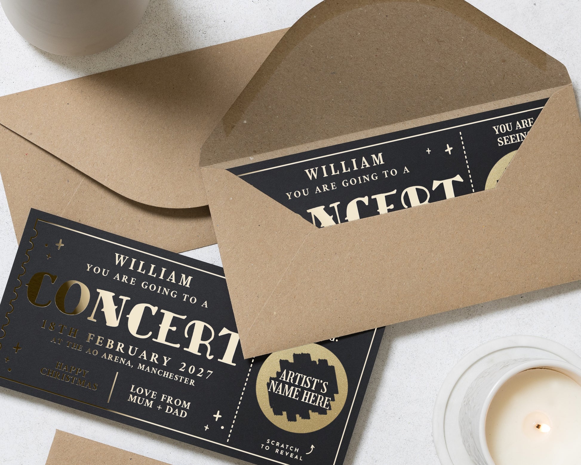 Personalised Concert Ticket Gift, Scratch To Reveal Gift Voucher, Concert Gift For Him Or Her, Gold Foil Christmas Gift