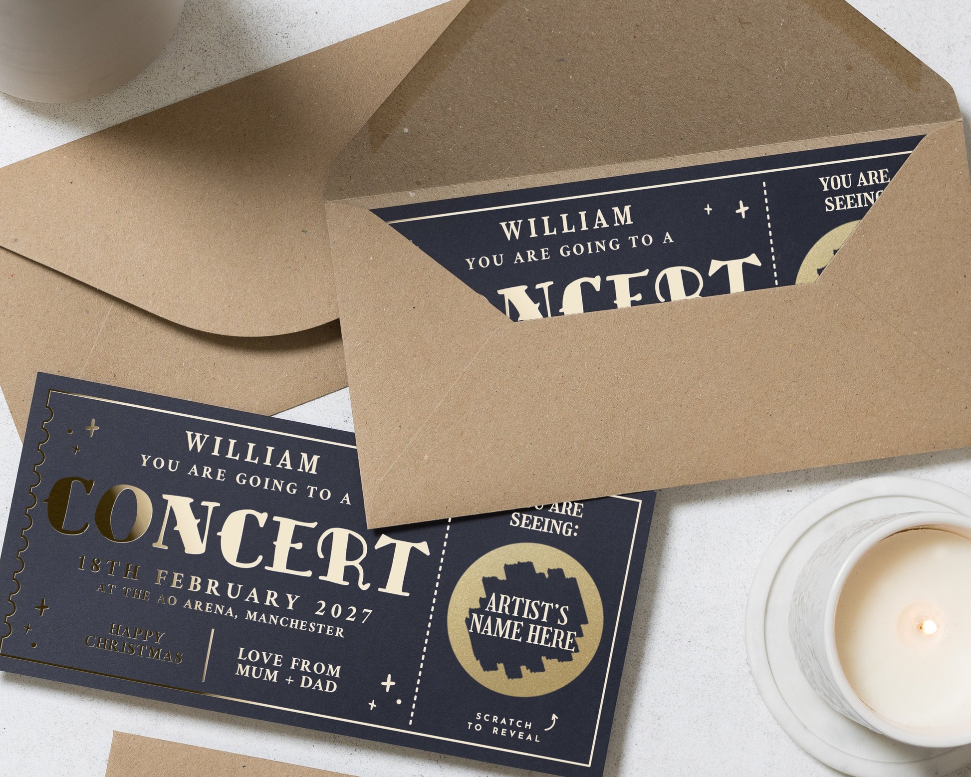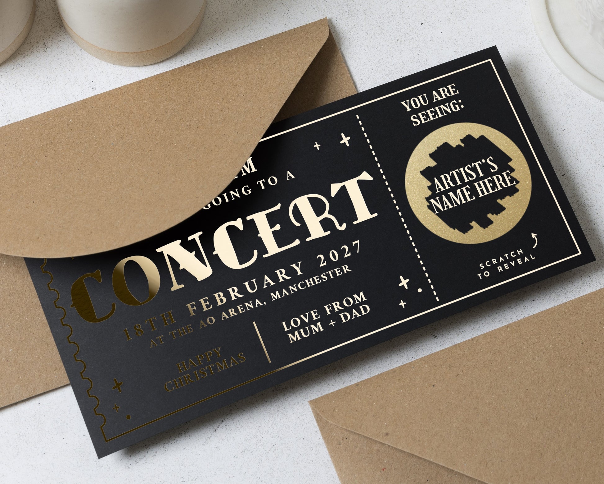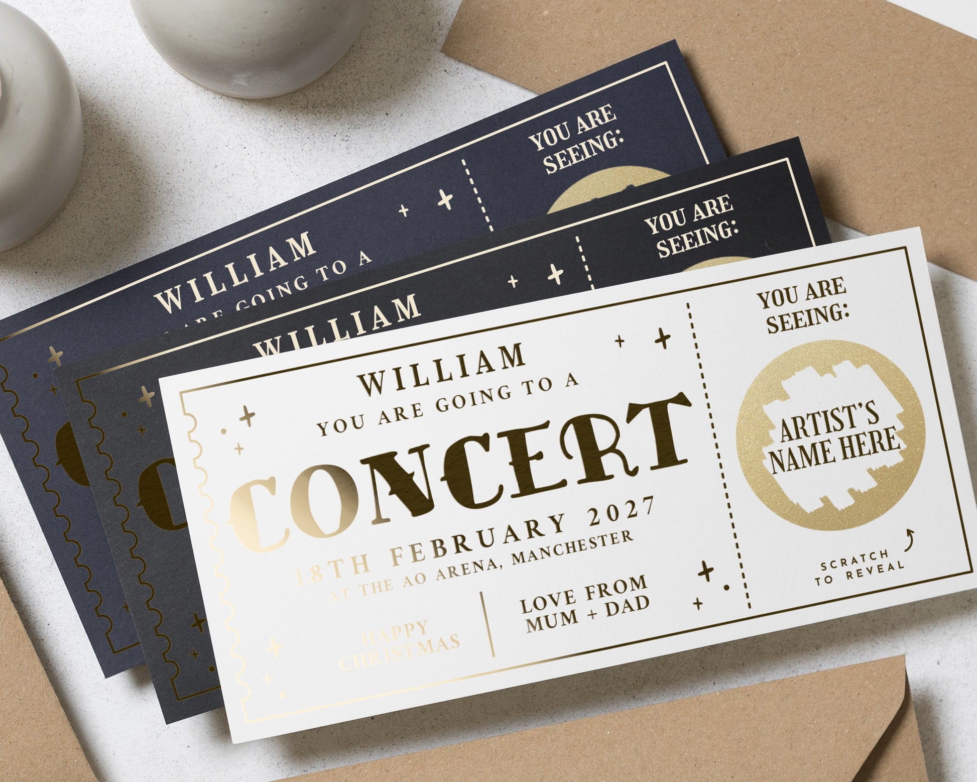 Personalised Concert Ticket Gift, Scratch To Reveal Concert Voucher, Gold Foil Gift For Him Or Her