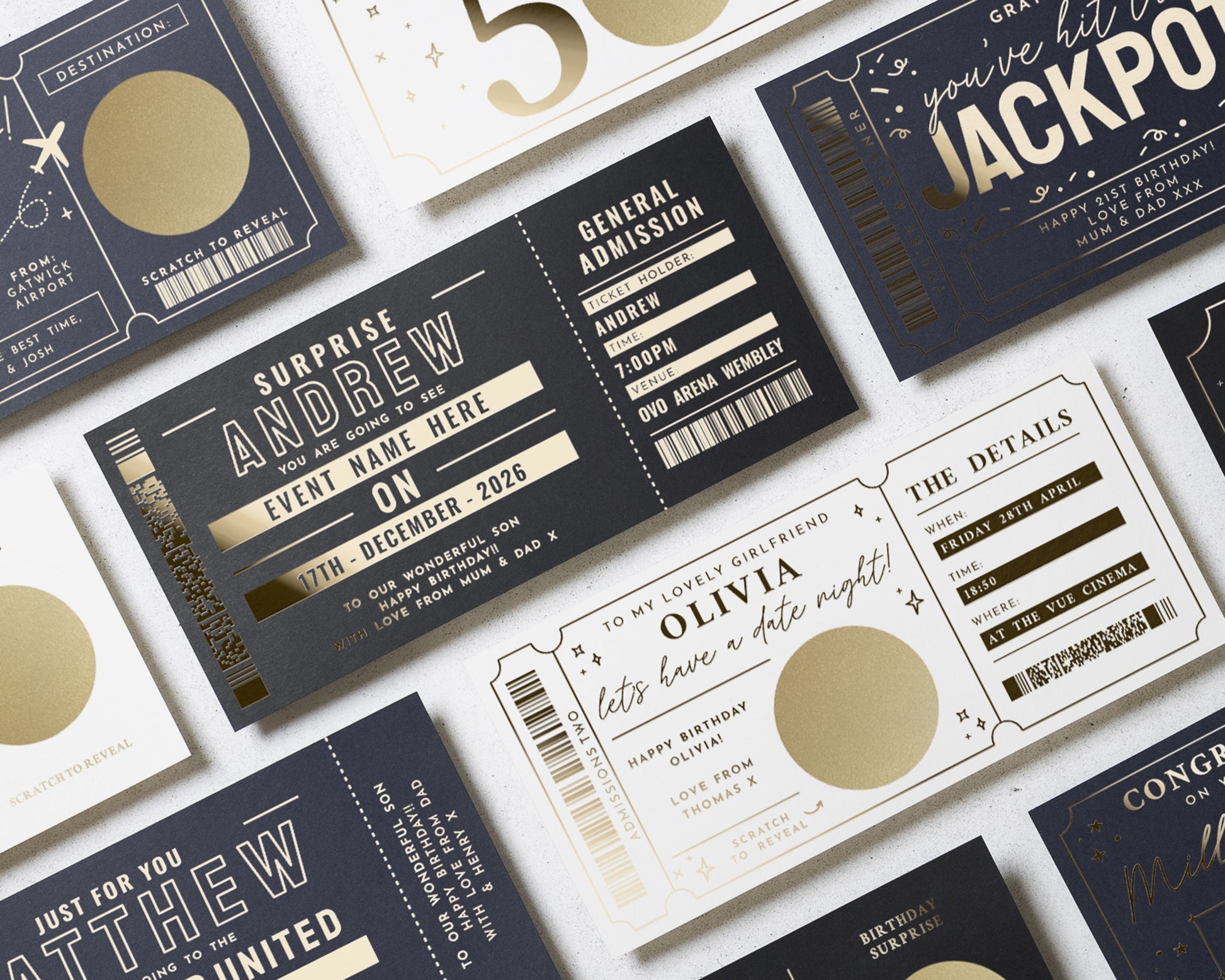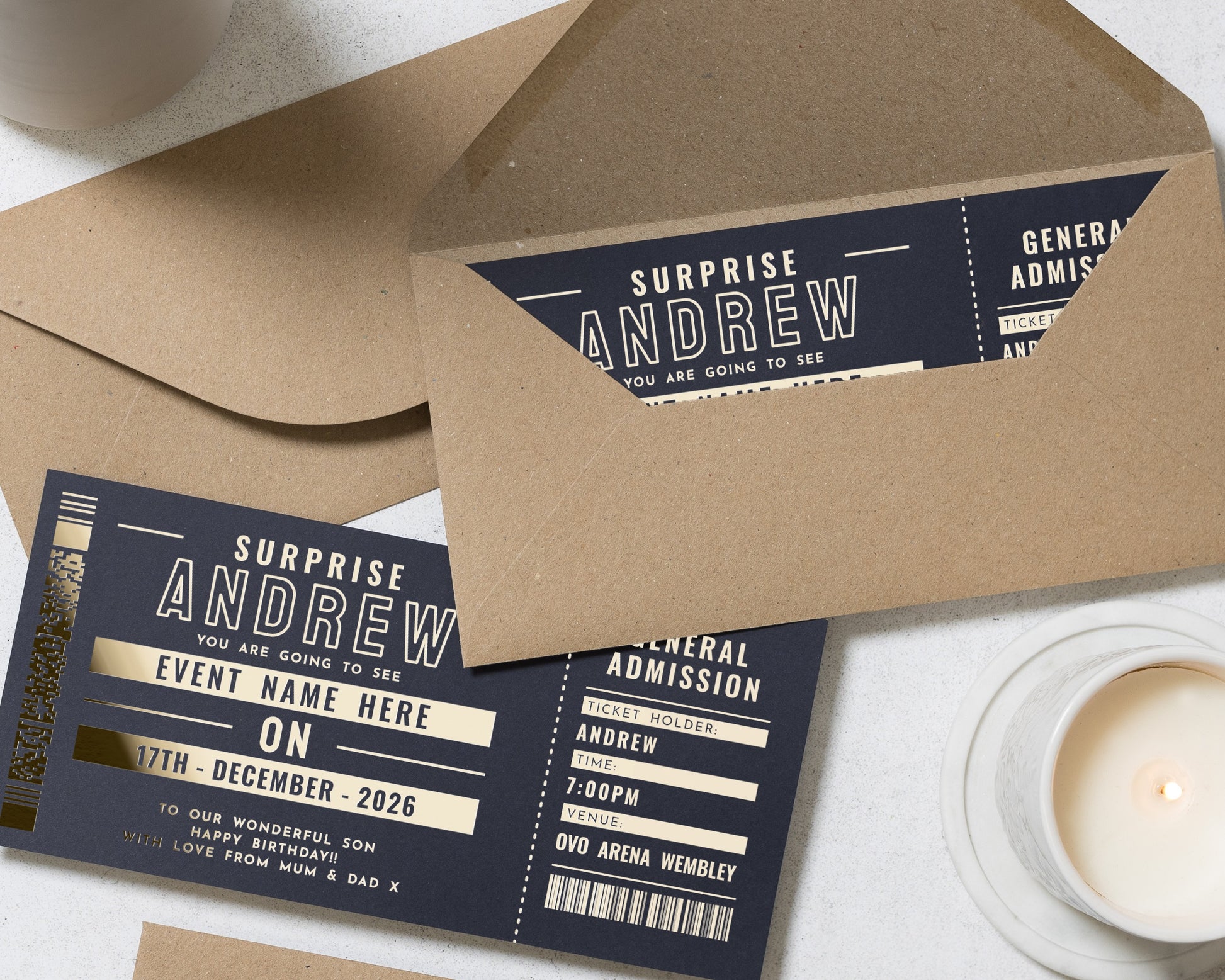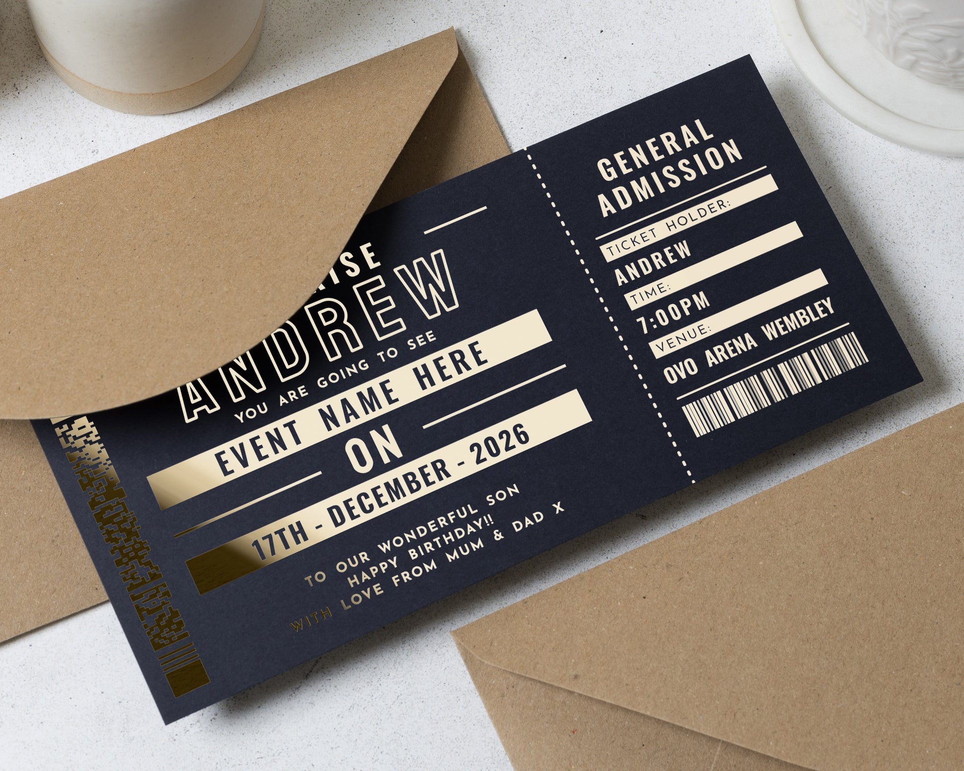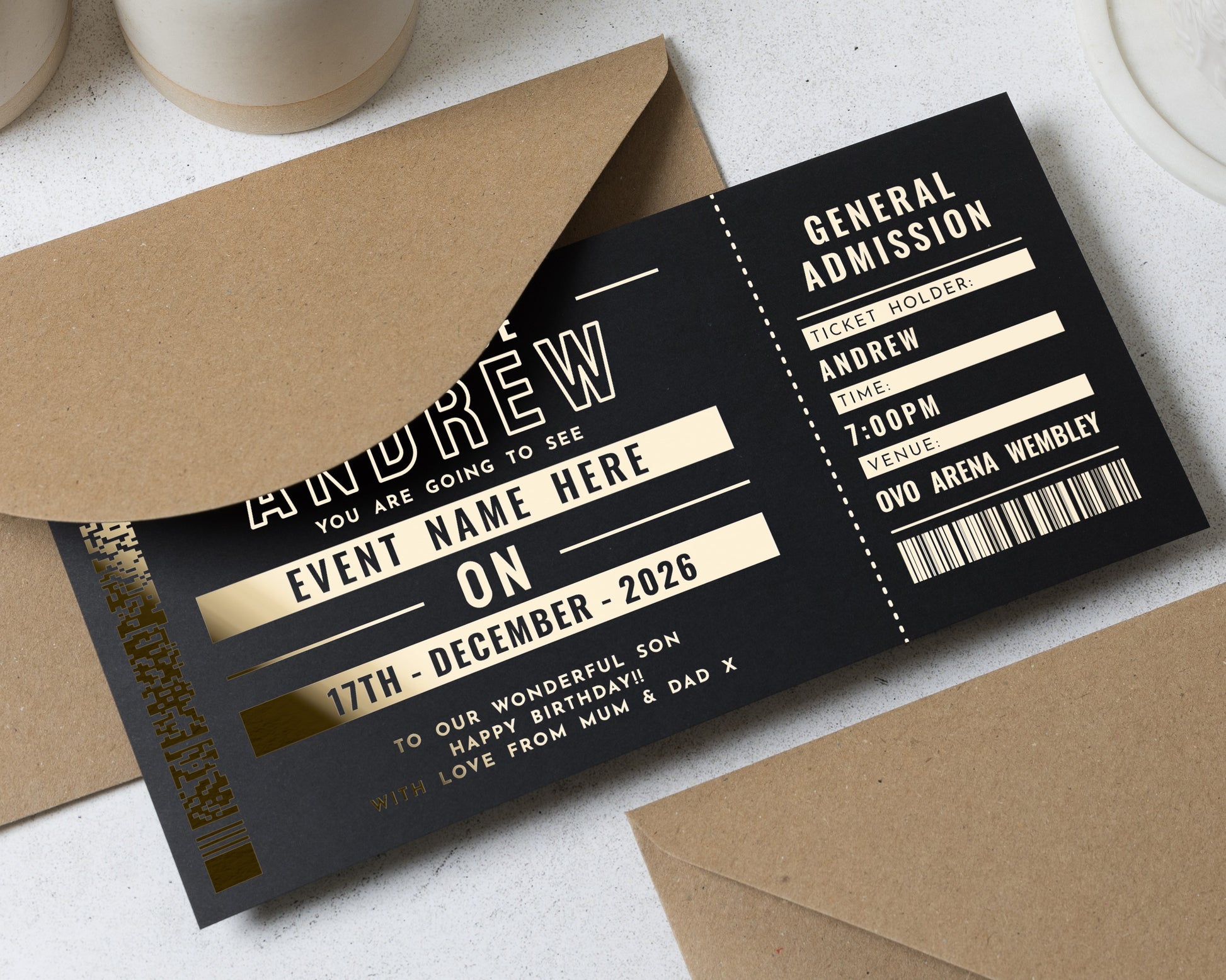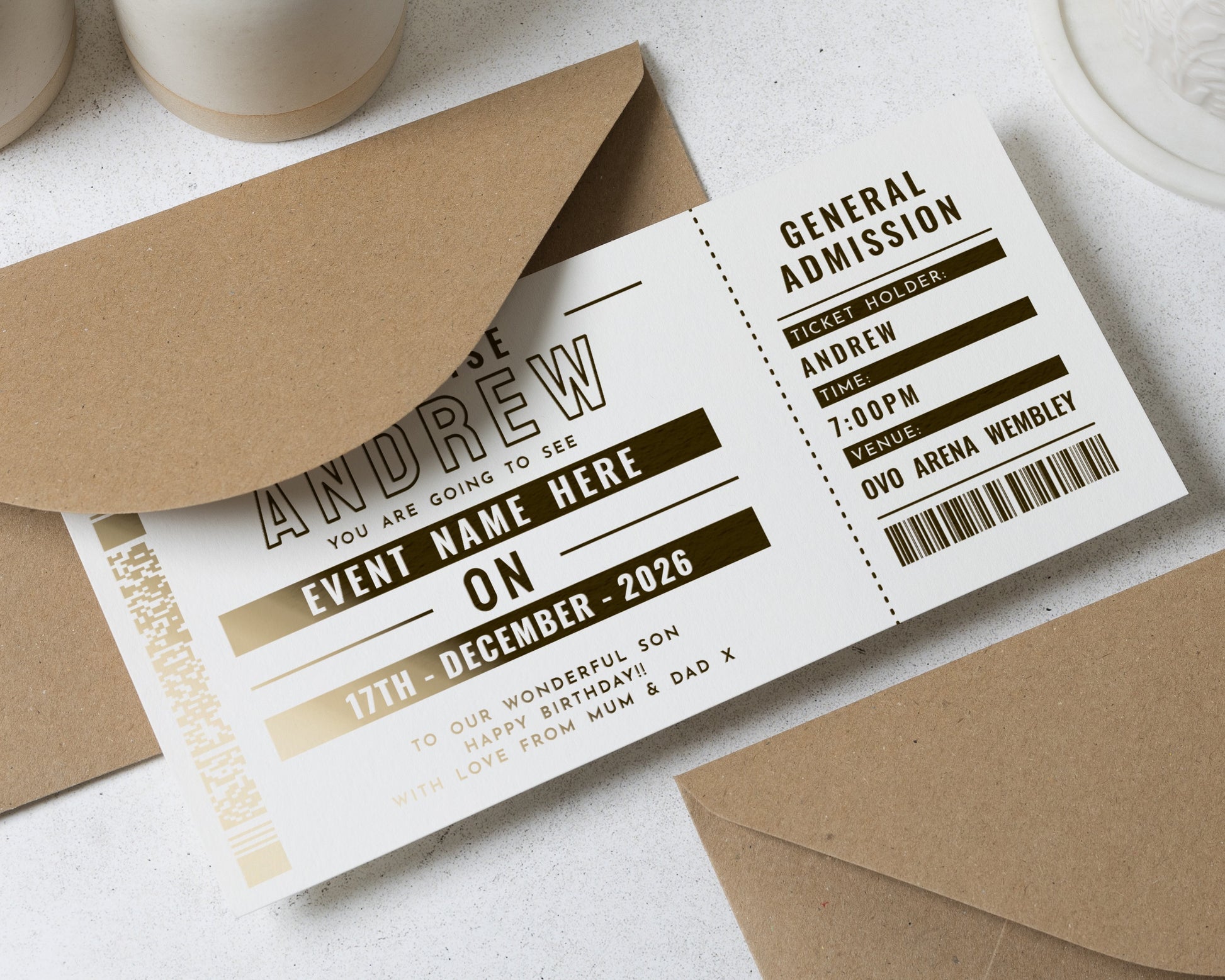 Personalised Concert Ticket Gift Voucher, Gold Foil Event Gift, Birthday Gift for Son, Custom Surprise Ticket, General Admission Card