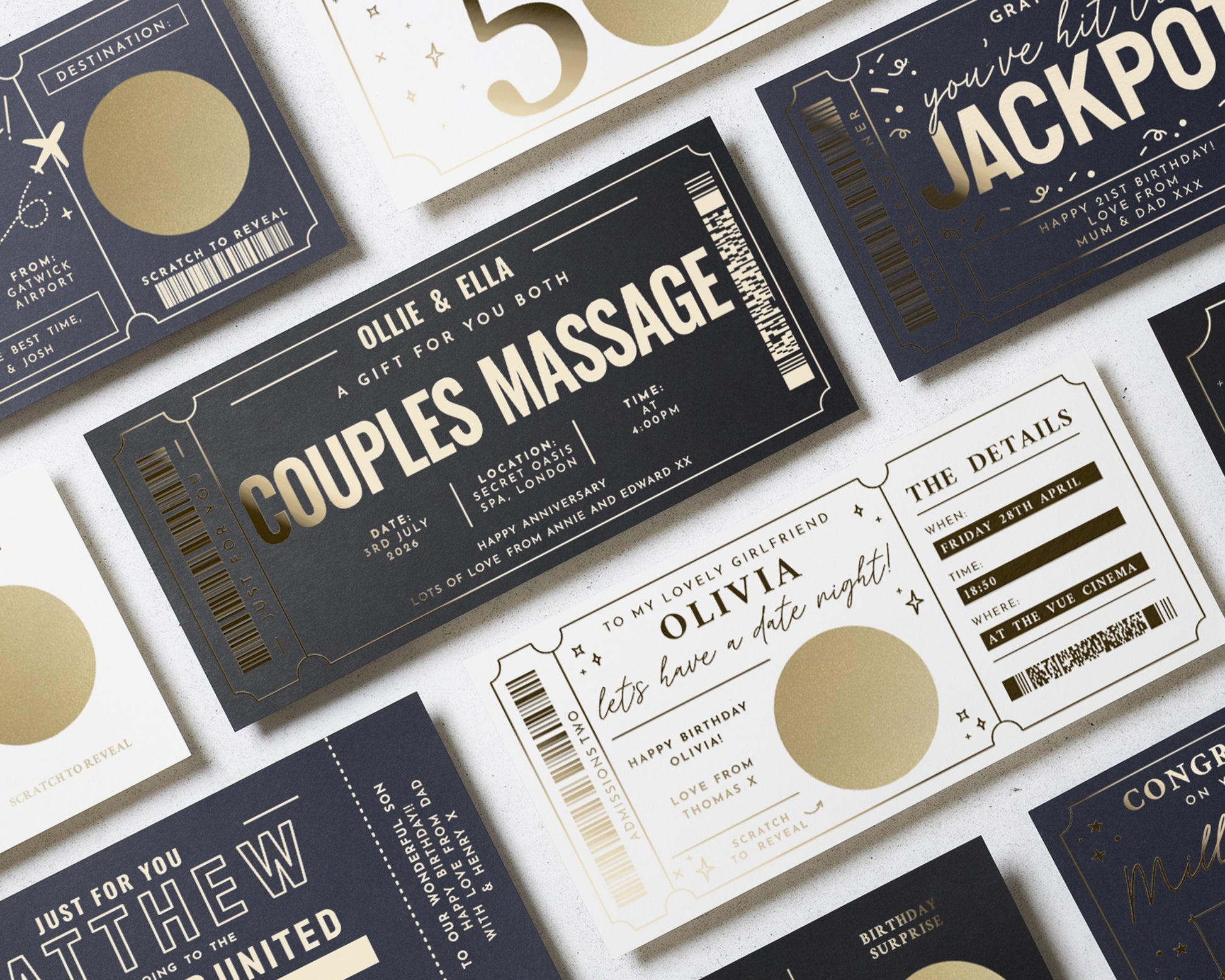 • Each voucher card measures 210x99mm, and is printed on heavyweight premium cardstock and finished with real gold foil detailing for a luxurious touch.