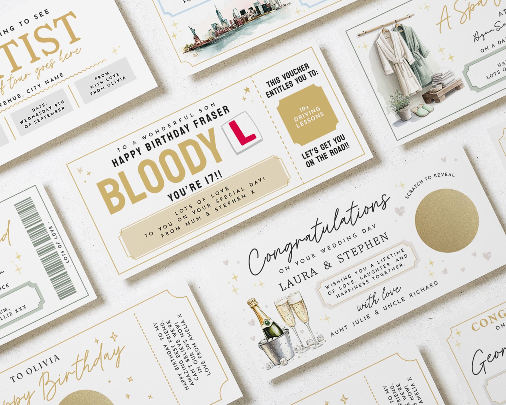 • Each voucher card measures 210x99mm, and is printed on heavyweight premium cardstock.