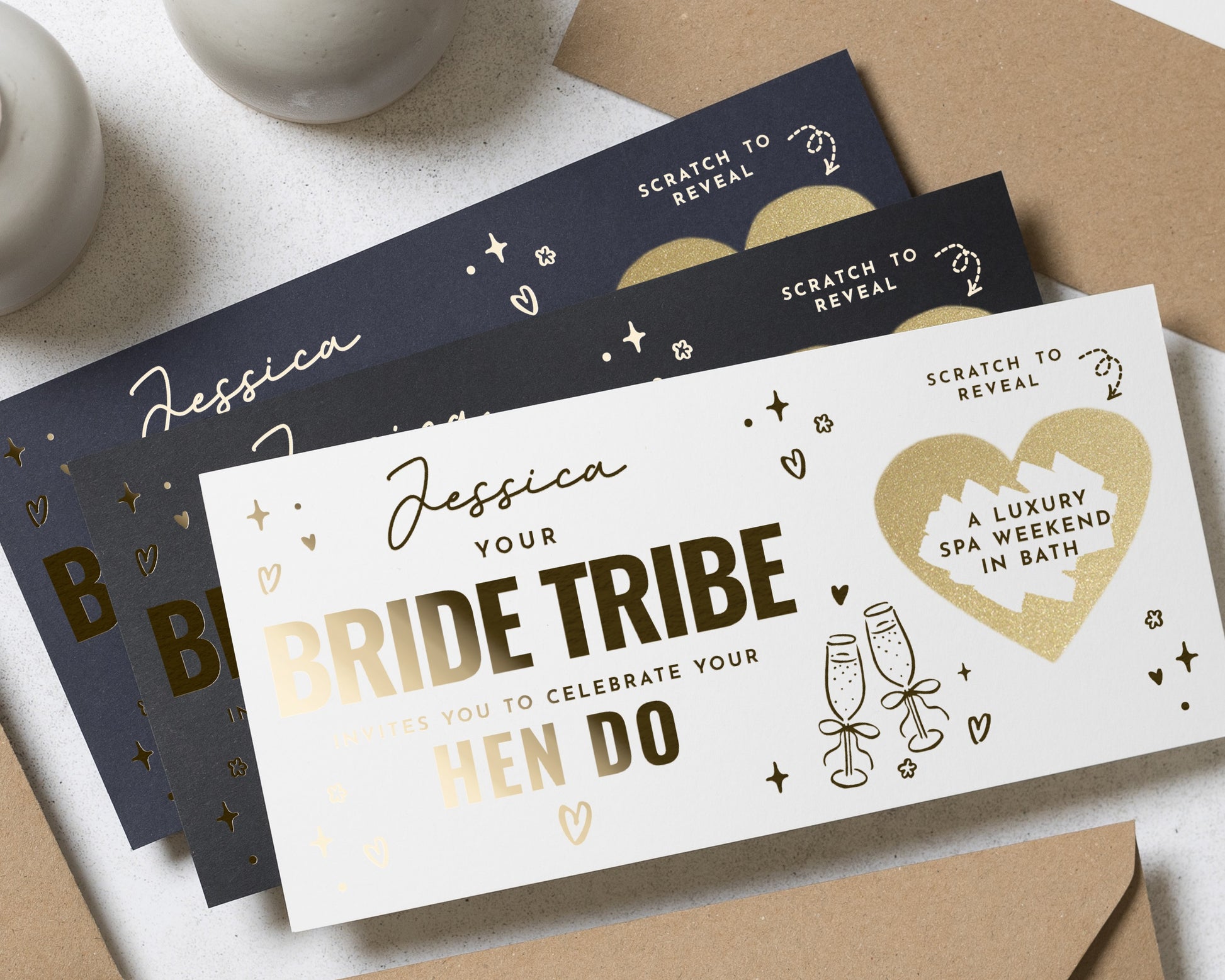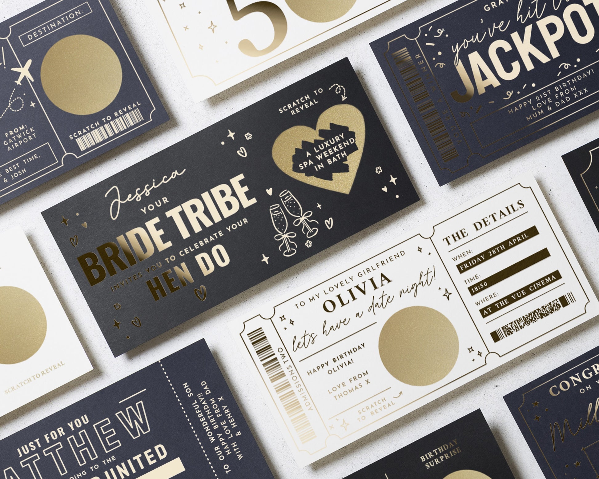 • Each voucher card measures 210x99mm, and is printed on heavyweight premium cardstock and finished with real gold foil detailing for a luxurious touch.
