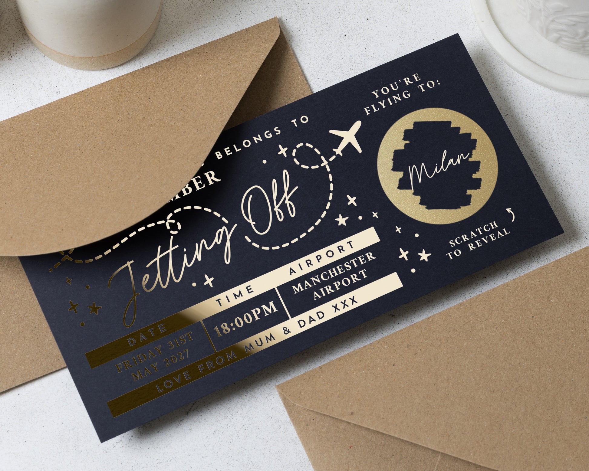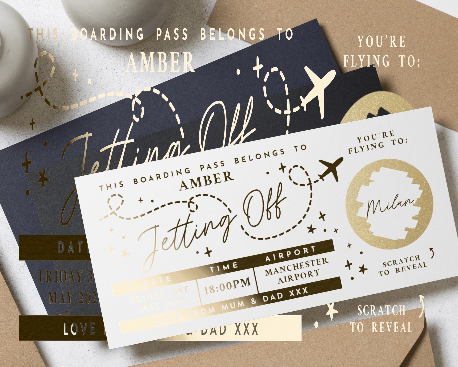 Personalised Holiday Reveal Ticket, Scratch To Reveal Gift, Jetting Off Boarding Pass, Gold Foil Gift Voucher