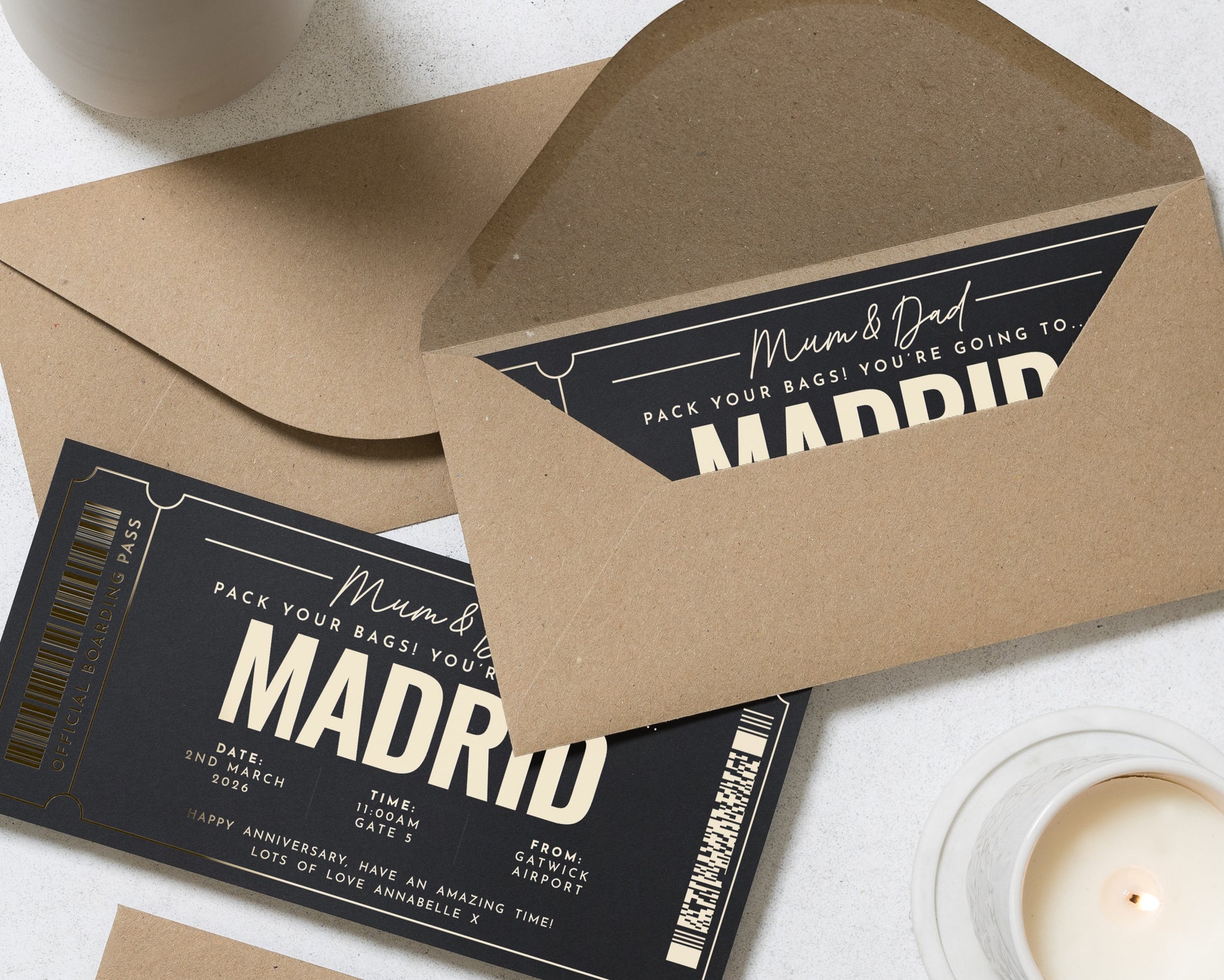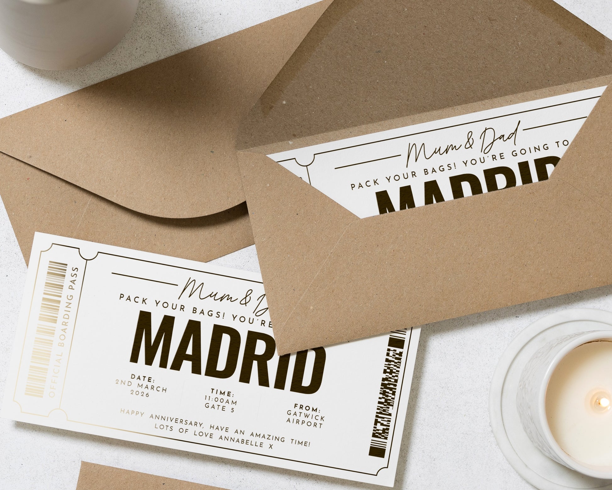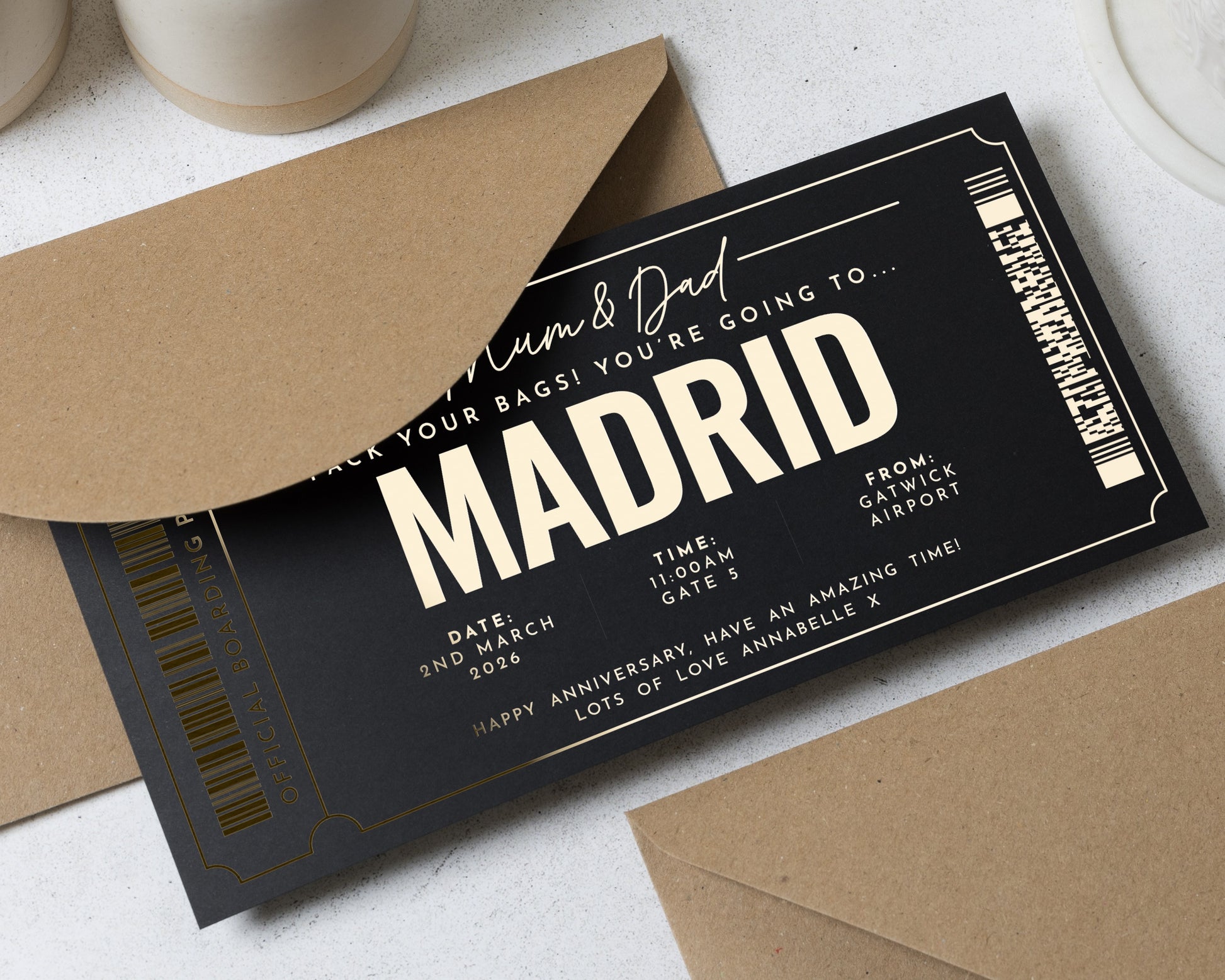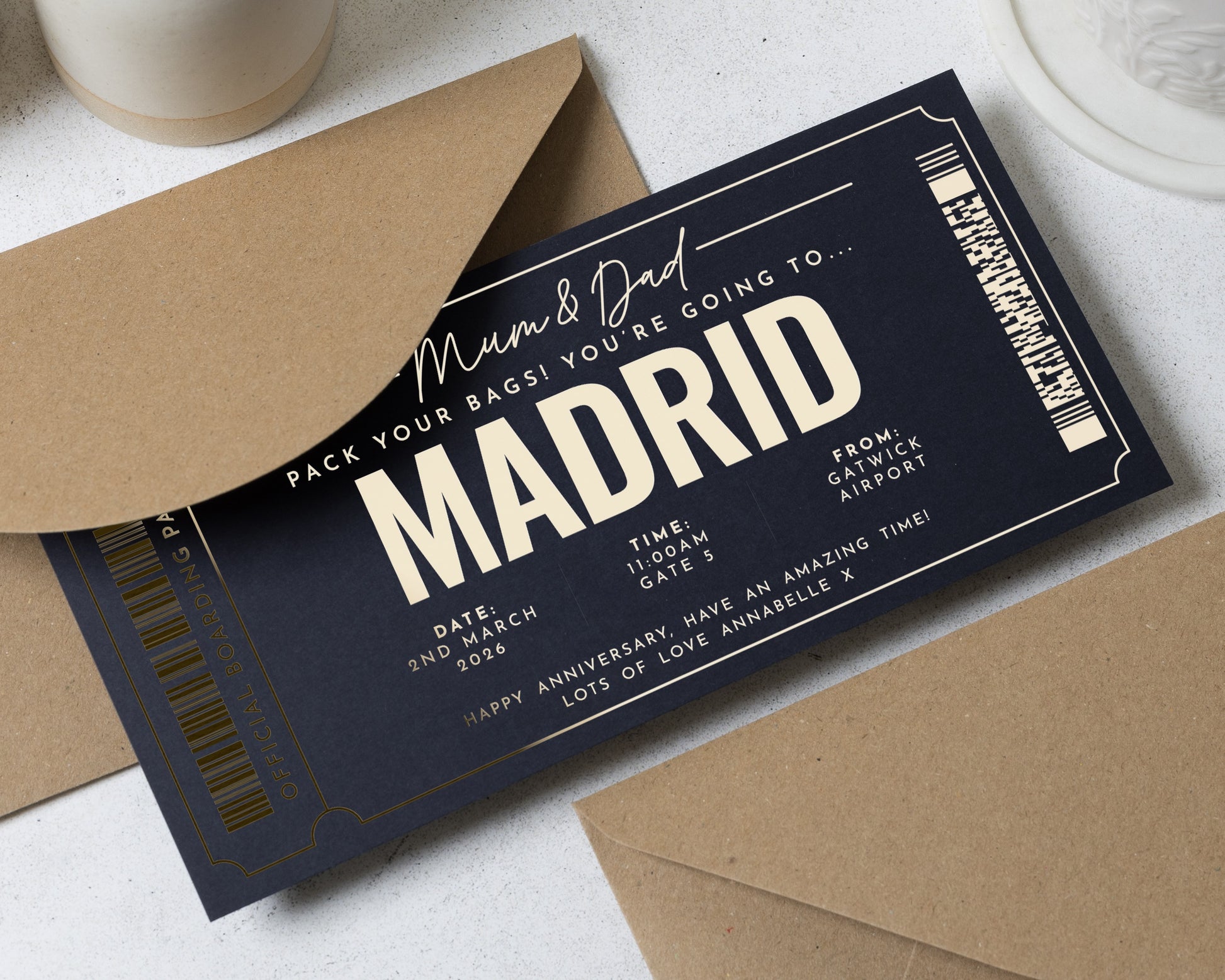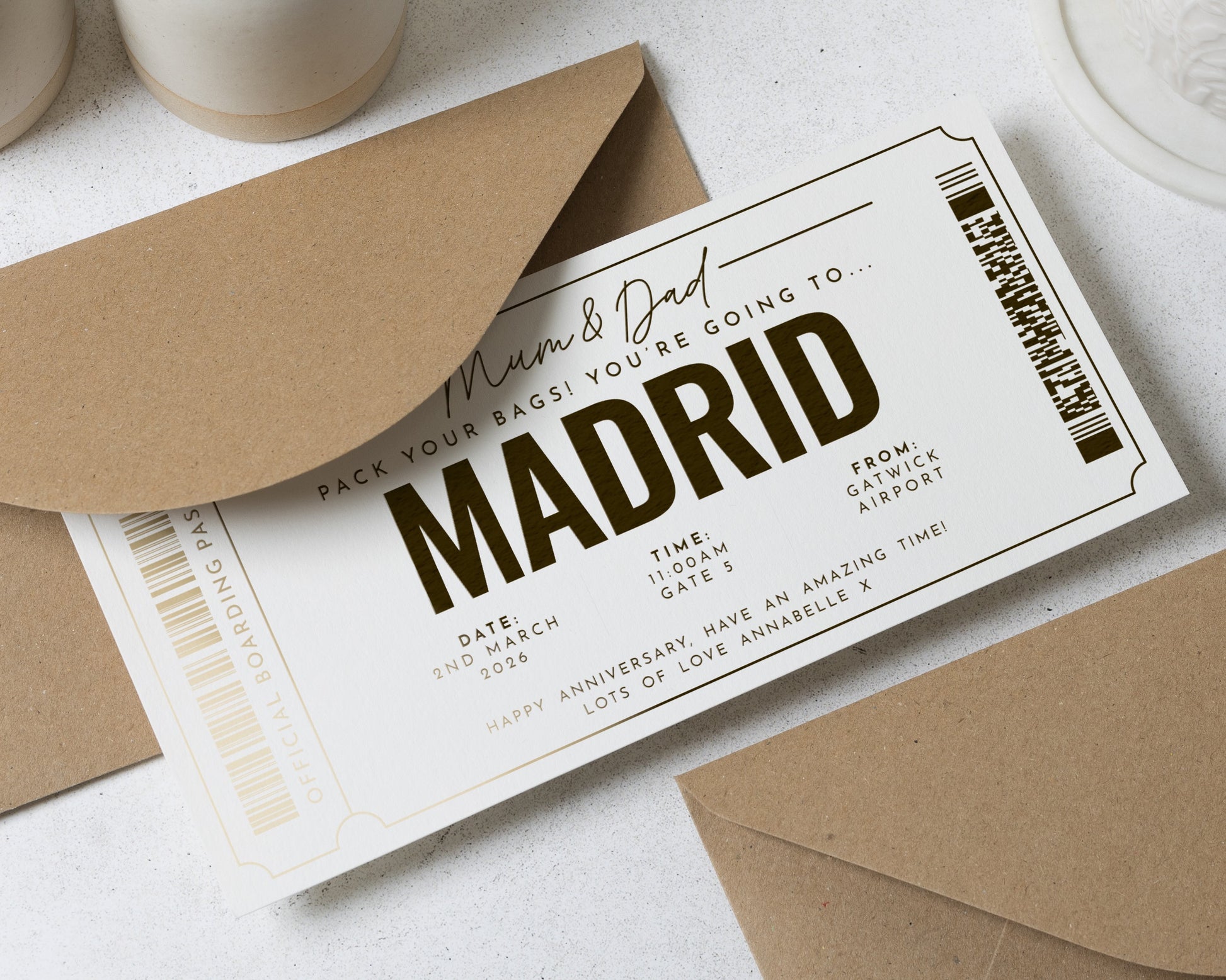 Surprise your loved ones with a personalised gold foil holiday reveal ticket to Madrid. This elegant scratch to reveal boarding pass is perfect for gifting Mum and Dad a memorable travel experience.