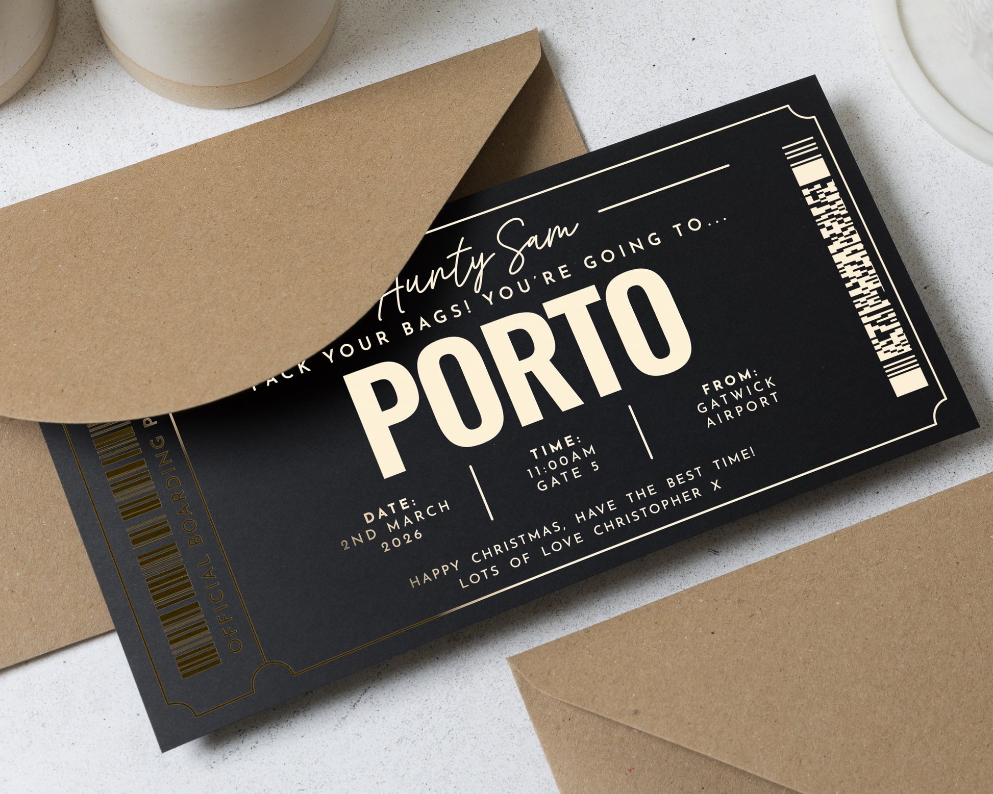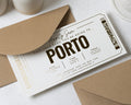 Surprise your aunty with a personalised holiday reveal ticket to Porto! This navy and gold foil boarding pass design is perfect for Christmas or any special occasion, featuring a scratch to reveal panel for an extra special touch.