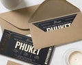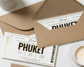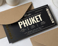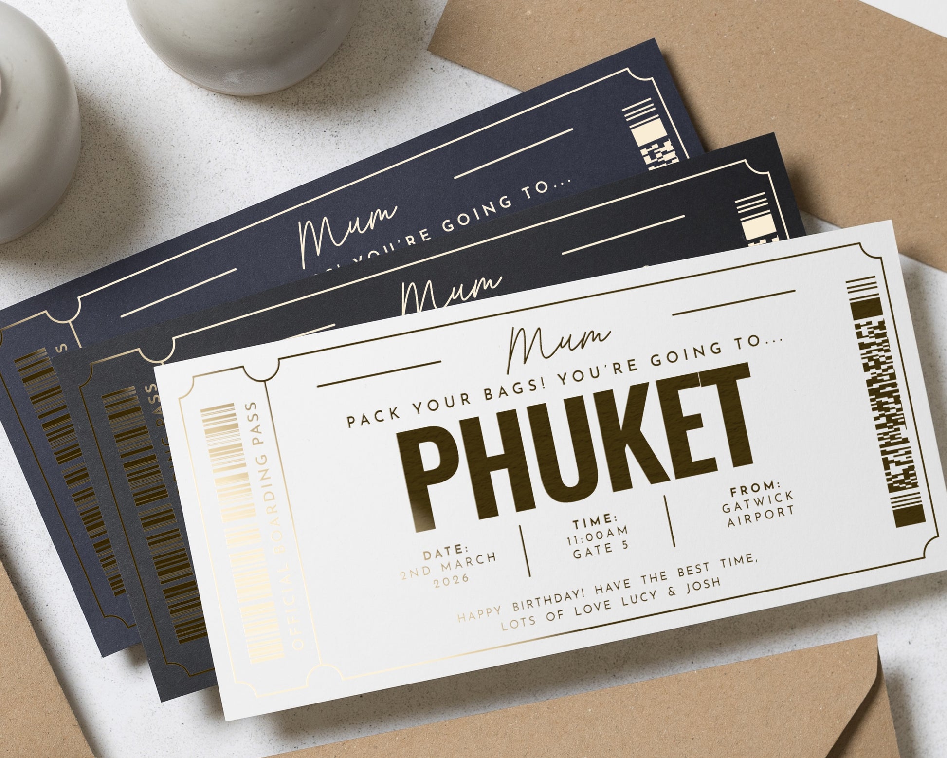 Surprise Mum with a luxury gold foil holiday reveal ticket to Phuket, personalised with your destination, date, and message. The perfect birthday or special occasion gift to announce a dream getaway in style.