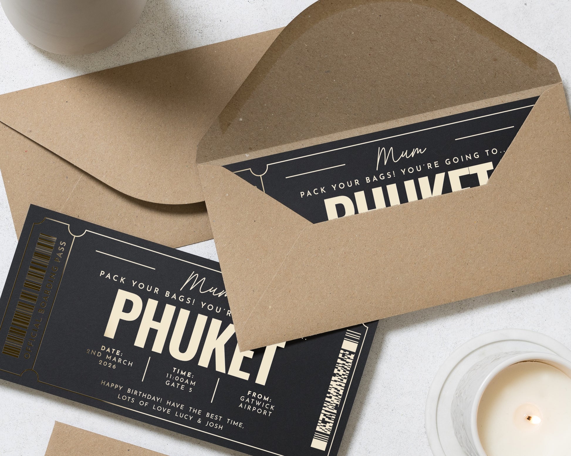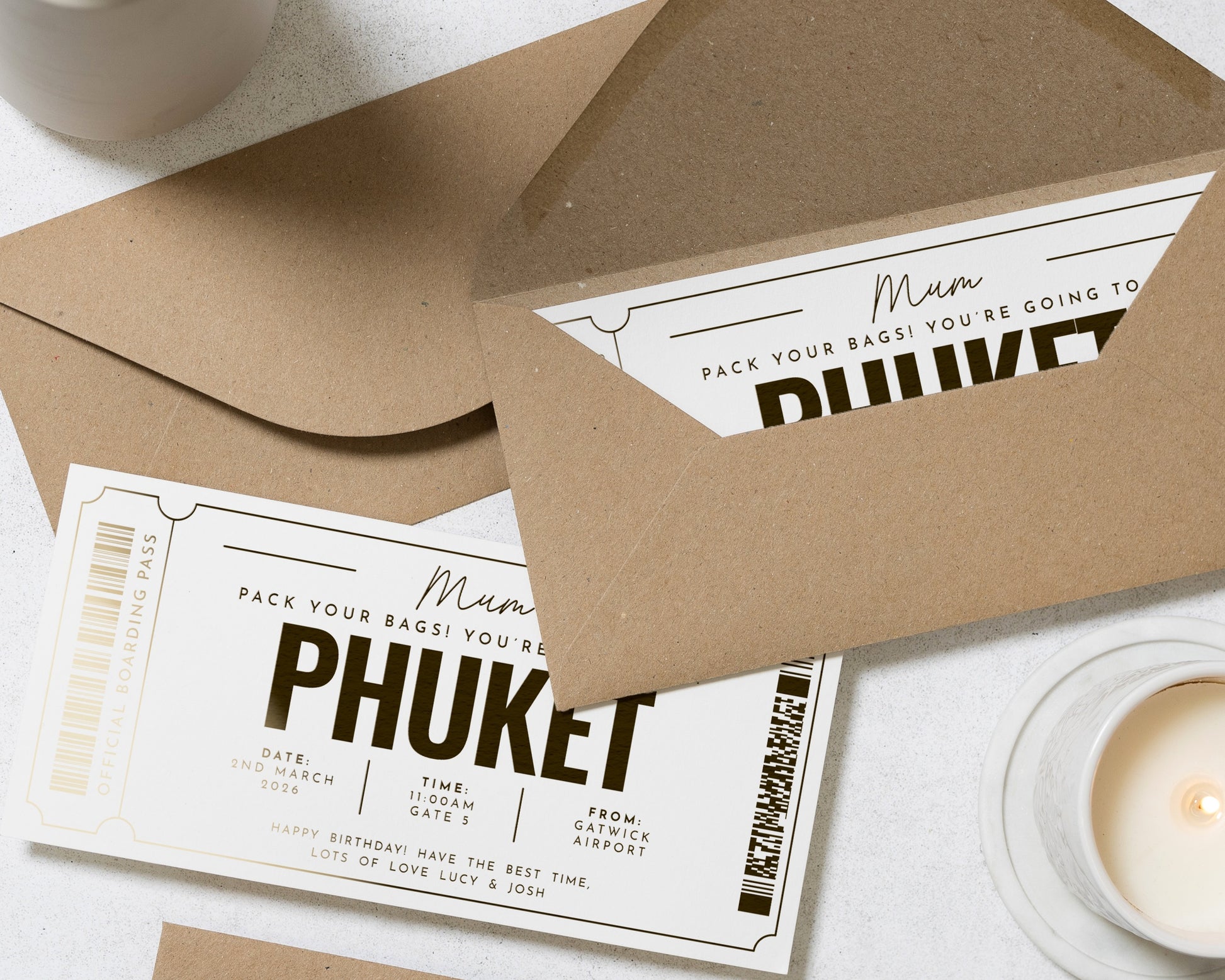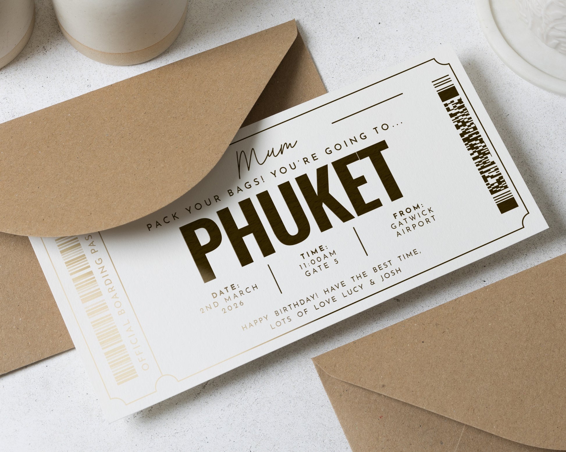 Personalised Holiday Reveal Ticket, Phuket Gift Voucher for Mum, Scratch to Reveal, Birthday Surprise, Gold Foil, Travel Gift