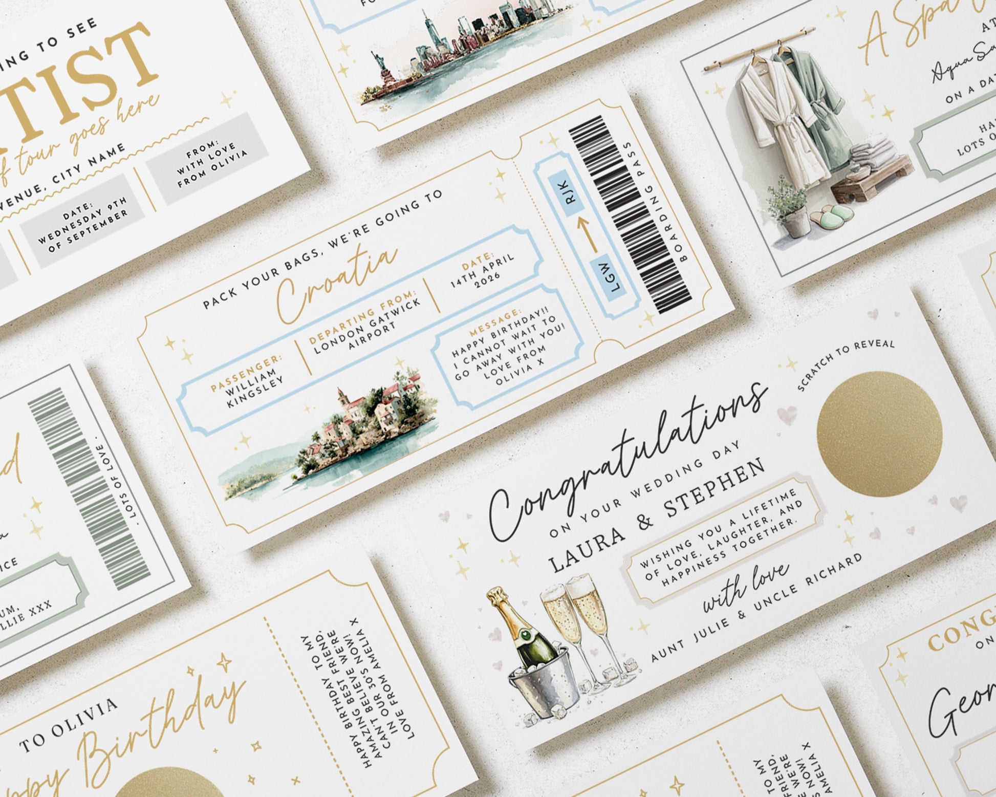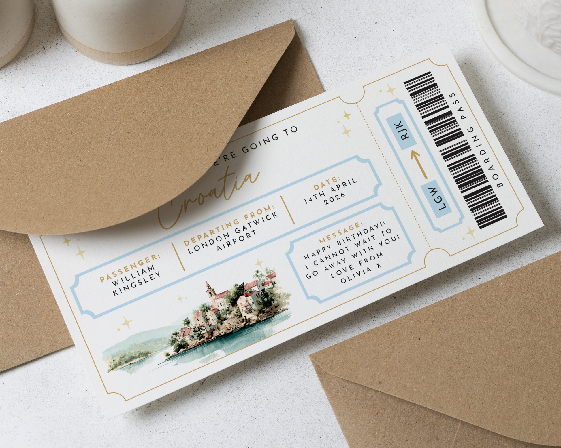 Surprise someone special with this personalised holiday reveal ticket, designed as a boarding pass for a birthday travel gift or weekend away. No scratch panel.