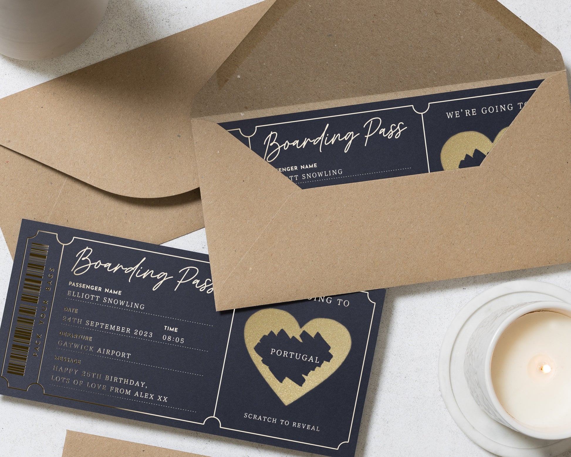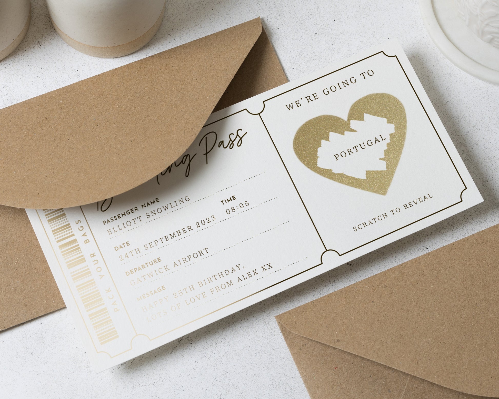 Reveal a surprise getaway with this personalised gold foil scratch to reveal boarding pass. Perfect for gifting a holiday or weekend away in style.