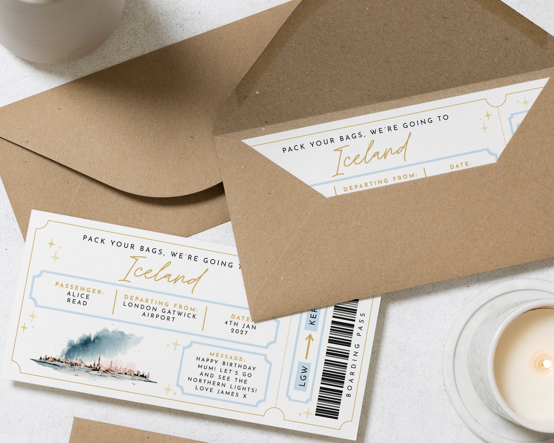 Personalised Holiday Reveal Ticket, Iceland Gift Voucher, Birthday Travel Boarding Pass, Custom Trip Announcement for Mum
