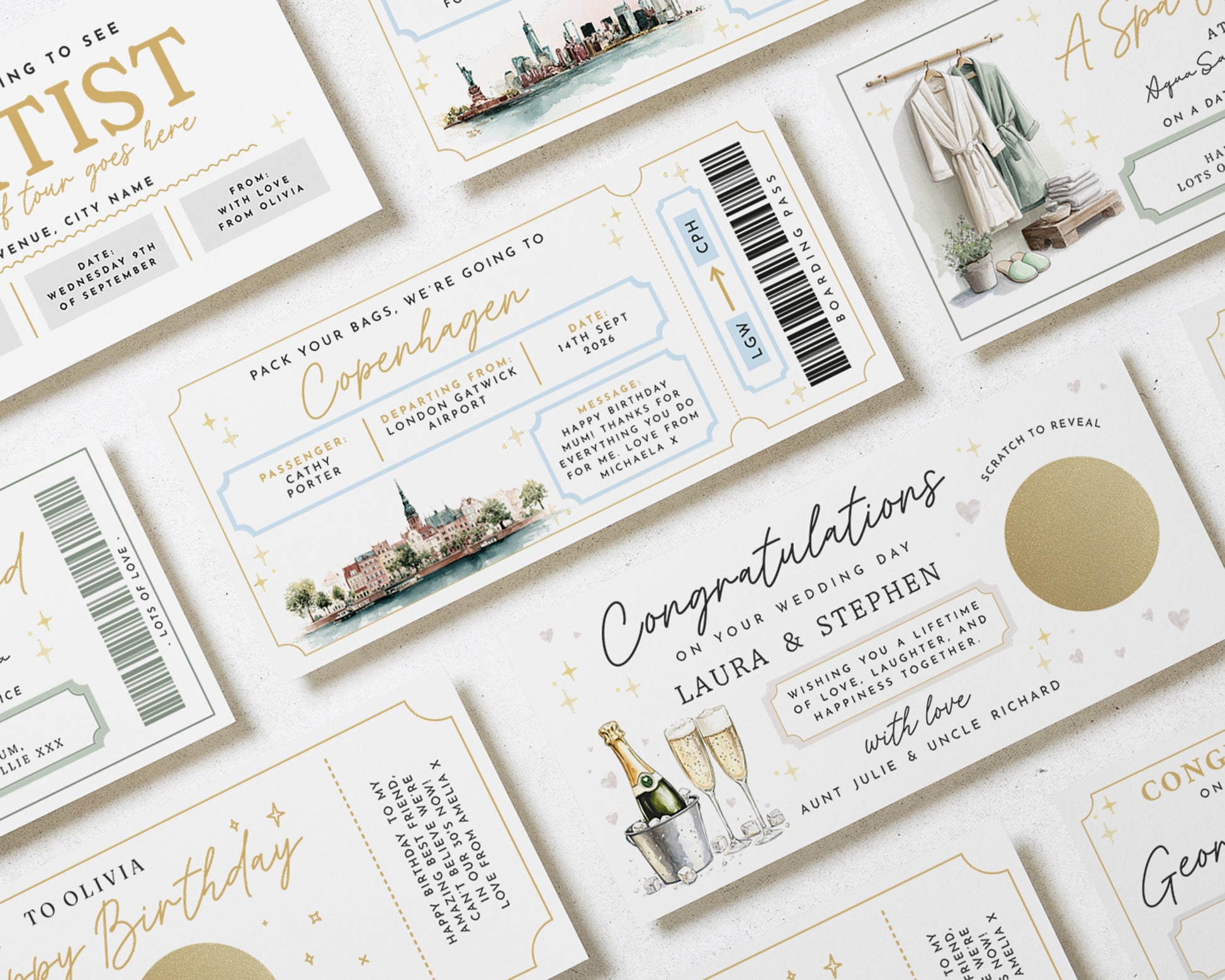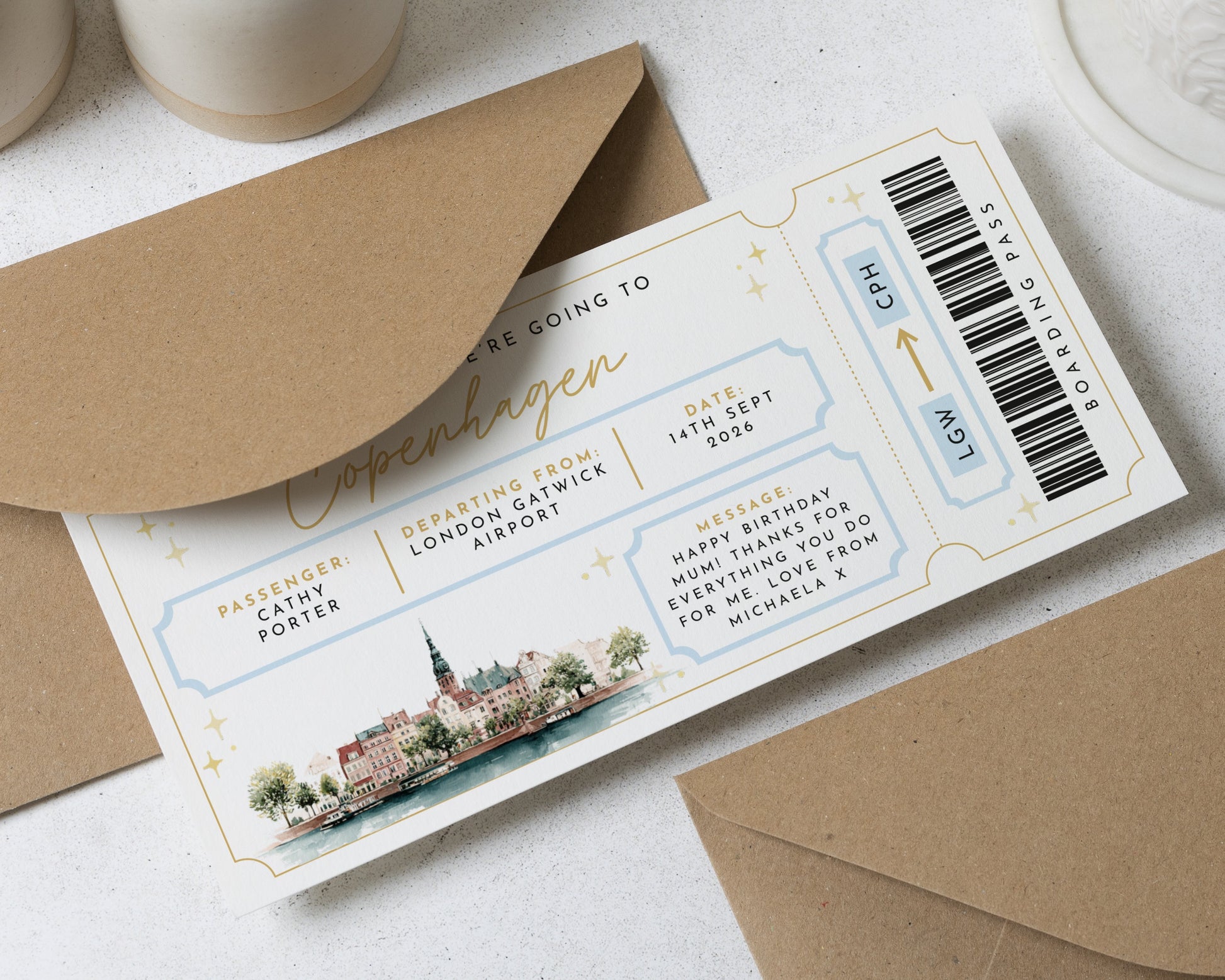 Surprise someone special with a personalised holiday reveal ticket designed as a beautiful boarding pass! Perfect for gifting a weekend away or birthday trip.