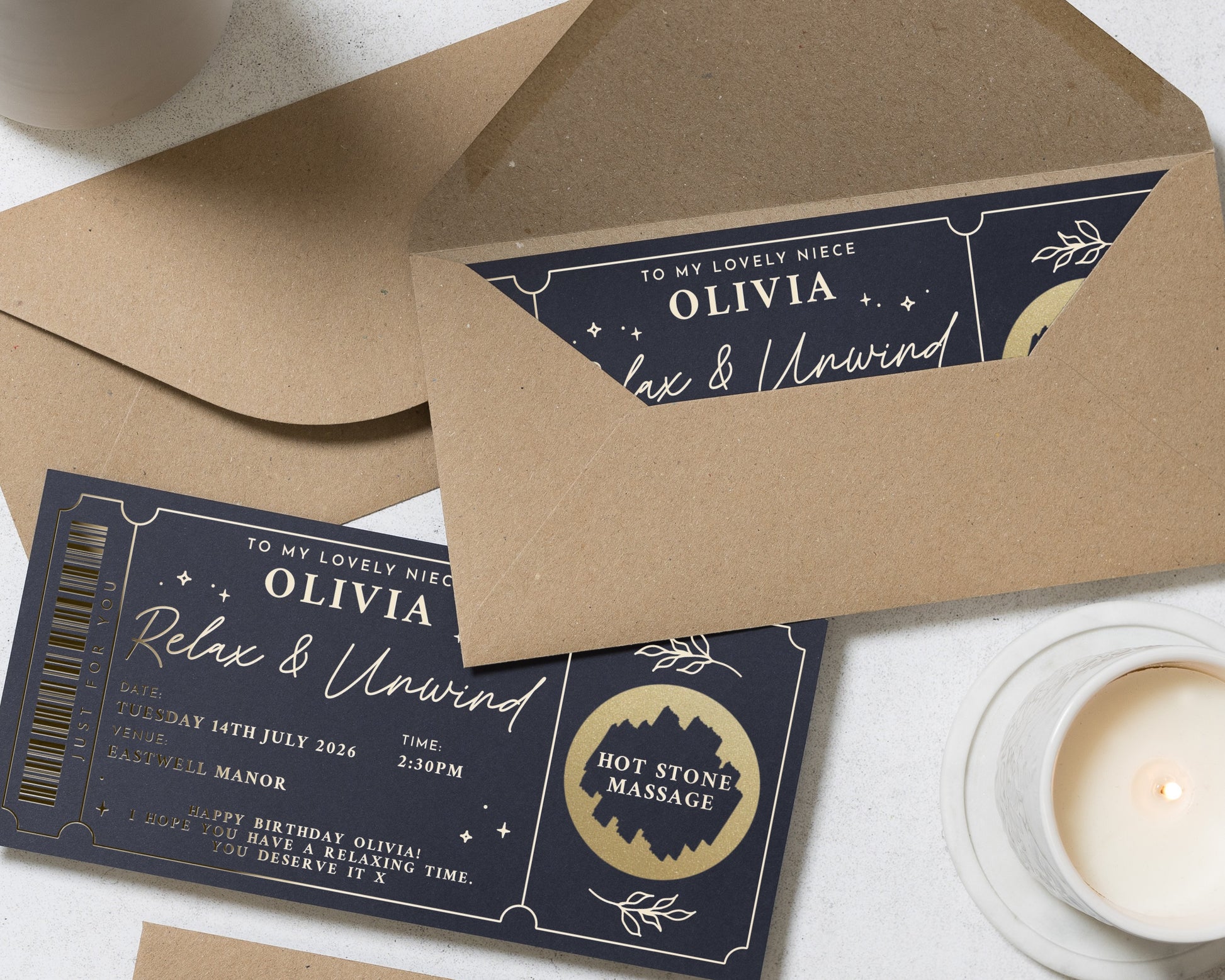 • Each voucher card measures 210x99mm, and is printed on heavyweight premium cardstock and finished with real gold foil detailing for a luxurious touch.