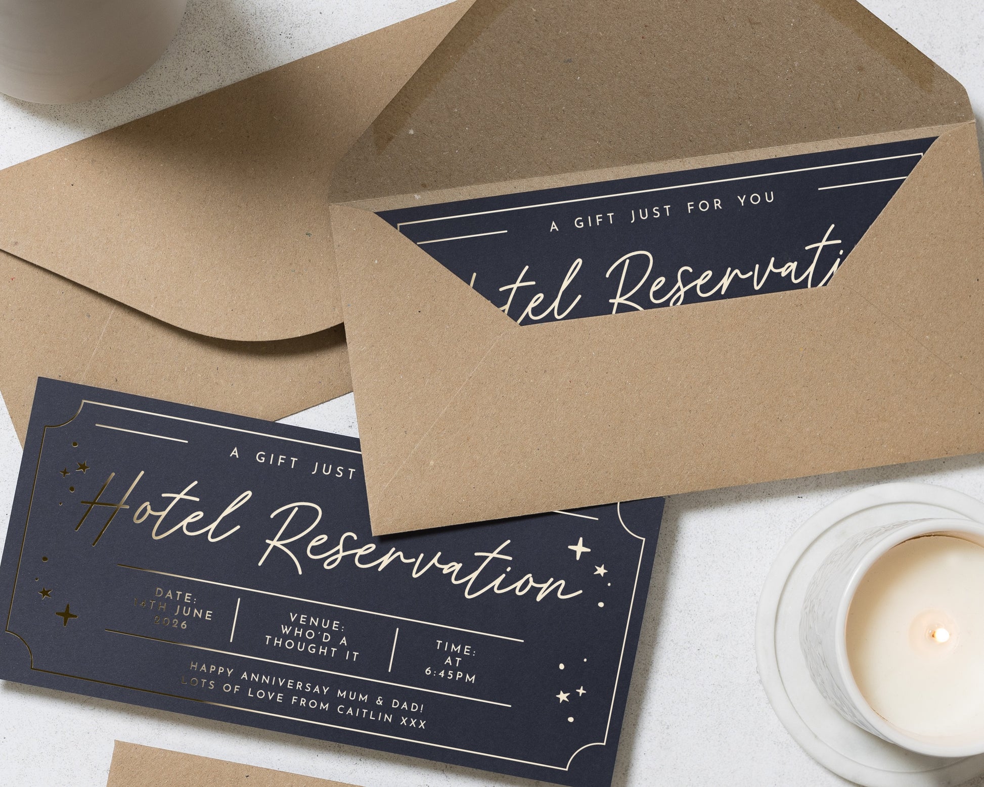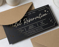 Surprise someone special with this personalised hotel reservation gift voucher. Featuring elegant gold foil on a navy background, it's the perfect way to reveal an anniversary getaway or special hotel stay for Mum and Dad.