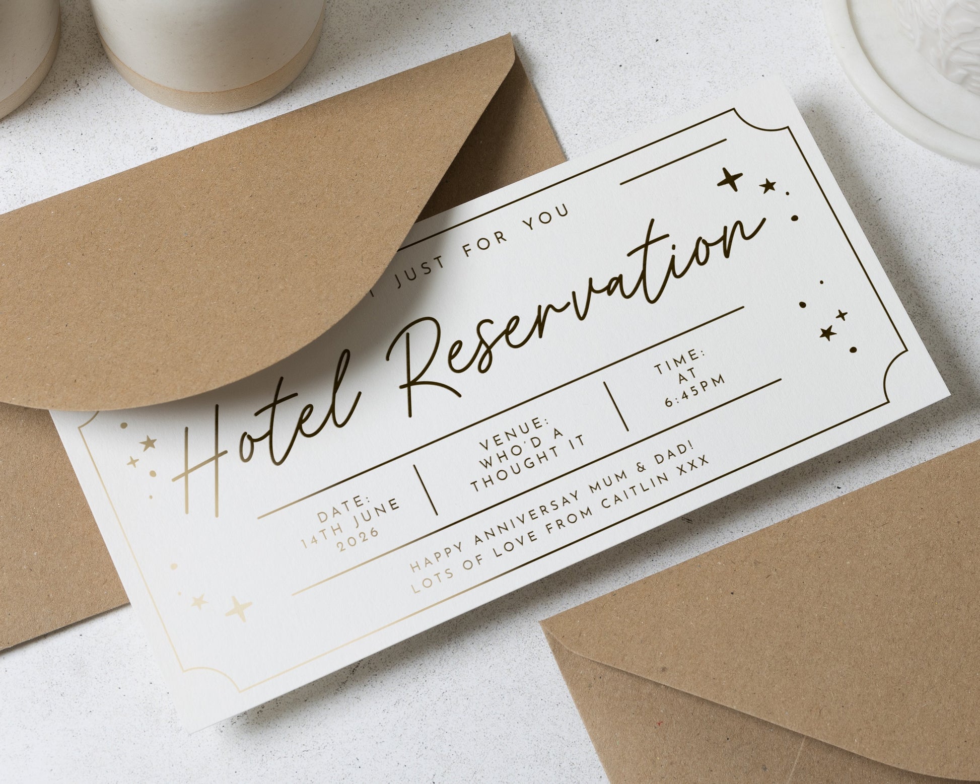 Personalised Hotel Reservation Gift Voucher, Anniversary Gift, Gold Foil, Custom Hotel Stay, Gift For Mum And Dad