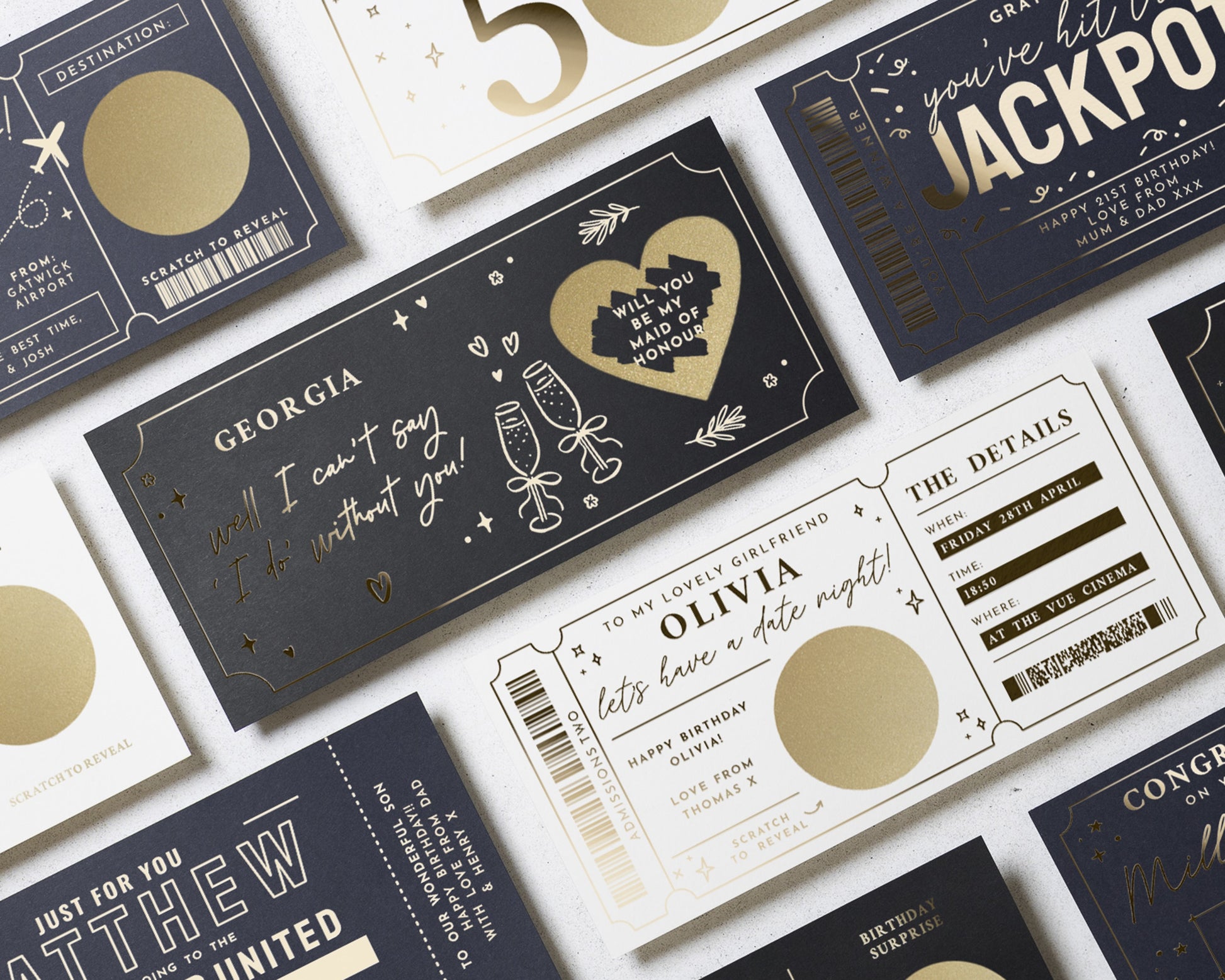 • Each voucher card measures 210x99mm, and is printed on heavyweight premium cardstock and finished with real gold foil detailing for a luxurious touch.