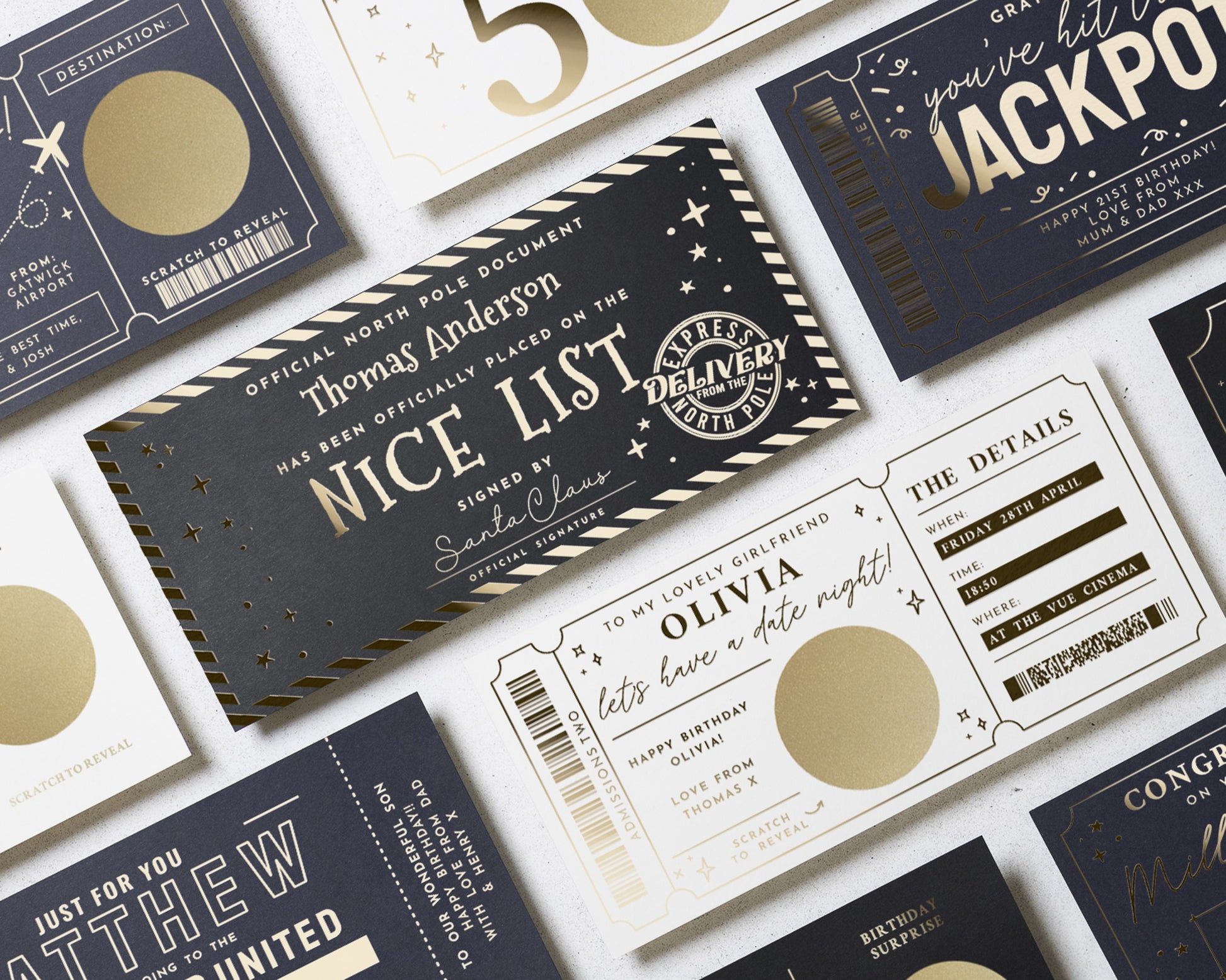 • Each voucher card measures 210x99mm, and is printed on heavyweight premium cardstock and finished with real gold foil detailing for a luxurious touch.