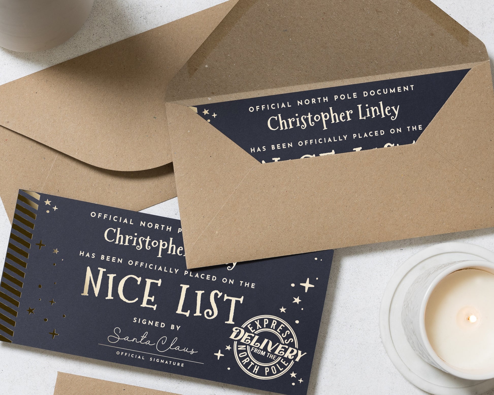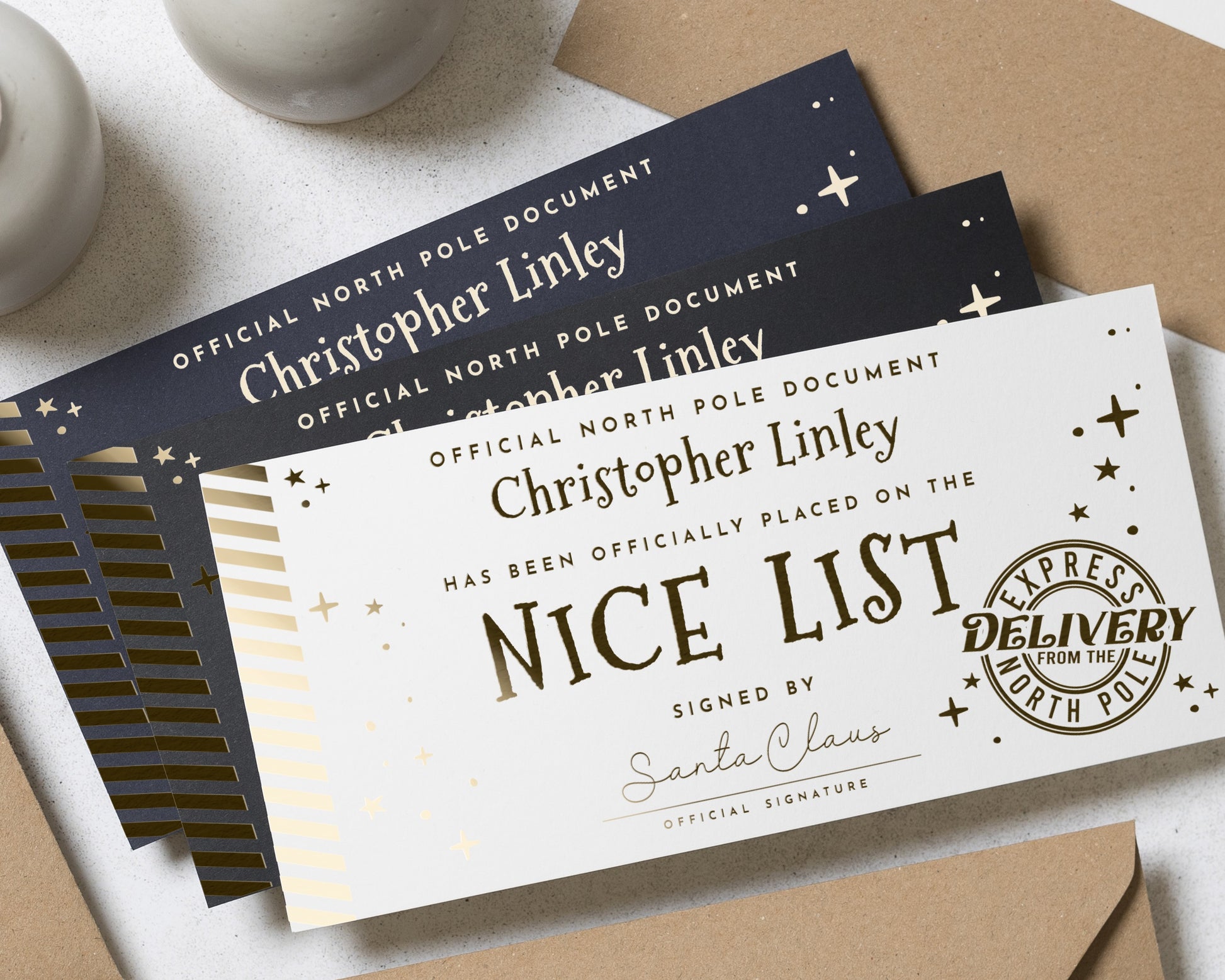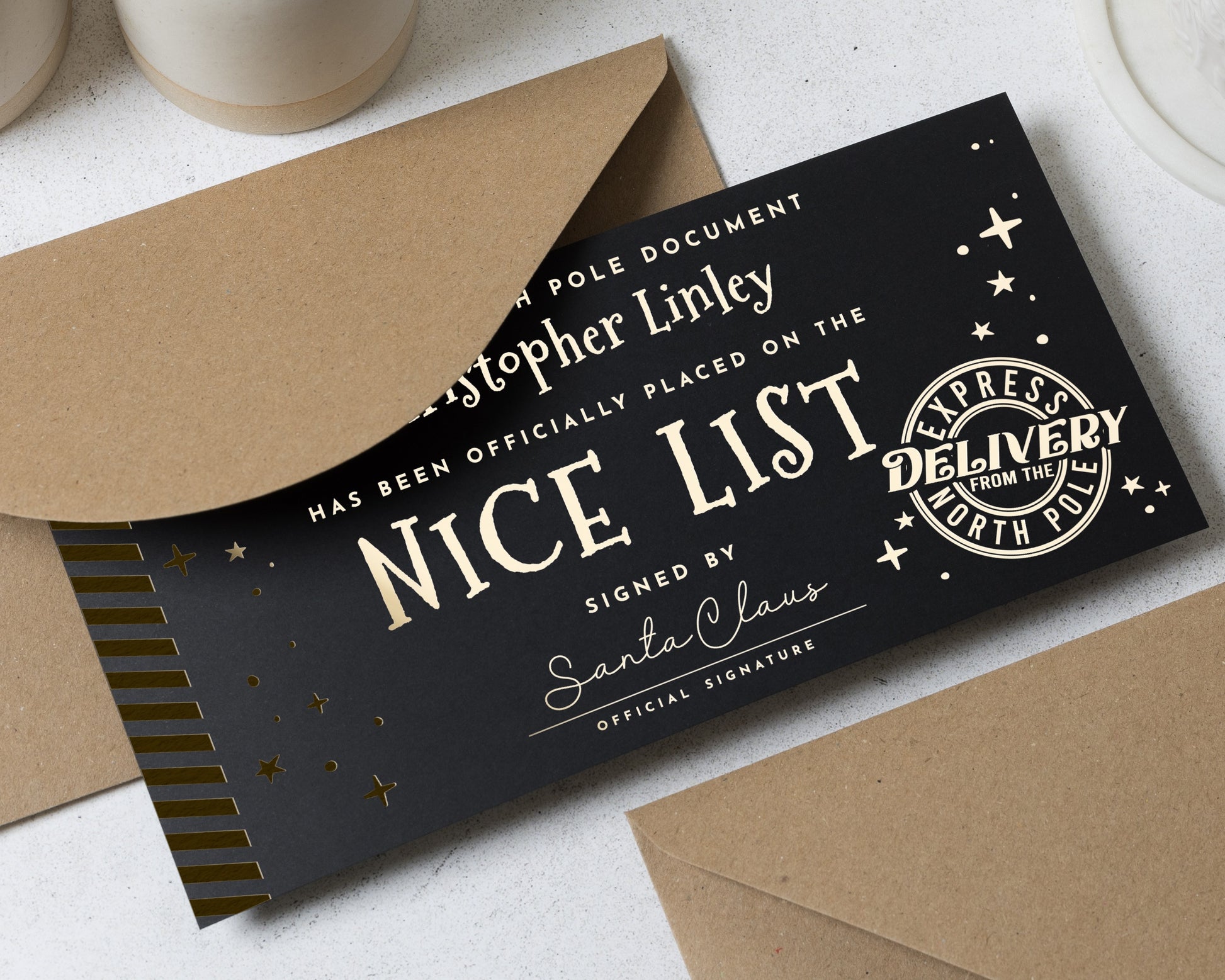 Celebrate Christmas with a personalised Nice List certificate, featuring gold foil on a black background. Officially signed by Santa Claus, this unique North Pole gift voucher is perfect for children and adds festive magic to your holiday gifting.