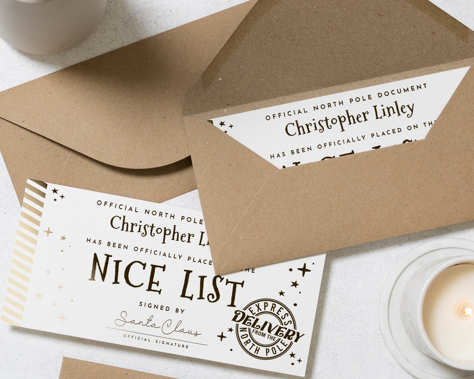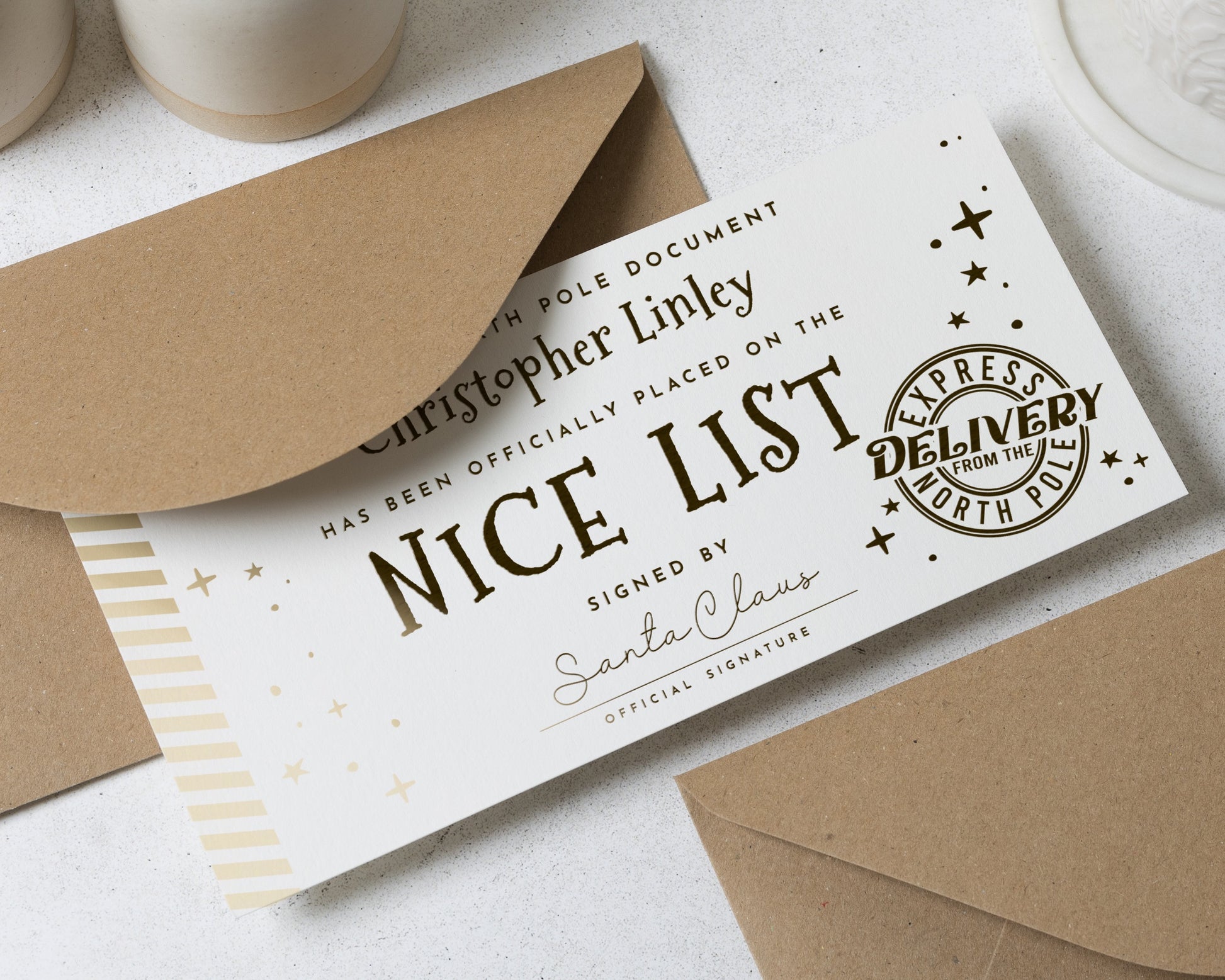 Personalised Nice List Certificate, North Pole Gift Voucher, Christmas Gift, Gold Foil, Official Santa Certificate, For Kids