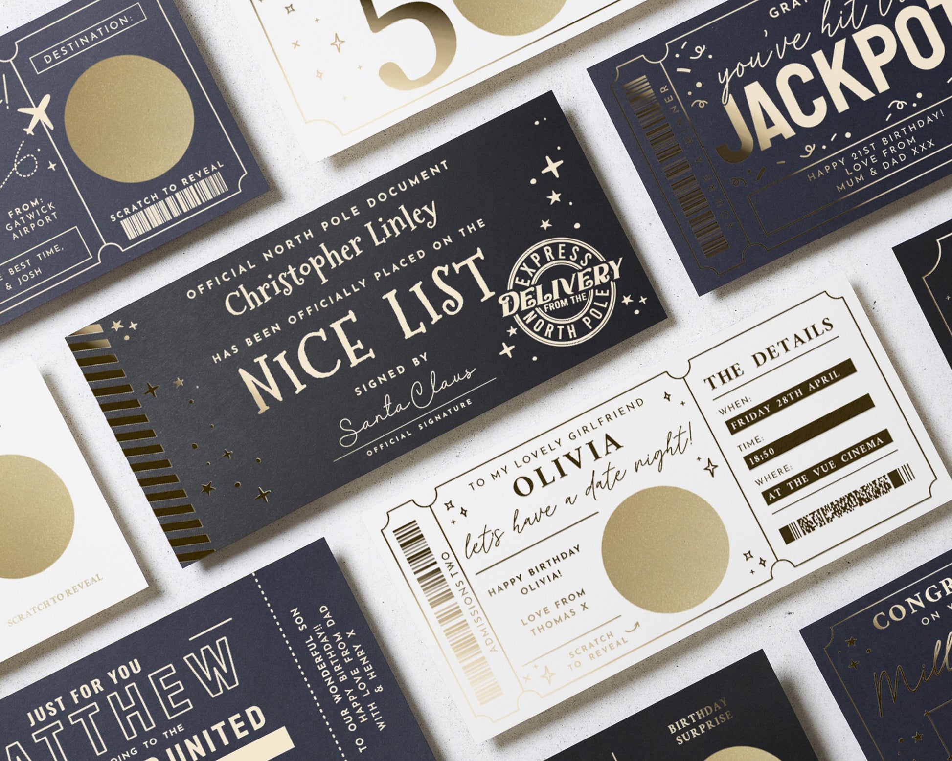 • Each voucher card measures 210x99mm, and is printed on heavyweight premium cardstock and finished with real gold foil detailing for a luxurious touch.