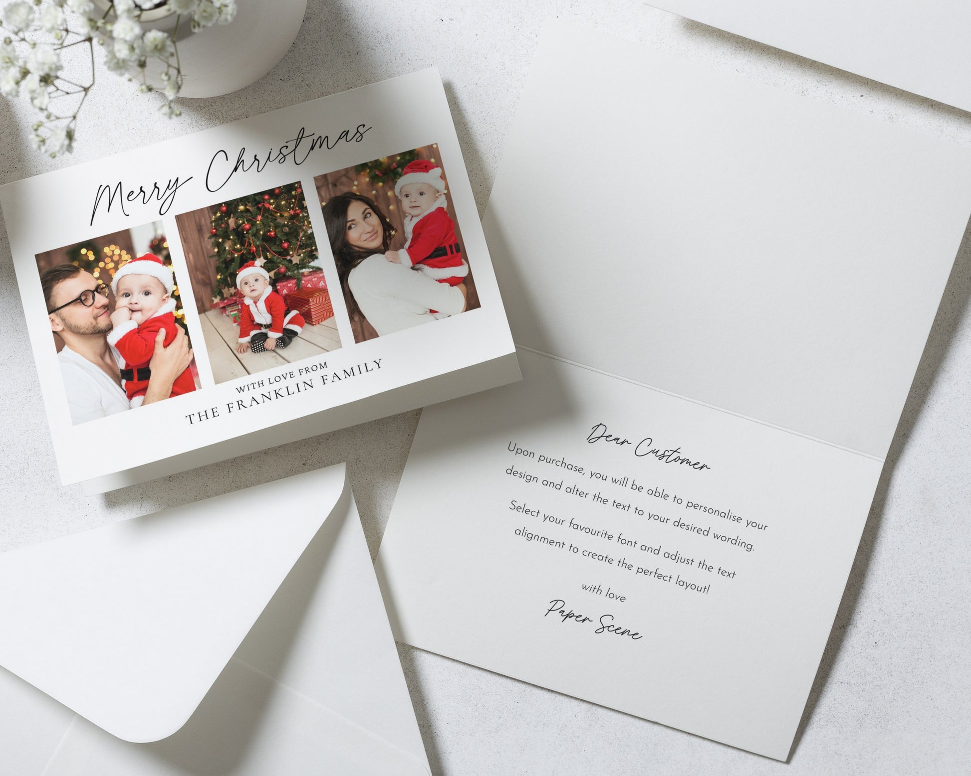 Share your favourite family moments with this personalised photo Christmas card, featuring three custom images and your family name for a heartfelt touch.