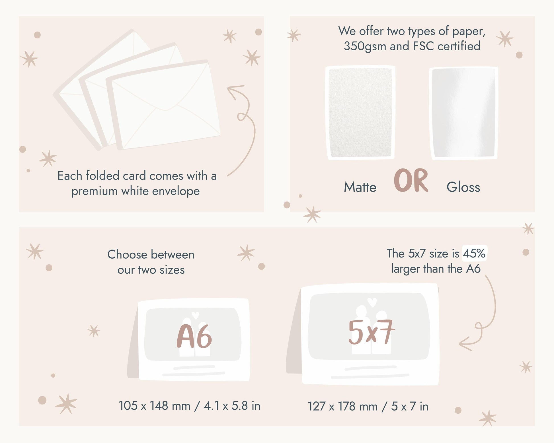Choose from two classic folded greeting card sizes — perfect for your personalised message and photos: