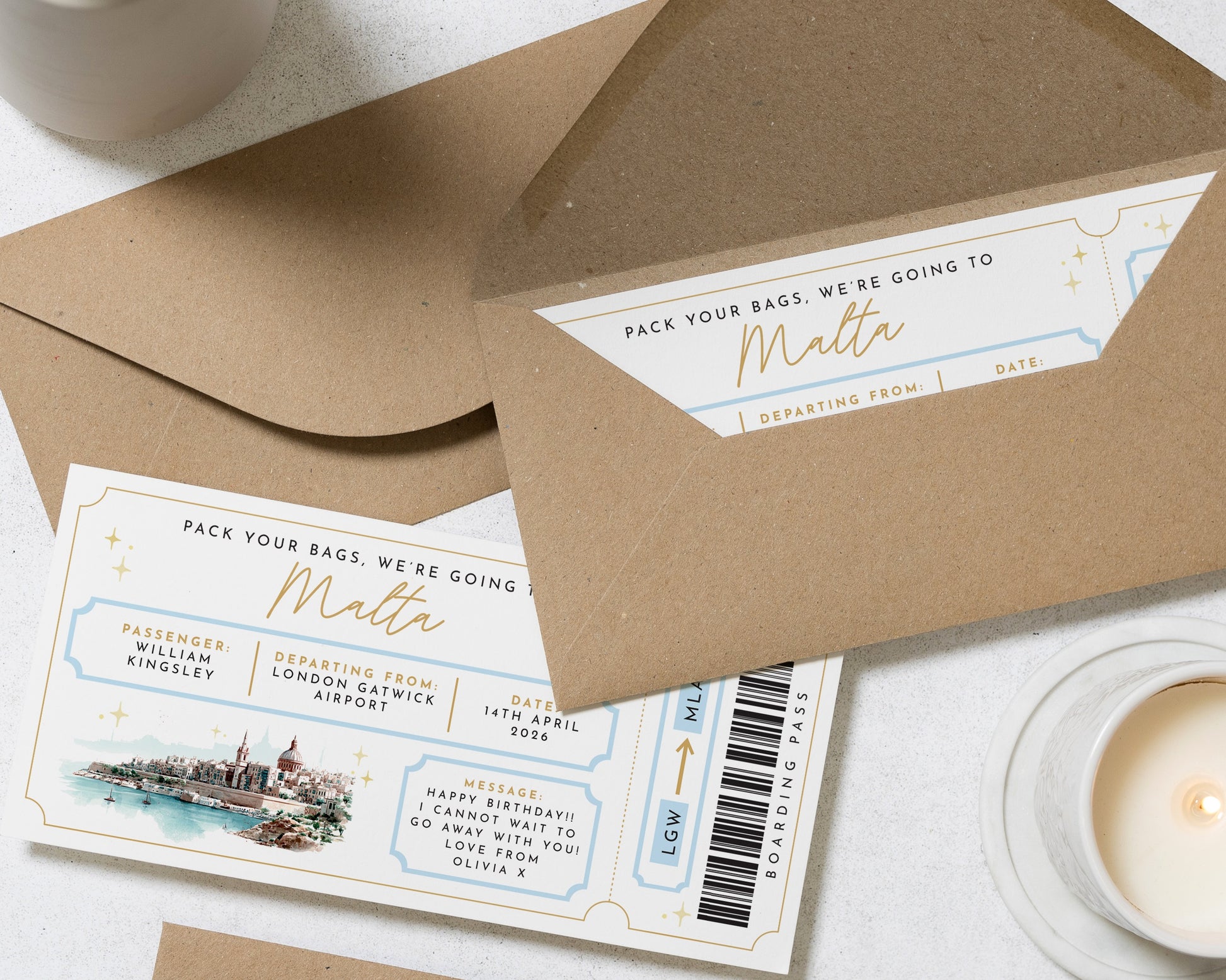 Surprise a loved one with this personalised ‘Pack Your Bags’ holiday reveal gift voucher. Styled as a boarding pass, it’s perfect for birthdays, getaways, and memorable experiences.