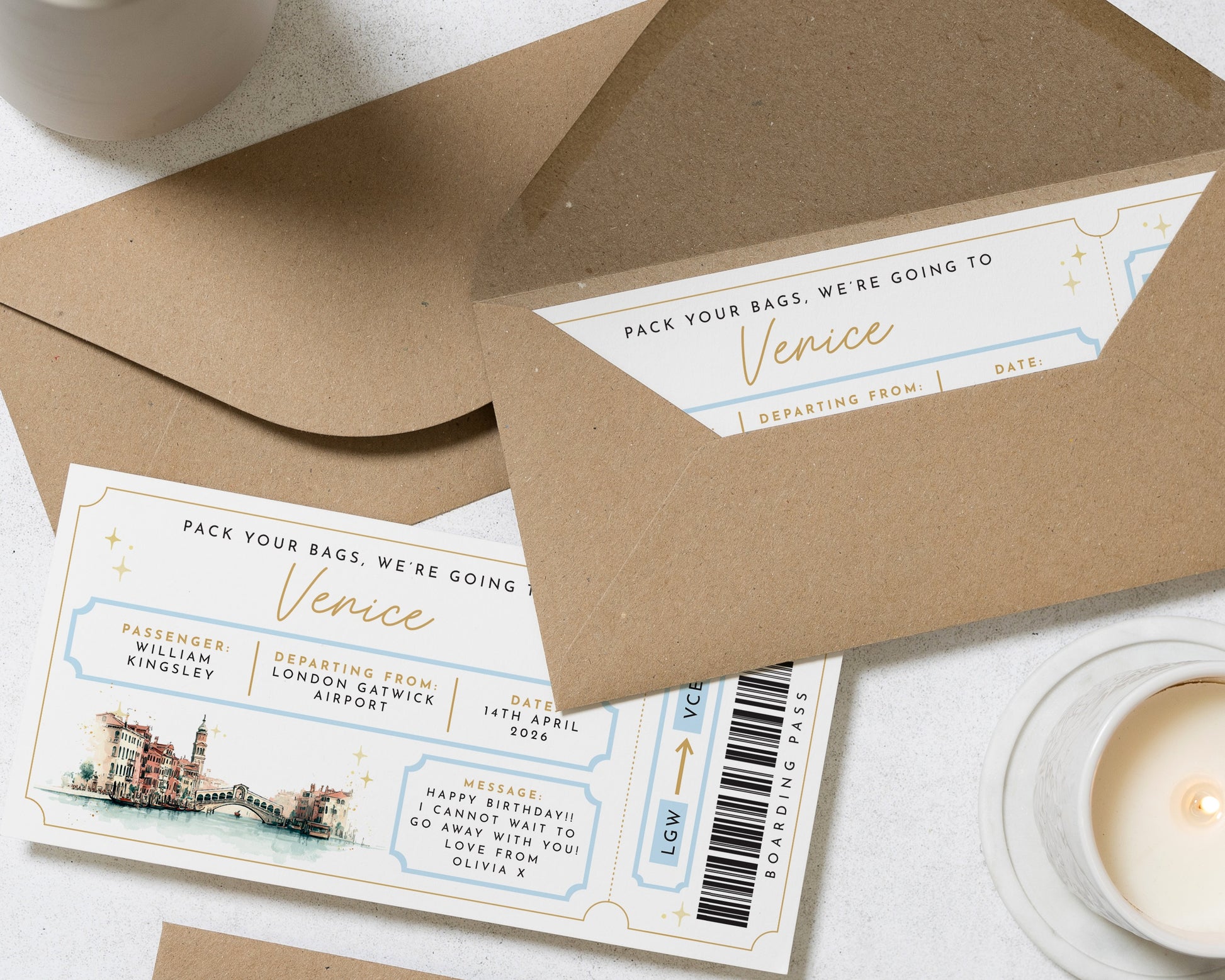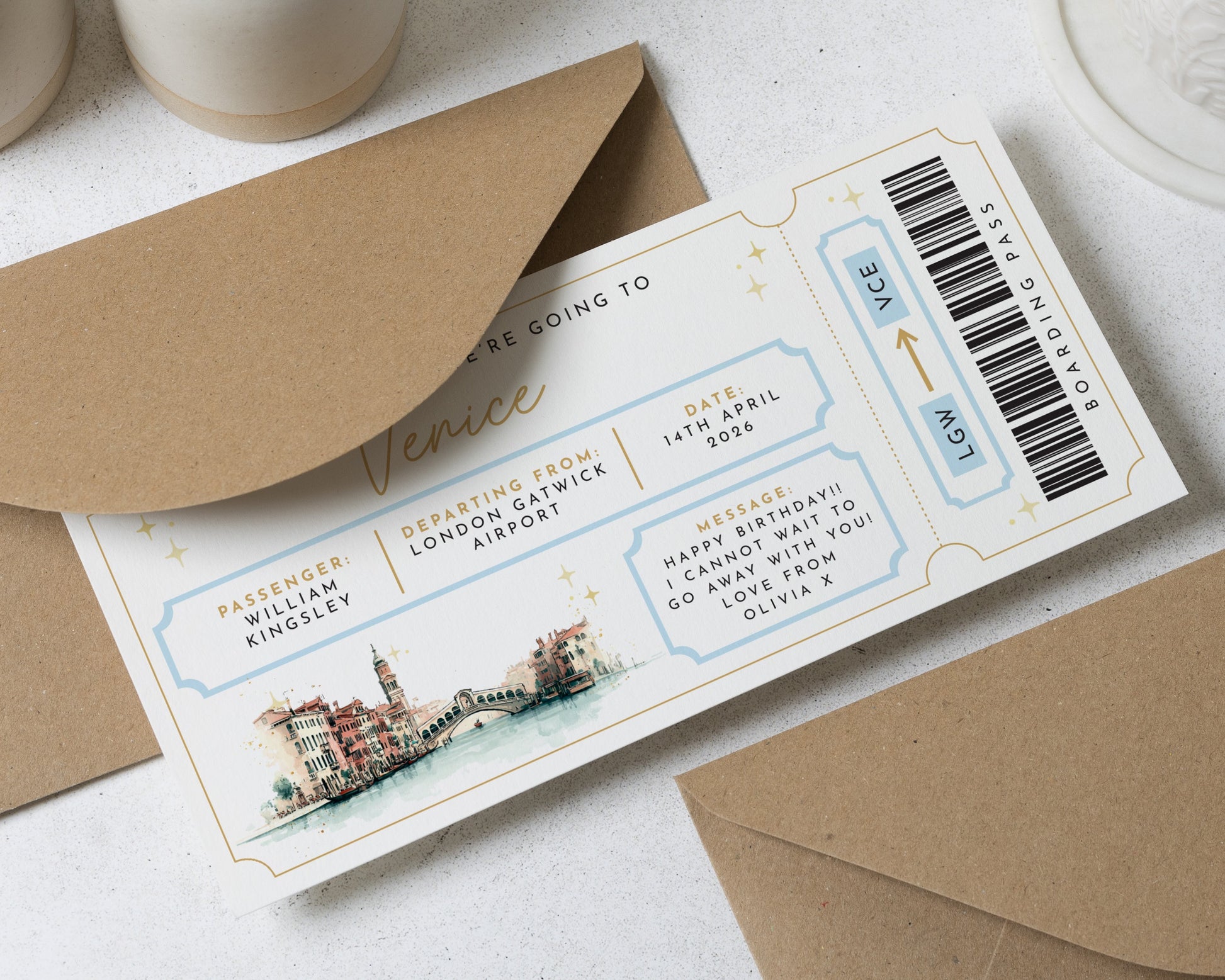 Surprise a loved one with this personalised boarding pass voucher. Perfect for revealing a Venice getaway, this custom ticket makes birthdays unforgettable.