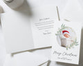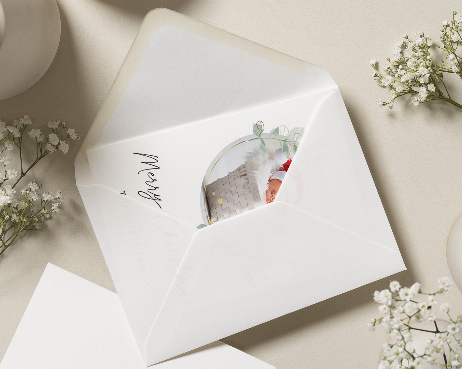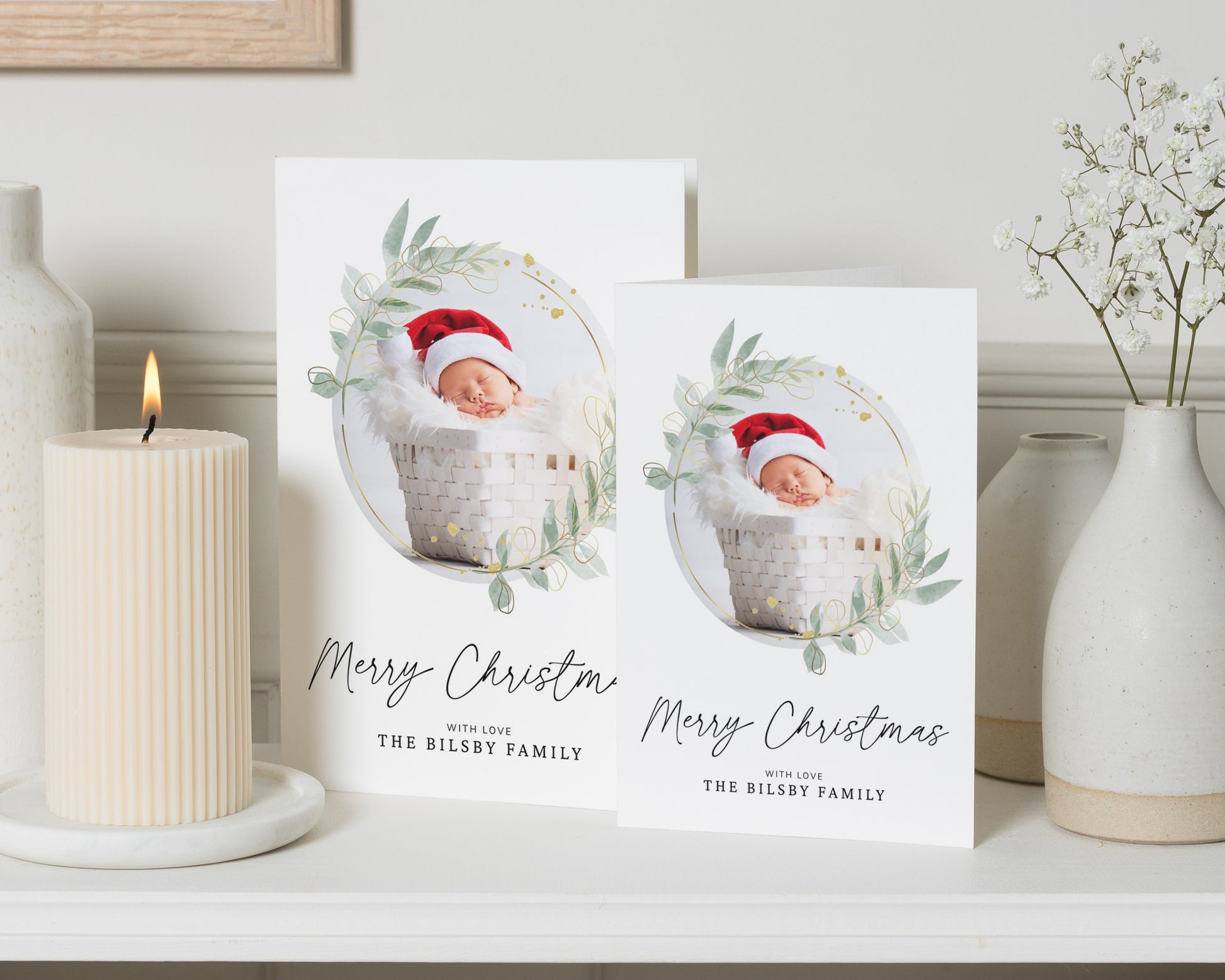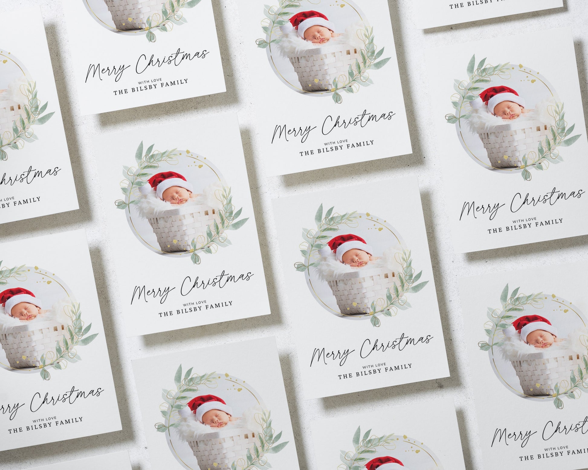 Celebrate your little one's first Christmas with this personalised photo card, featuring a sweet baby in a festive basket and elegant greenery details.