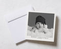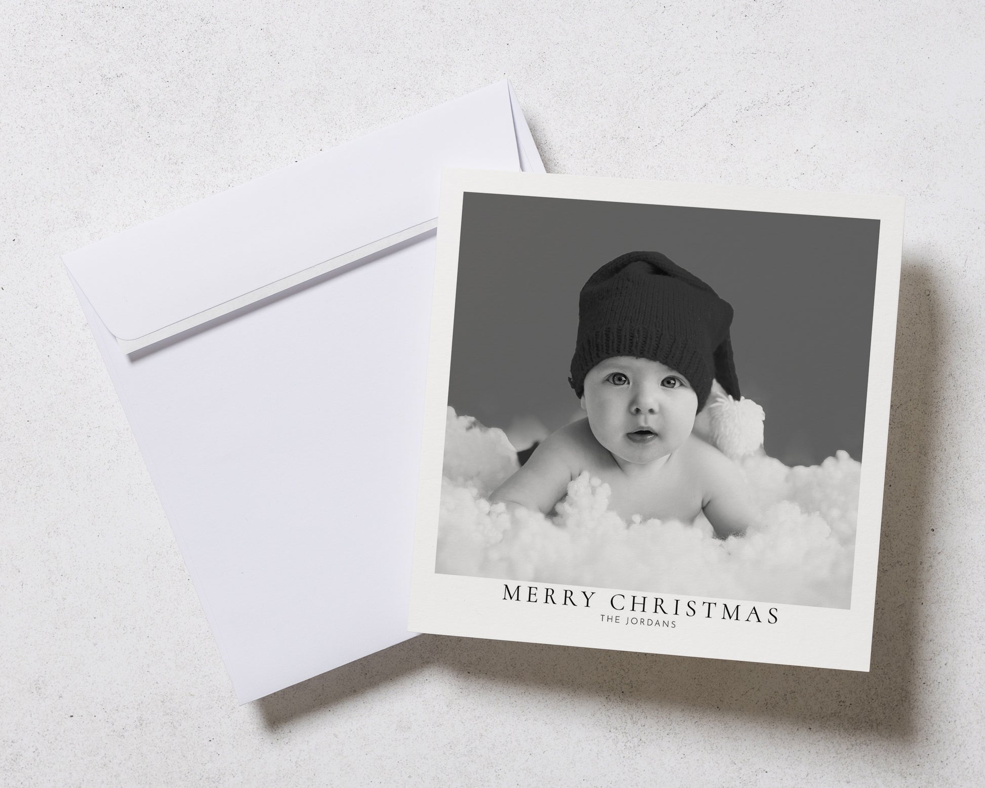 Celebrate the season with this personalised photo Christmas card, featuring your own image and family name. The square design adds a modern touch.