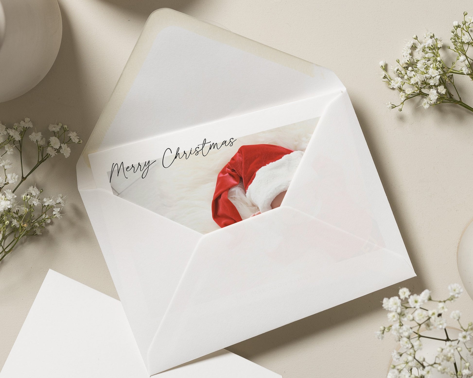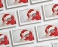Share festive joy with this personalised photo Christmas card featuring your baby's photo in a Santa outfit. A charming way to send family greetings.