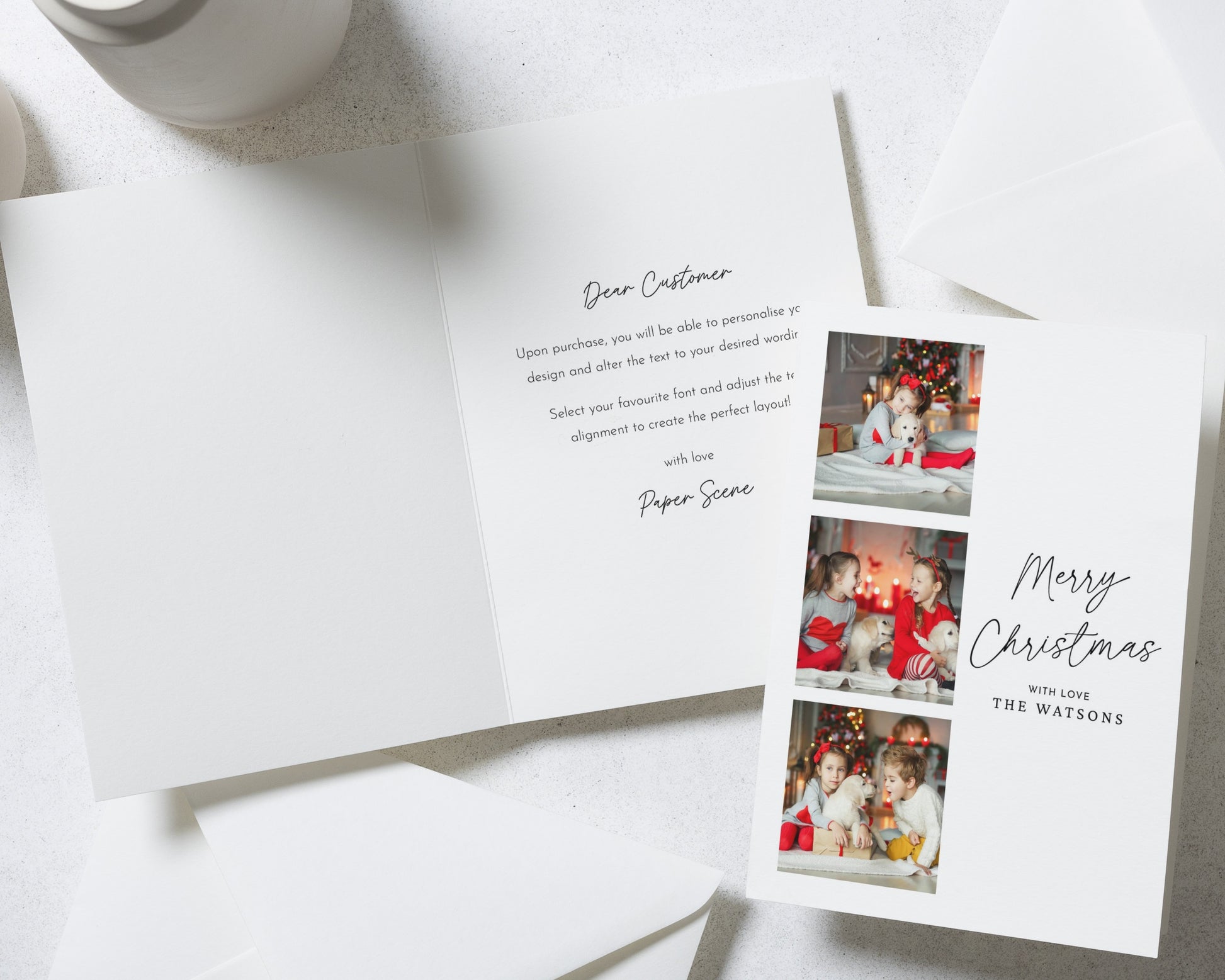 Showcase your favourite family moments with this personalised photo Christmas card featuring three photo slots and your custom family name.