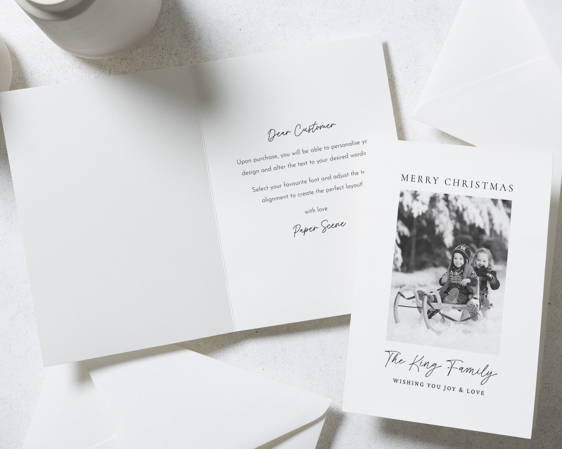 Send festive wishes with this elegant personalised photo Christmas card. Featuring your family photo and custom text, it's perfect for sharing joy and love.