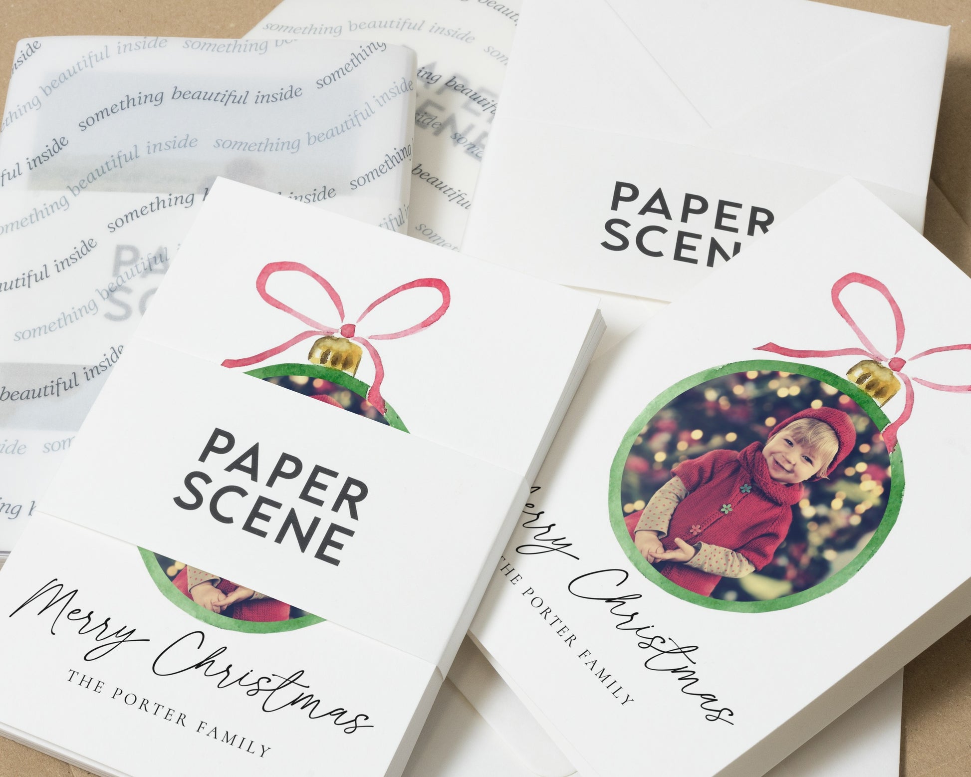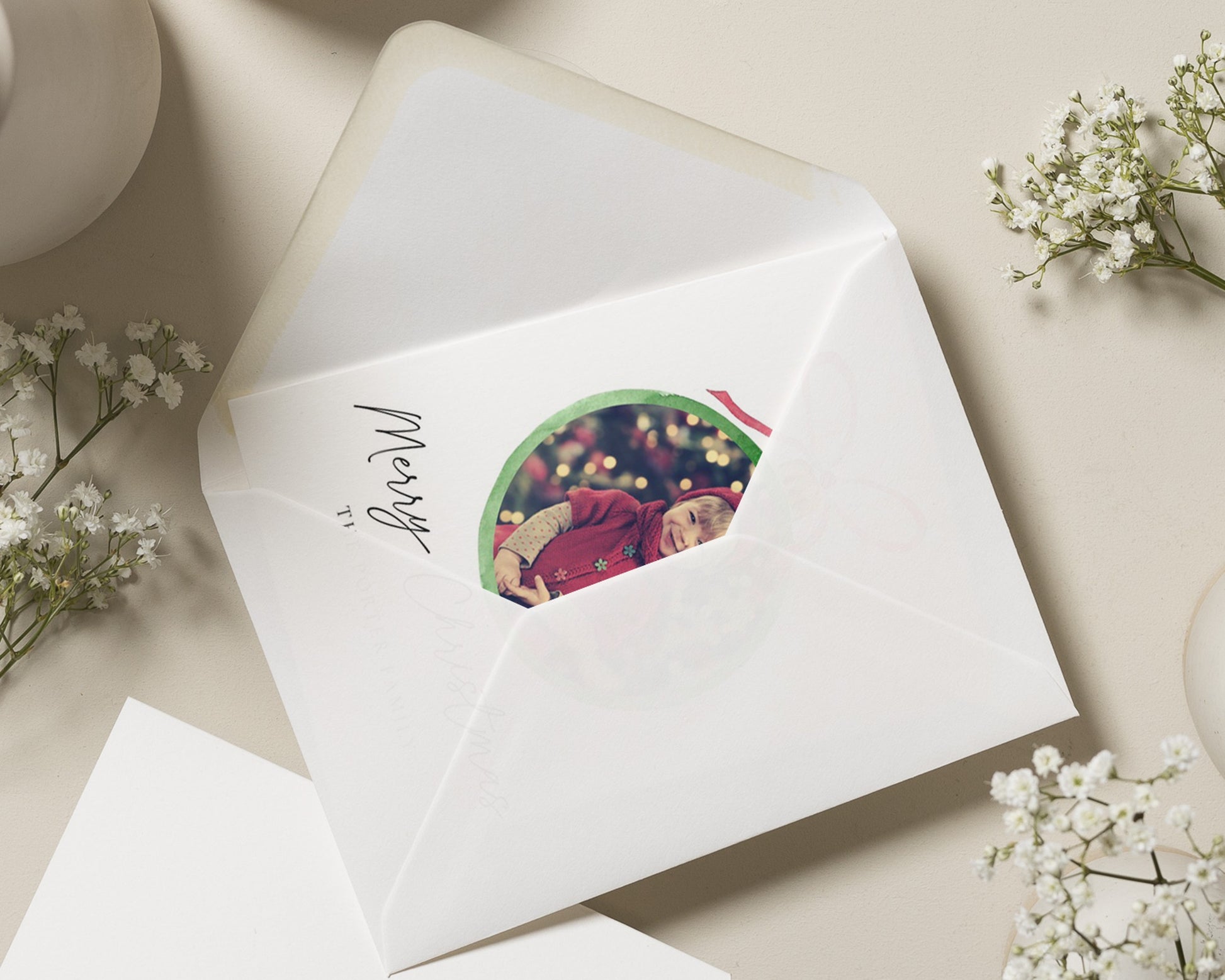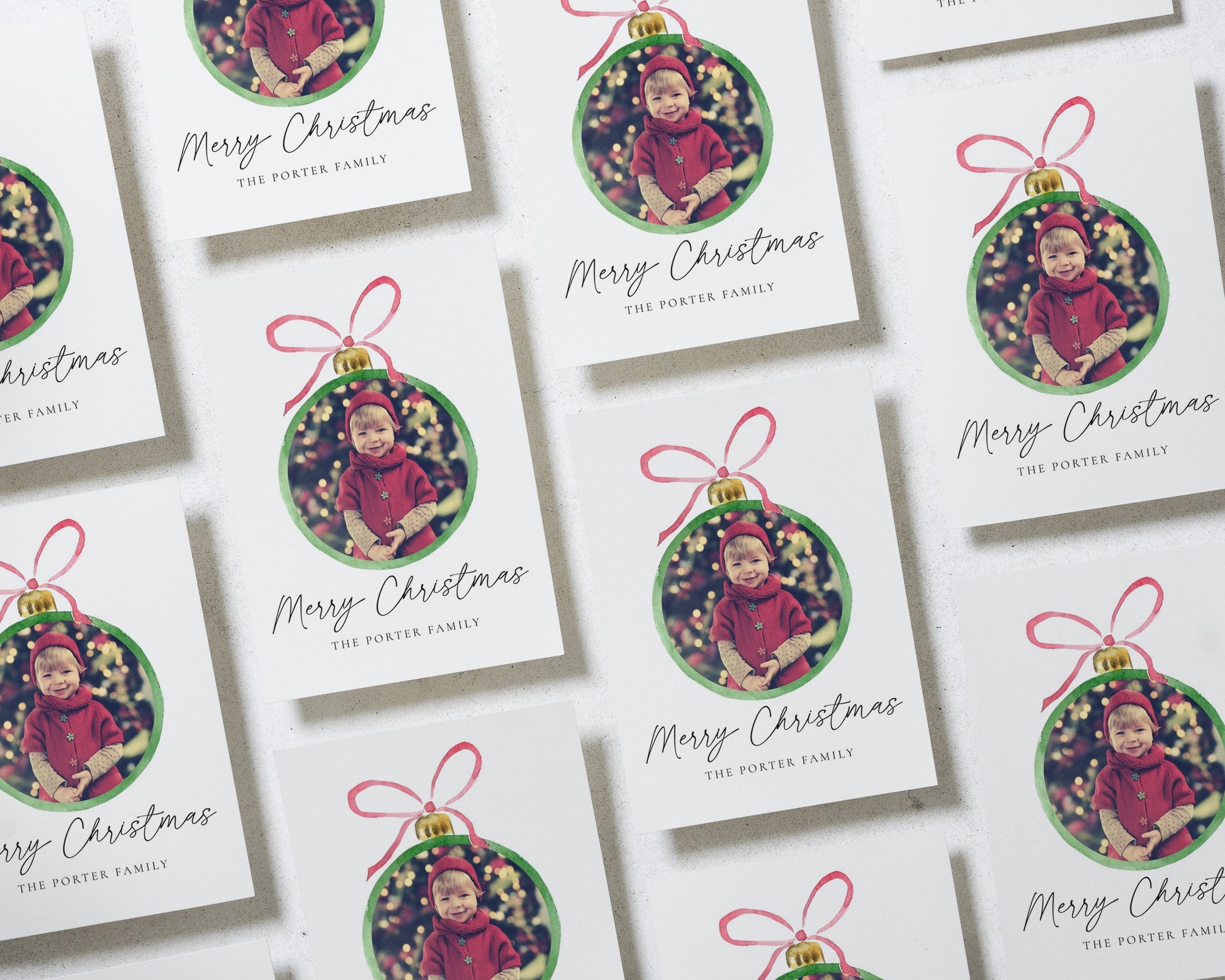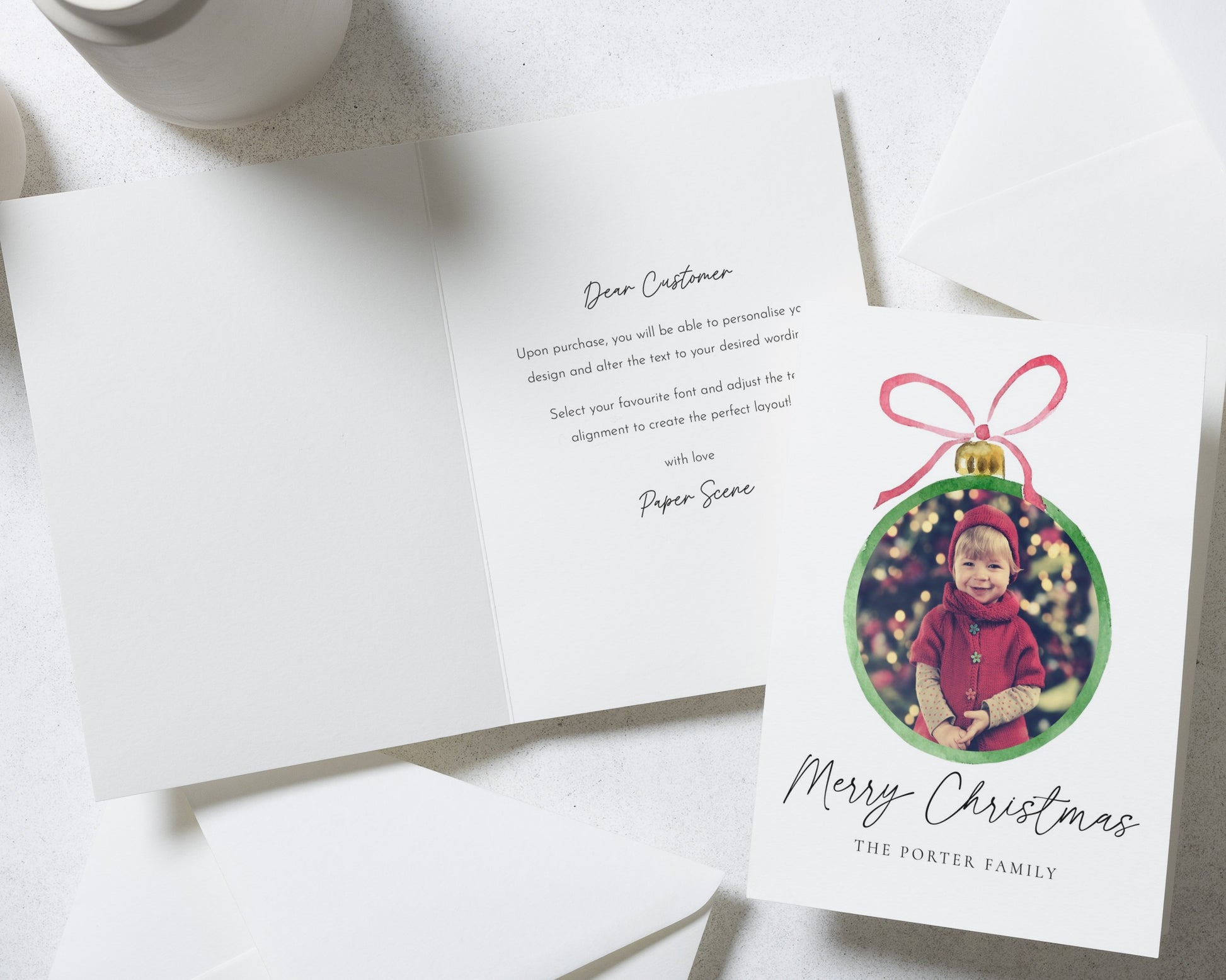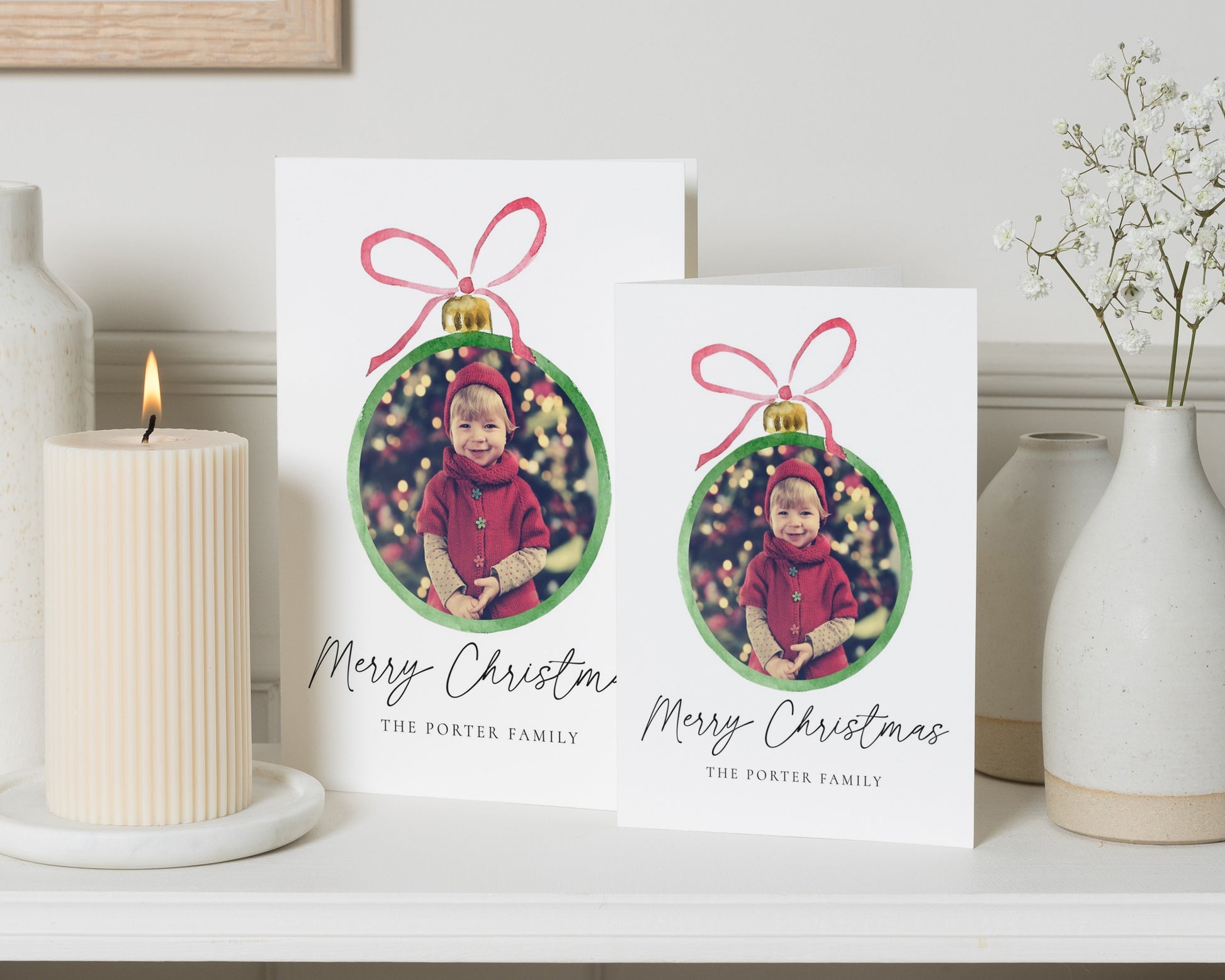 Celebrate the season with this personalised photo Christmas card featuring your favourite family photo in a festive bauble design. Perfect for sharing holiday cheer.