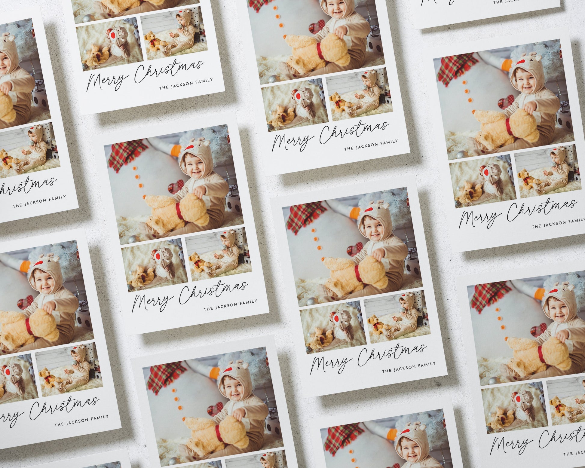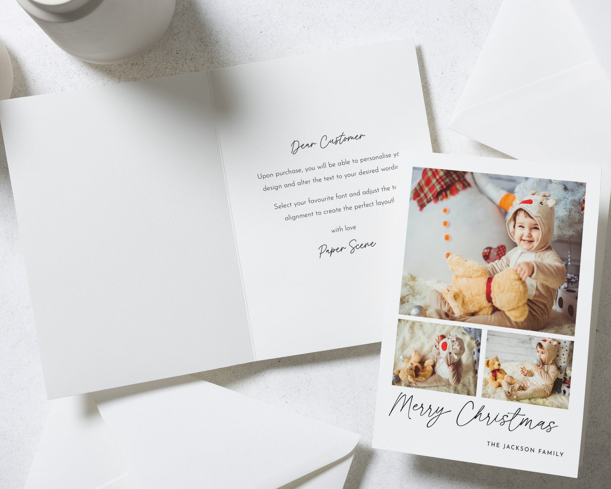 Showcase your favourite festive moments with this personalised photo Christmas card, featuring space for three photos and your family name. A modern, elegant design perfect for sharing holiday cheer.
